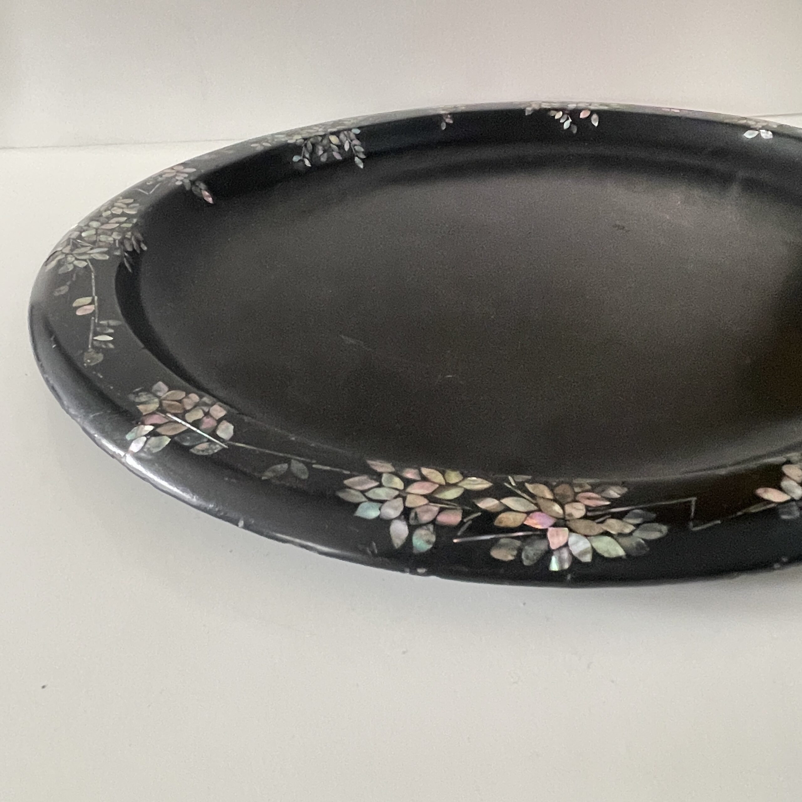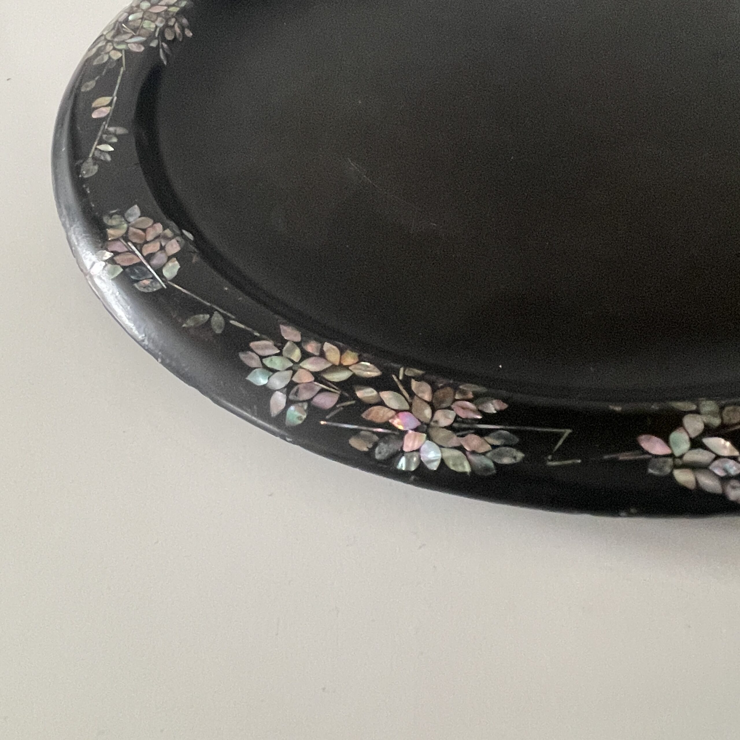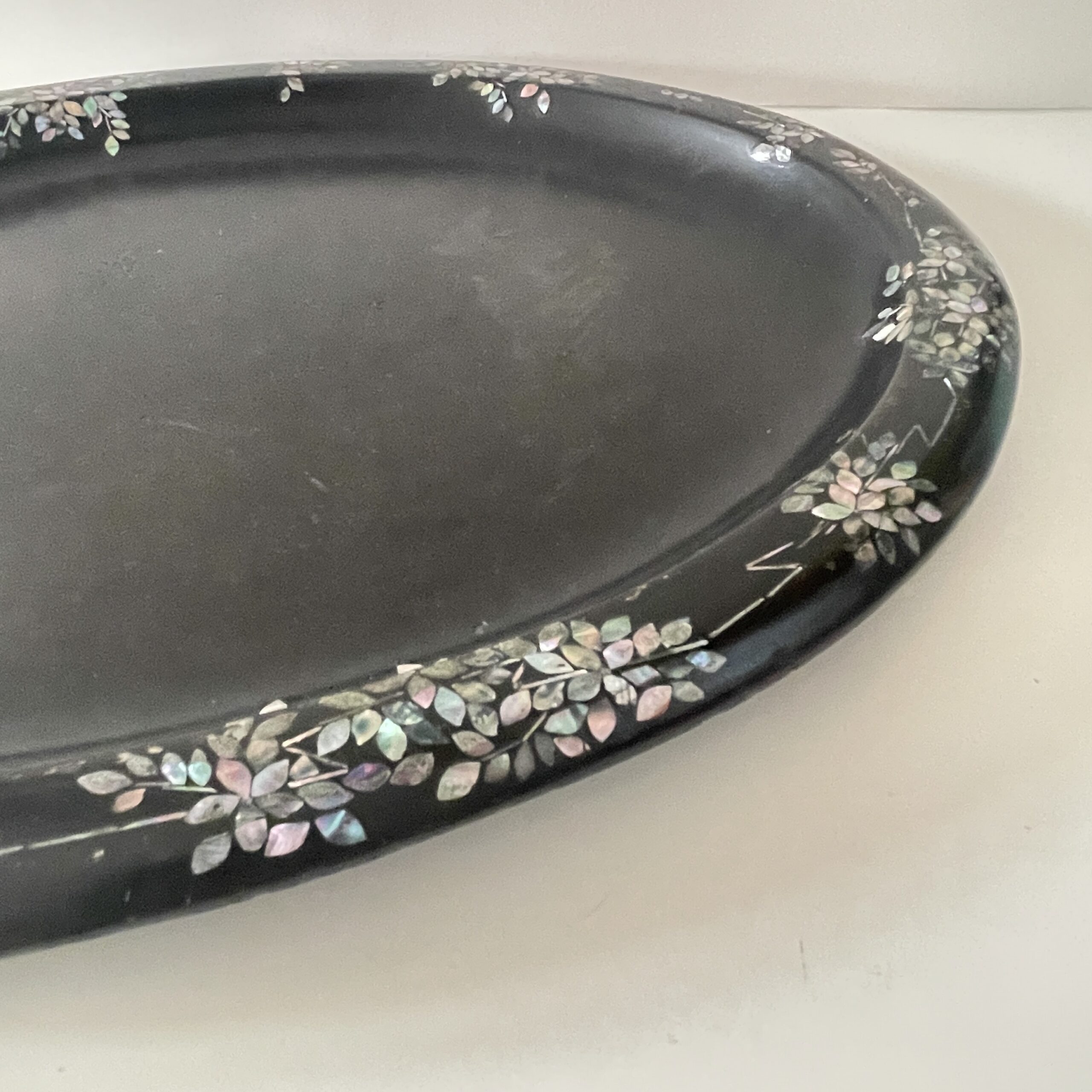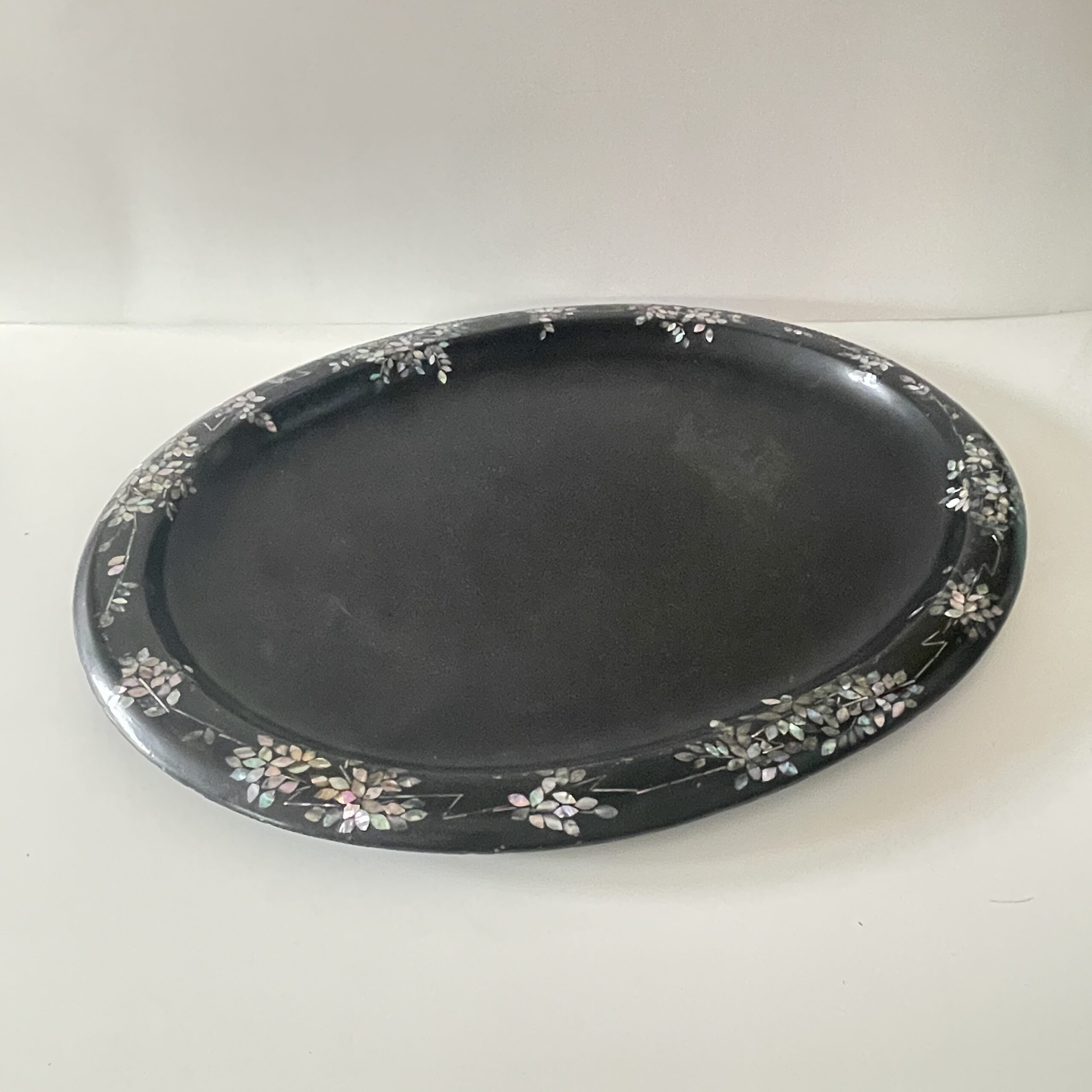 Een antiek dienblad van zwart metaal met een rand van parelmoer bewerkingen. Mooi gemaakt!