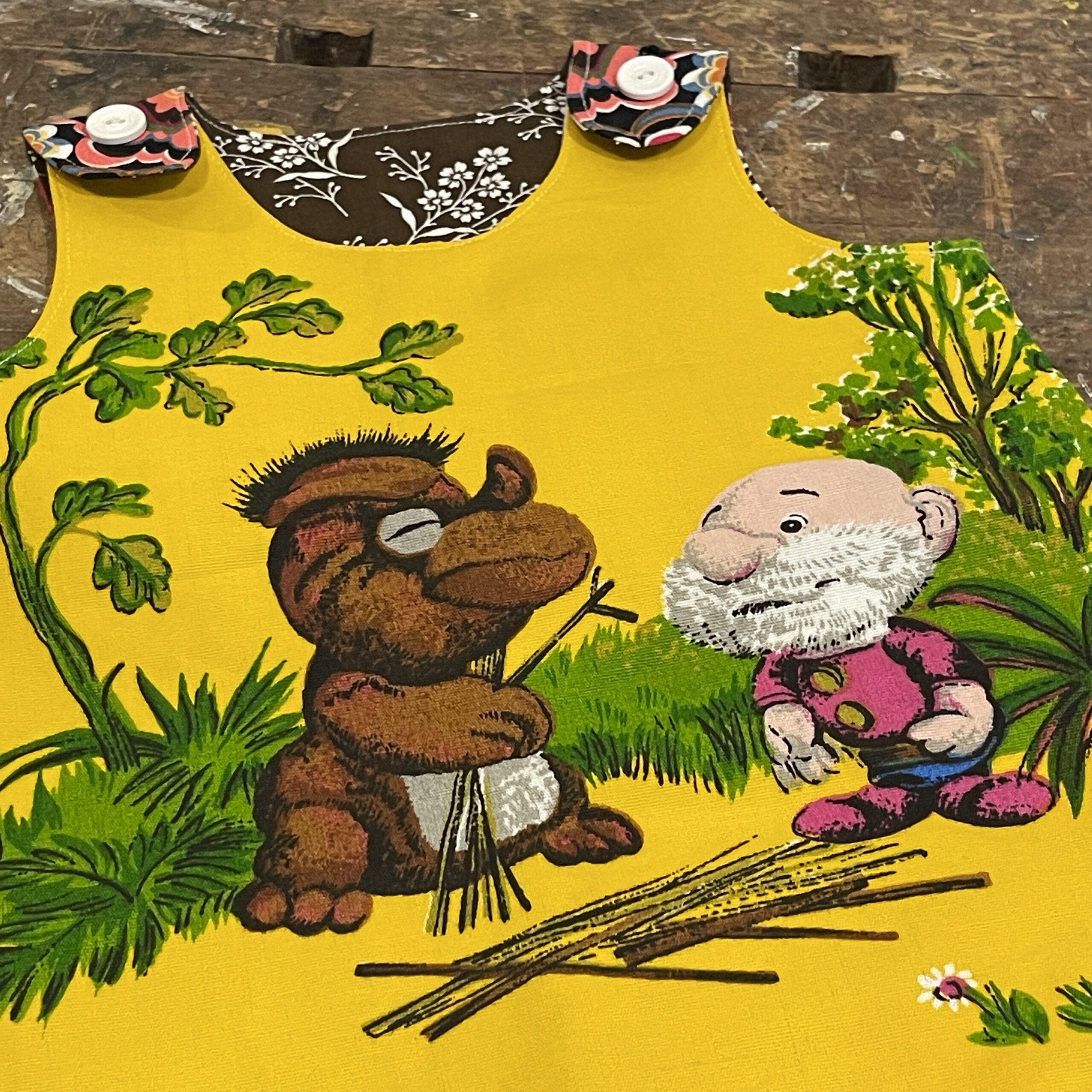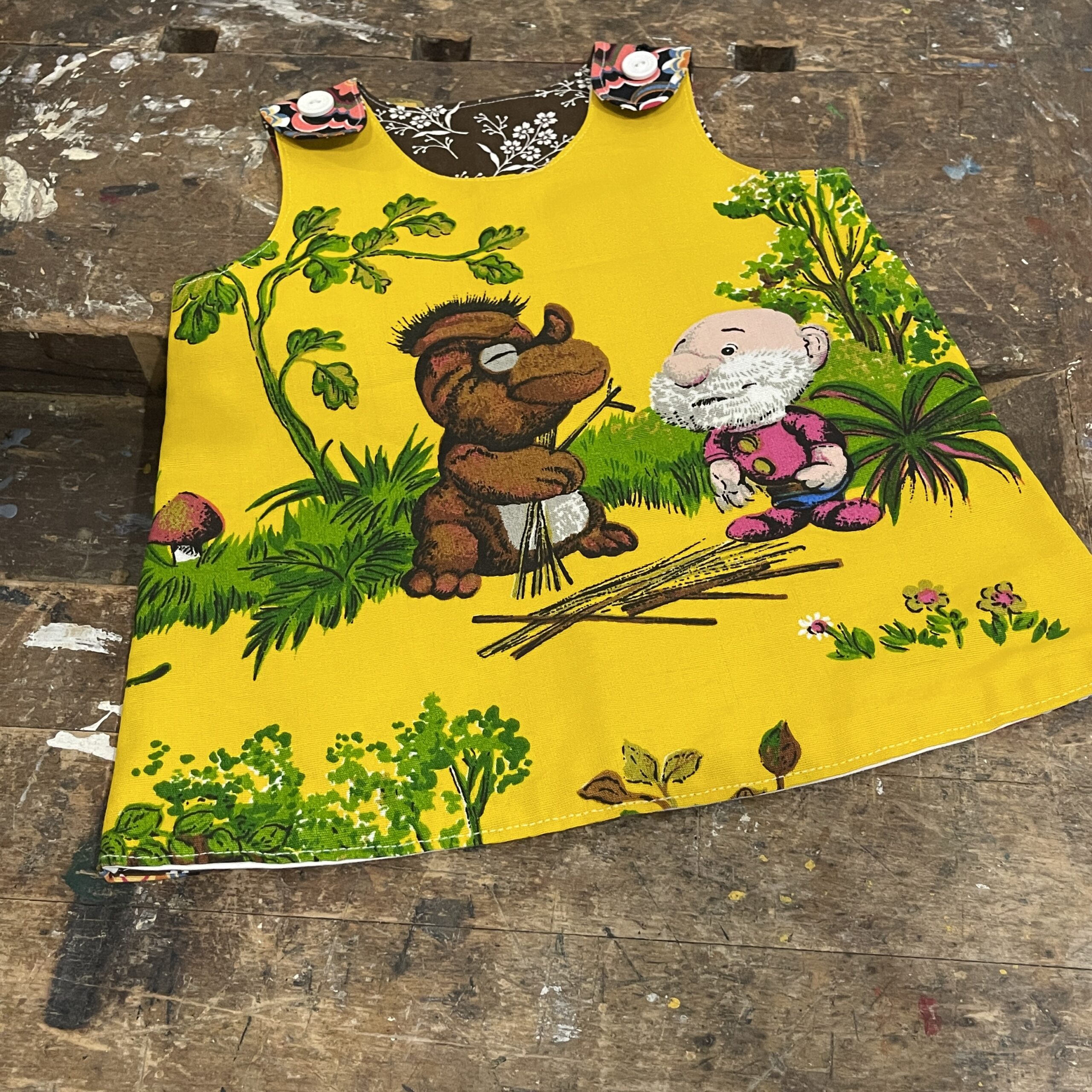 Dit allerliefste babyjurkje is gemaakt van vintage stoffen, in dit geval met Paulus de Boskabouter in de hoofdrol! Als je zelf in de jaren 70 / 80 geboren en opgegroeid bent, dan is Paulus de Boskabouter jouw ding natuurlijk. Maar ook al je jonger bent en gewoon houdt van retro.