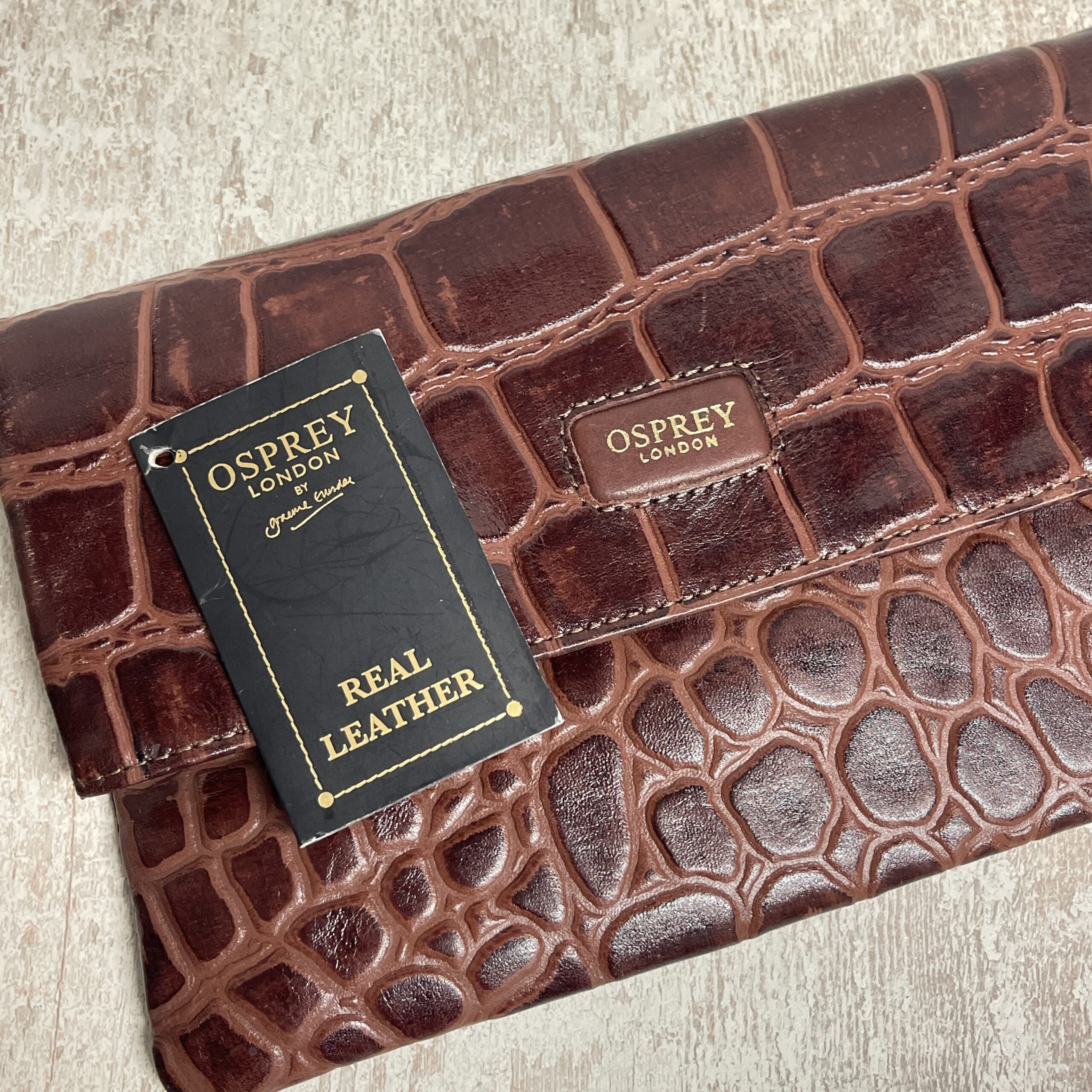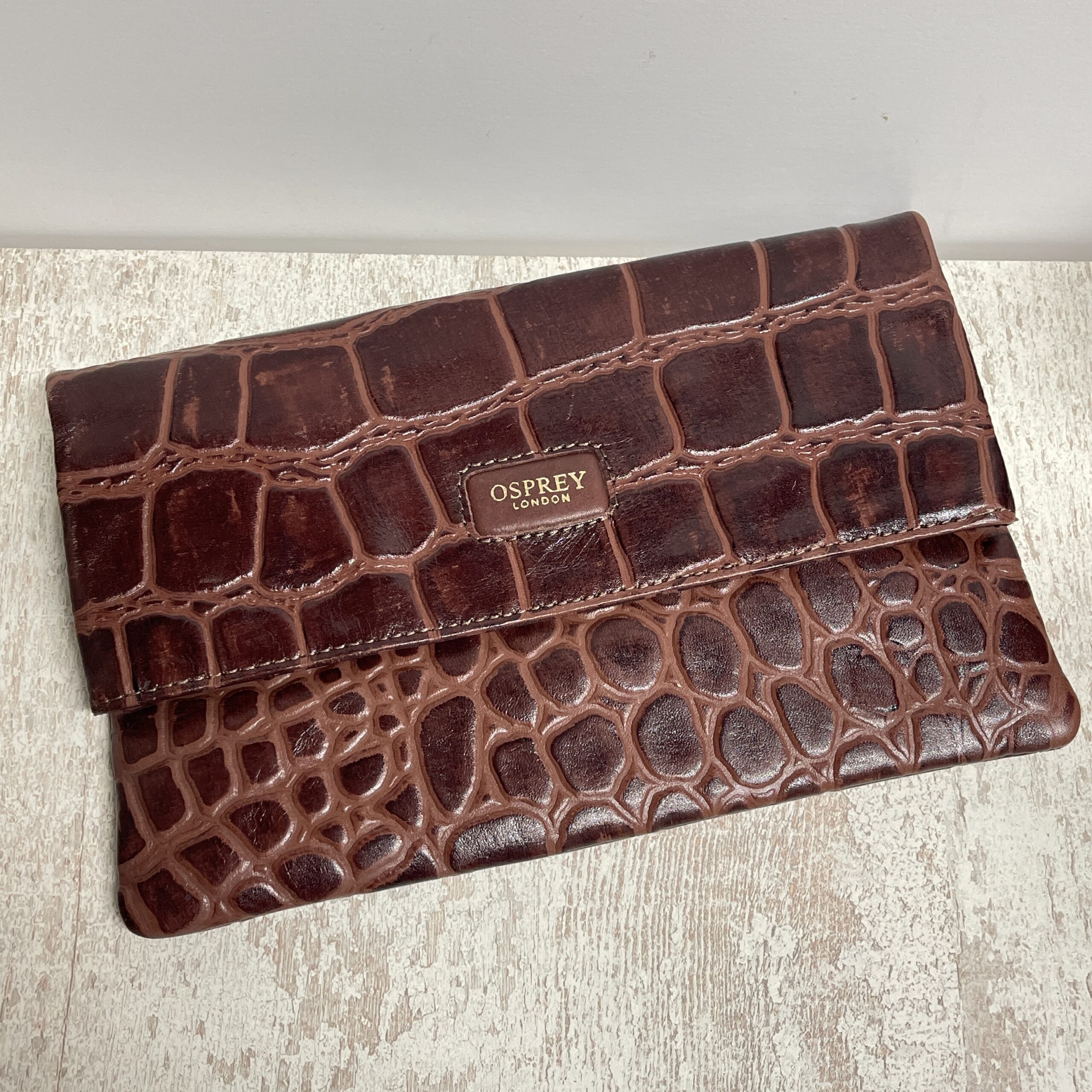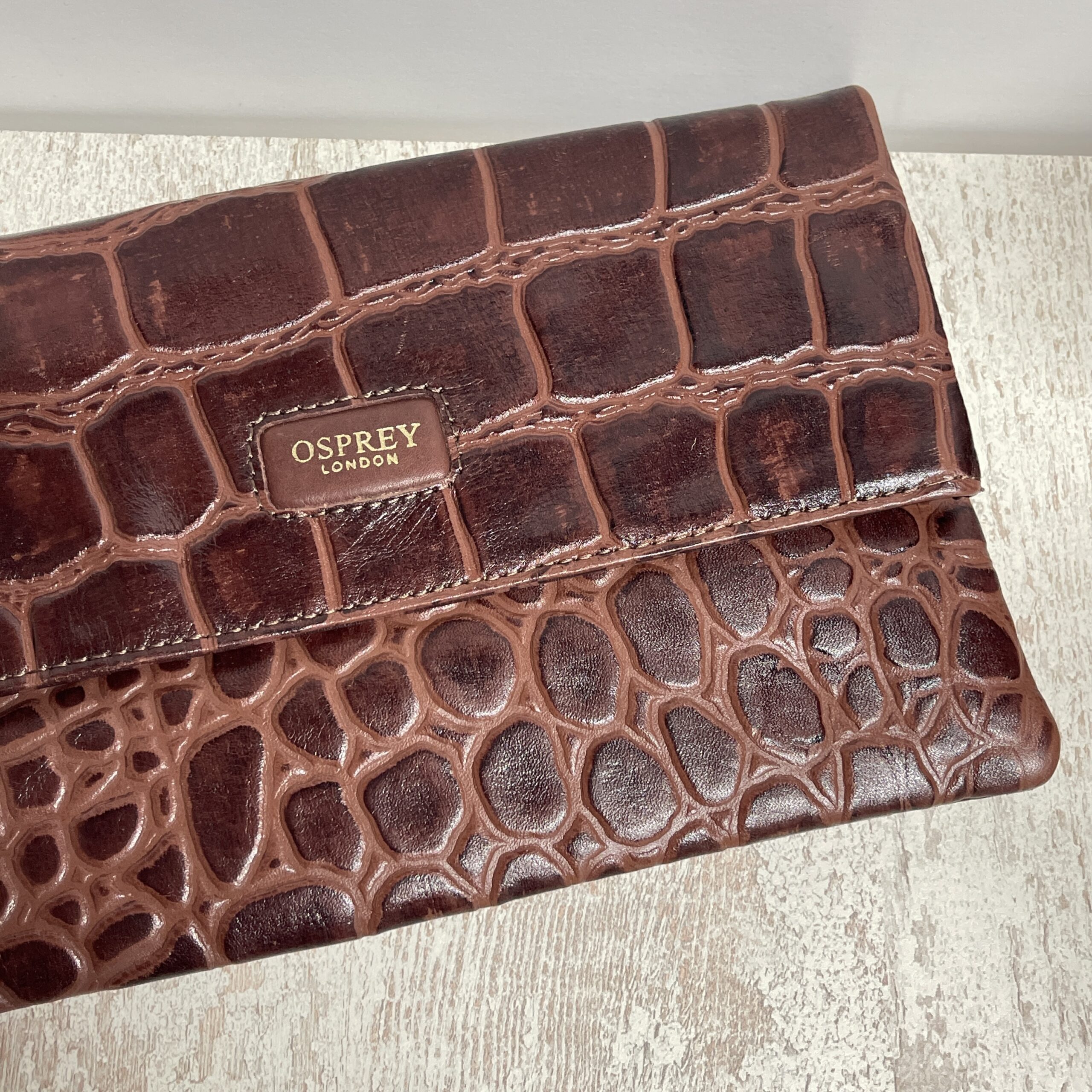 Wowie, deze nieuwe cognac bruin leren clutch met crocomotief is van het luxelederwerk Osprey London. Het bedrijf is zelfstandig en gestart in 1980. En nog steeds staat het merk voor kwalitatieve lederwaren. Deze leren clutch is van alle gemakken voorzien met meerdere vakken. Hij sluit met een magneetknoop.