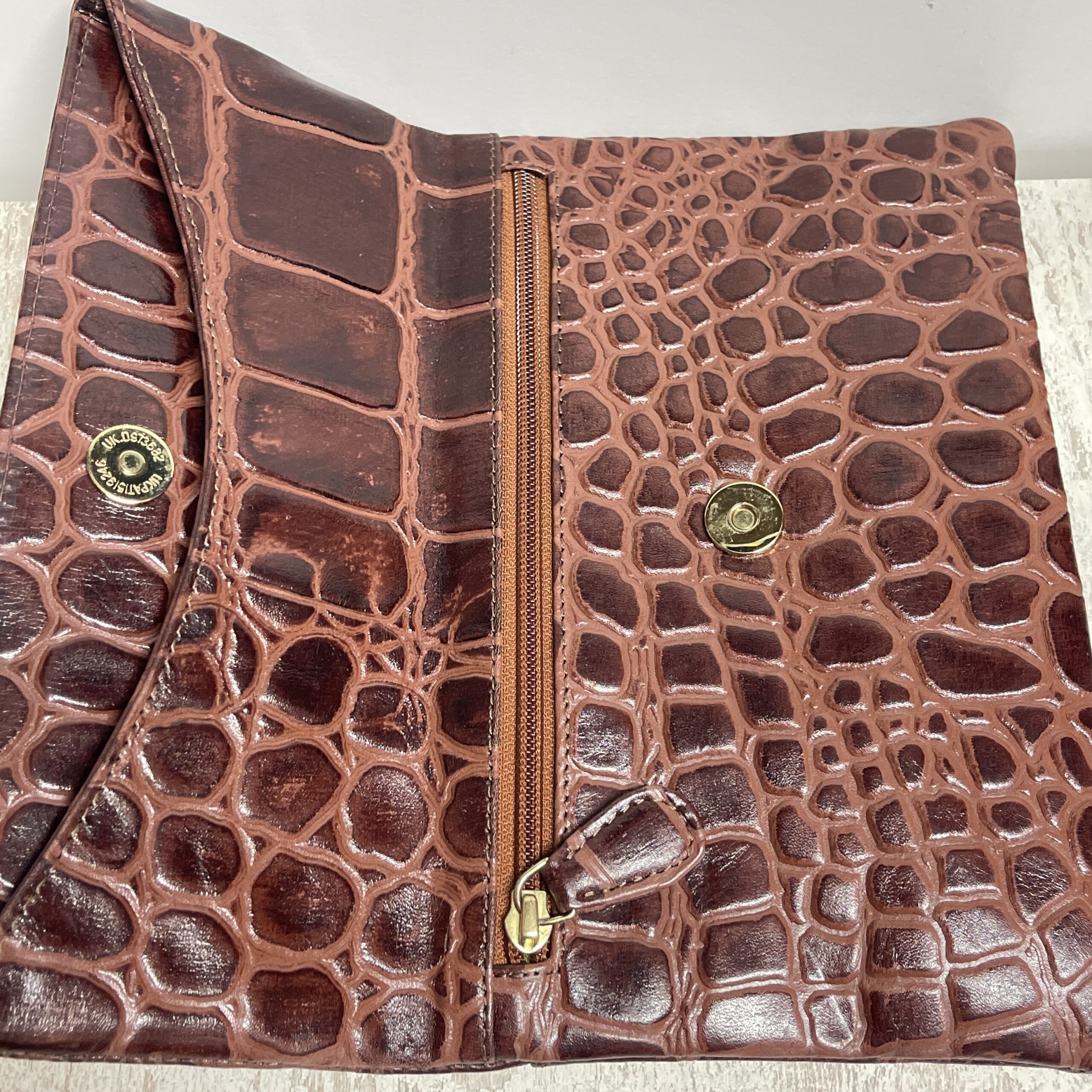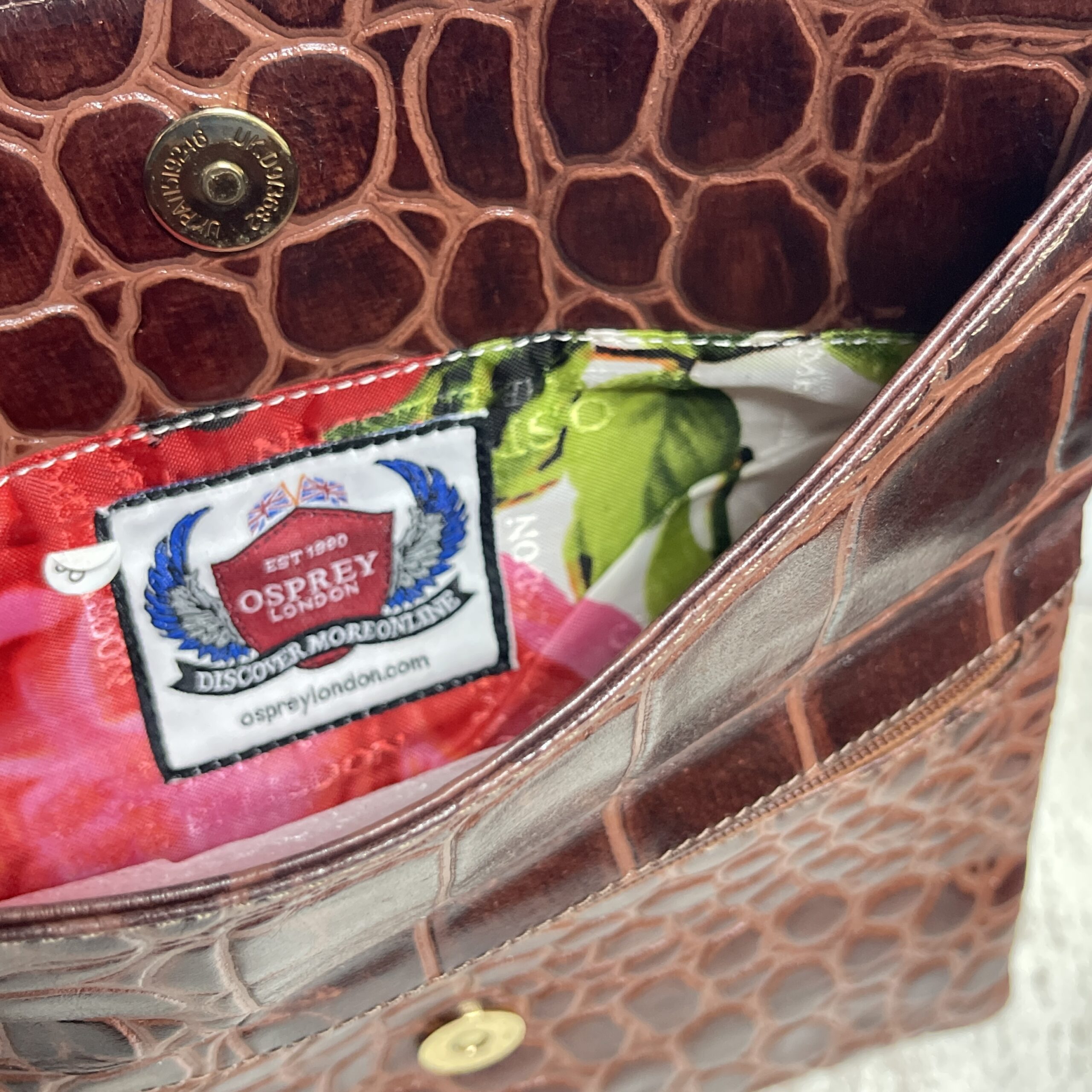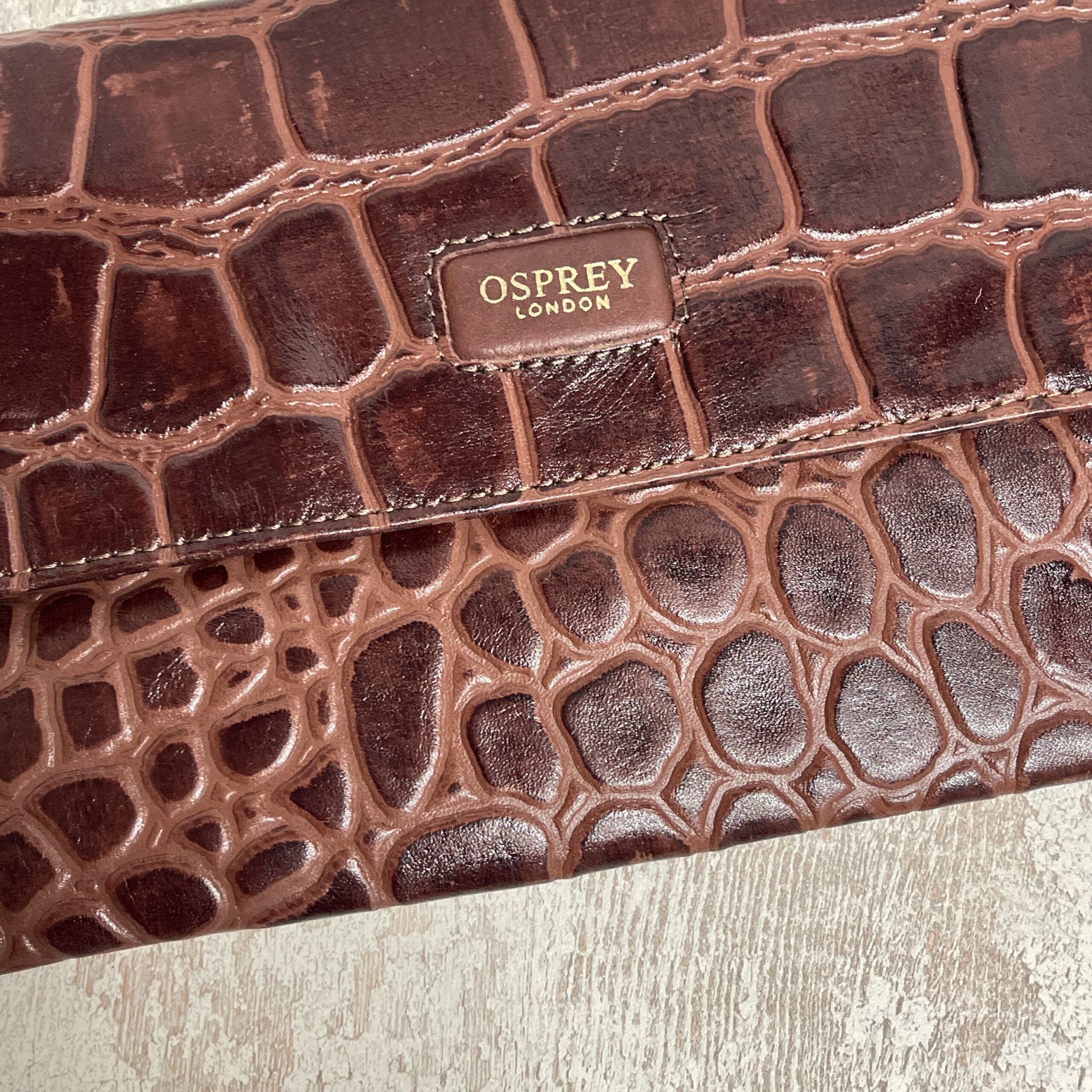 Wowie, deze nieuwe cognac bruin leren clutch met crocomotief is van het luxelederwerk Osprey London. Het bedrijf is zelfstandig en gestart in 1980. En nog steeds staat het merk voor kwalitatieve lederwaren. Deze leren clutch is van alle gemakken voorzien met meerdere vakken. Hij sluit met een magneetknoop.