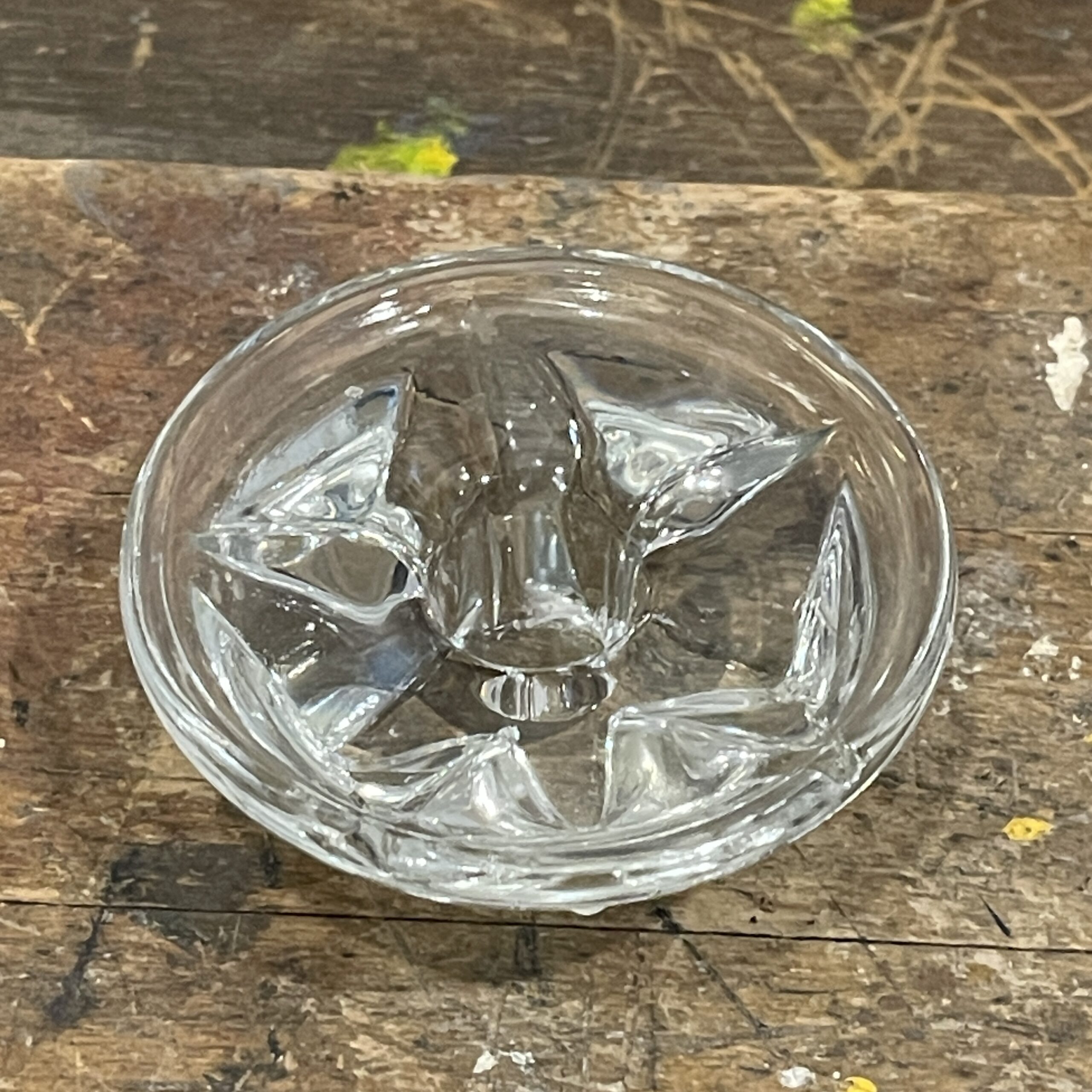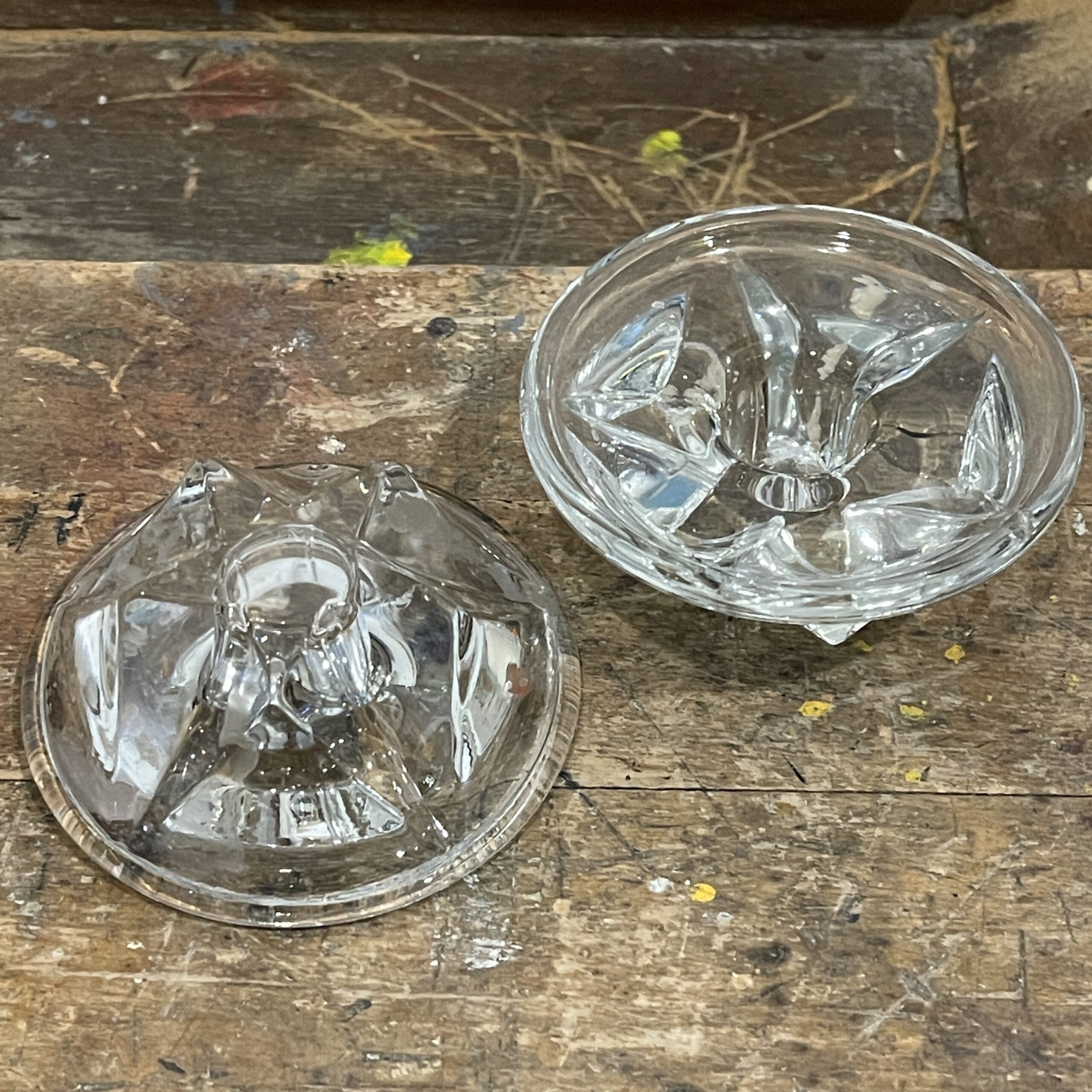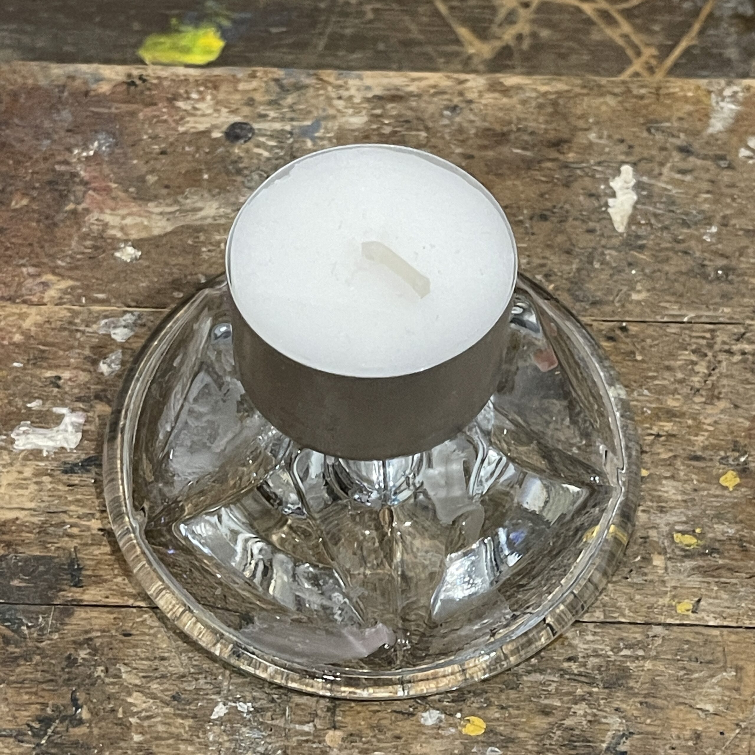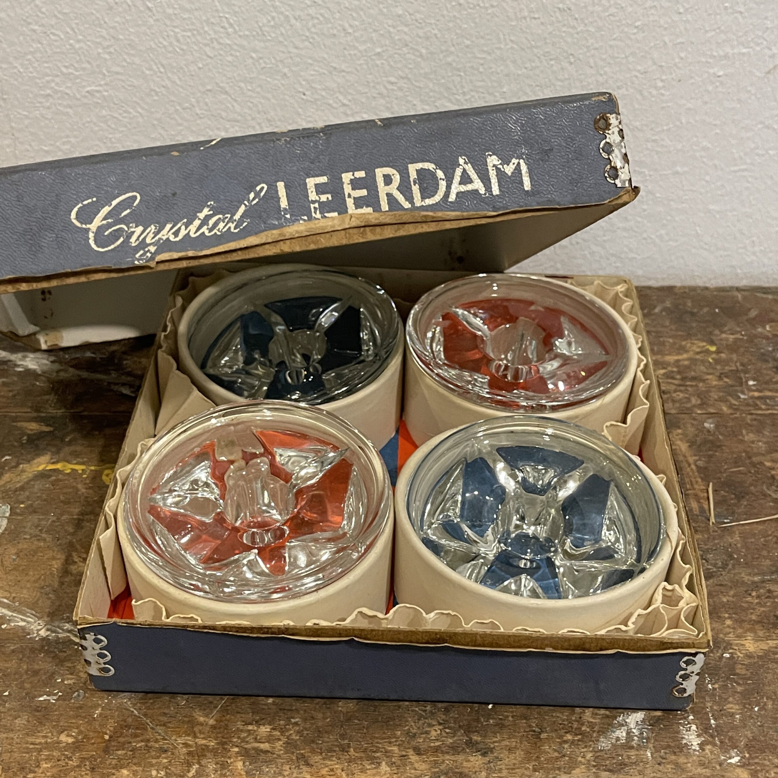Een originele doos van Leerdam met 4 glazen kandelaars. De doos is zo heel mooi meer, maar wel compleet. De kandelaars zijn als nieuw en kunnen gebruikt met kaarsen, of je legt er een waxinelichtje op.