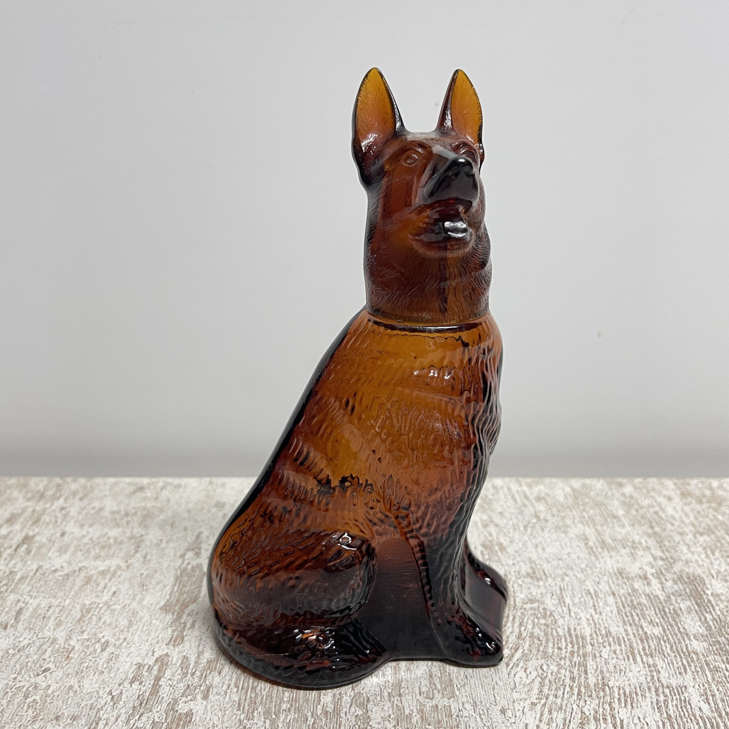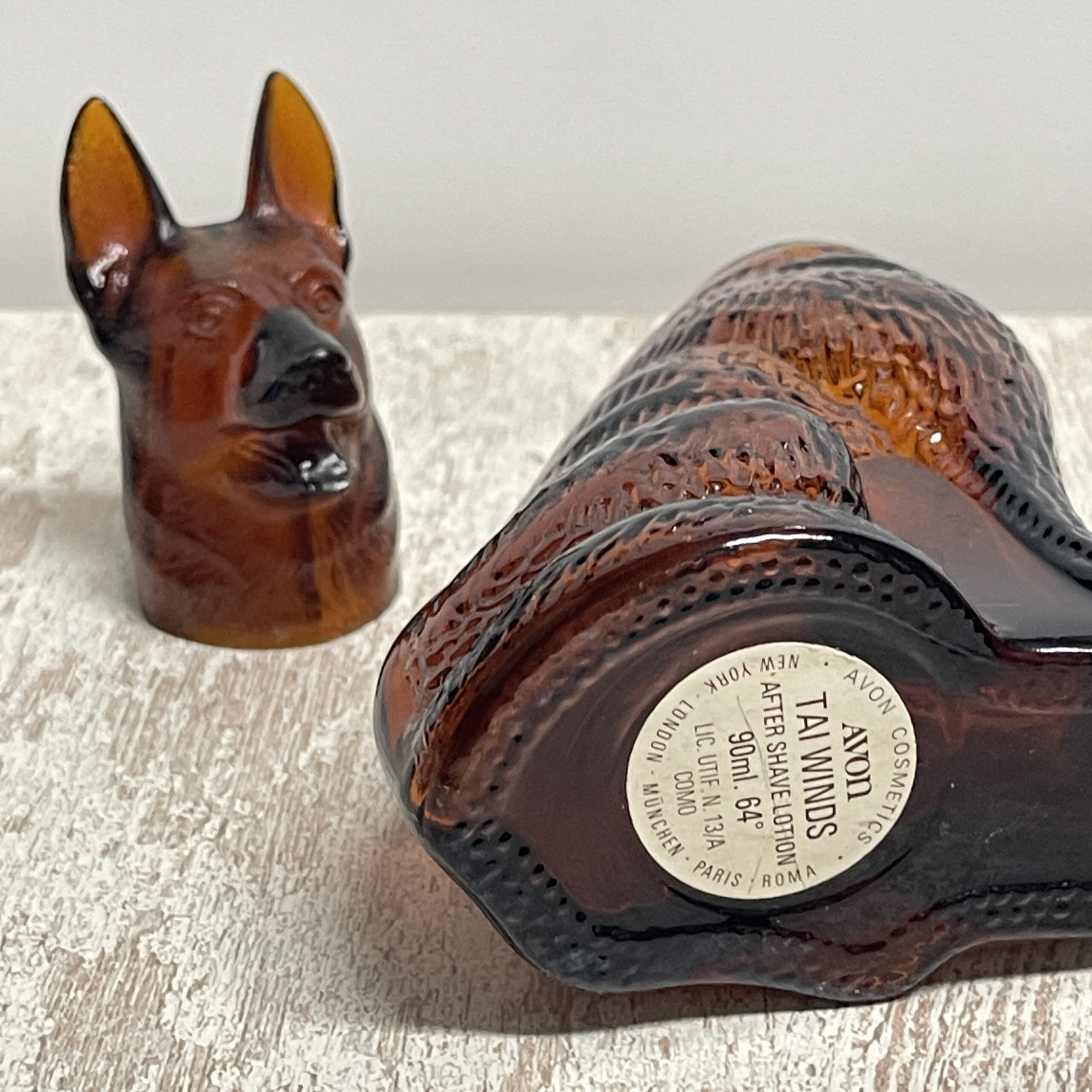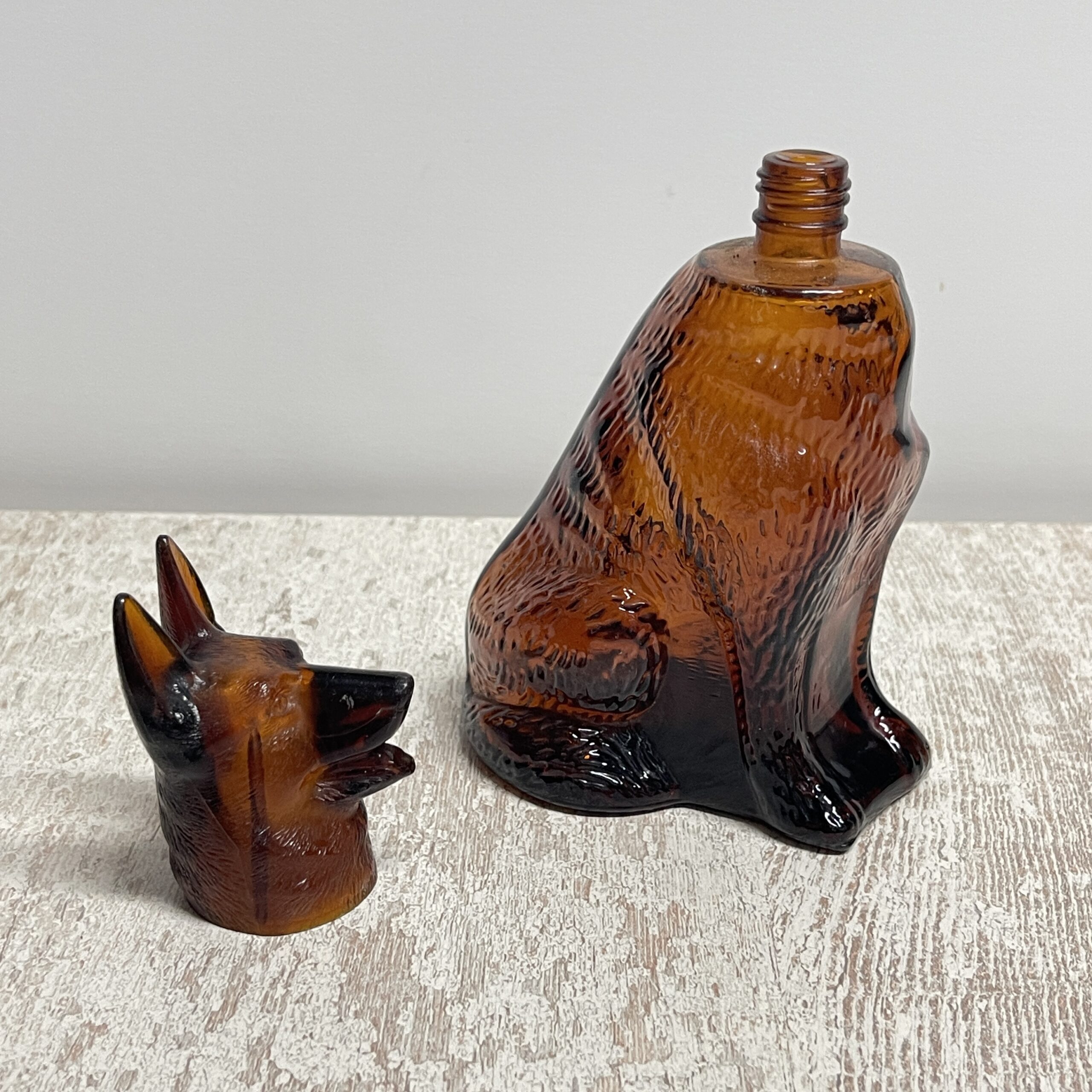 Bijzondere flacon van glas (kunststof kop) in de vorm van een herdershond. Ooit zat er parfum in, het is een fles van AVON. Nu kun je er zelf iets in doen, of ‘m gewoon voor de sier neerzetten. Of bij je verzameling AVON natuurlijk!