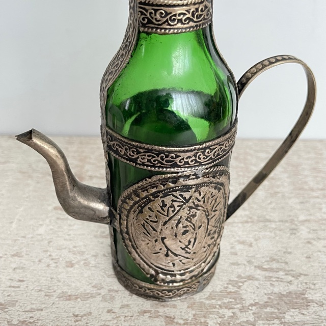 Prachtige kan uit Marokko van glas, handgemaakt, voorzien van een ‘zilver jasje’.