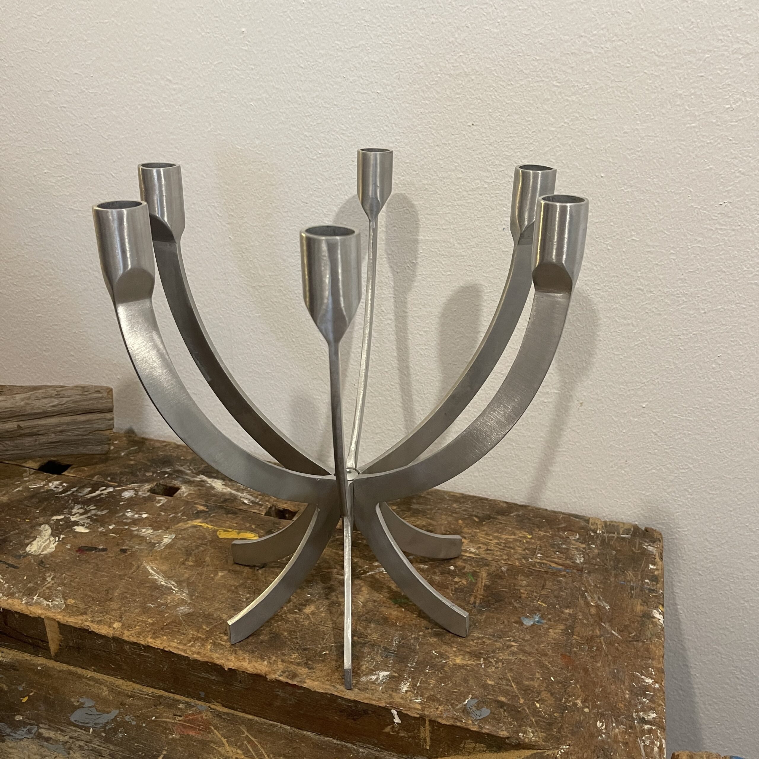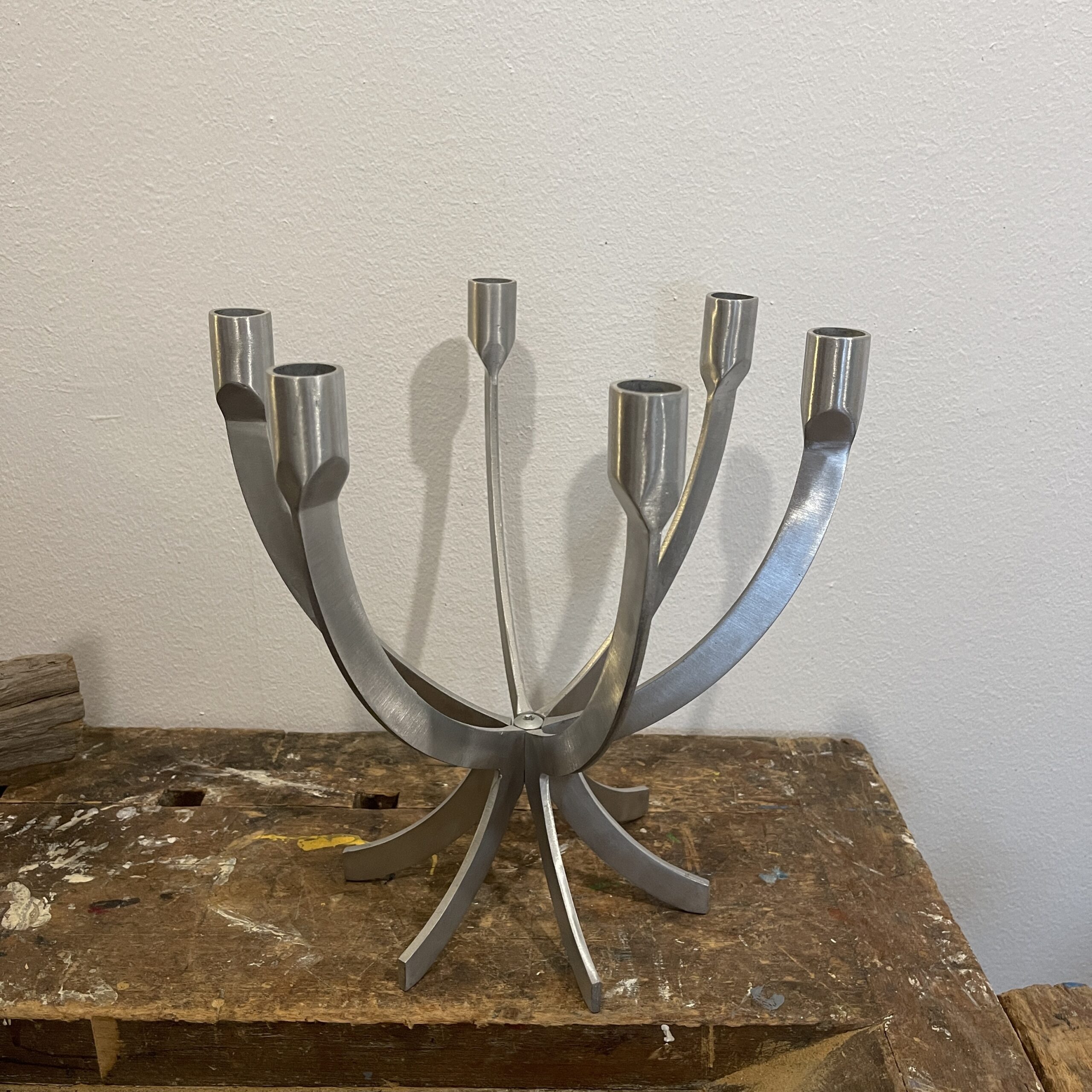 Mooie vintage kandelaar van Ikea/Sigga Heimis genaamd ‘Ceremoni’. Hij is gemaakt van geborsteld aluminium en komt uit de 90s. De kandelaar is uit elkaar te halen als je ‘m even niet meer gebruikt zodat je ‘m handig op kunt bergen.