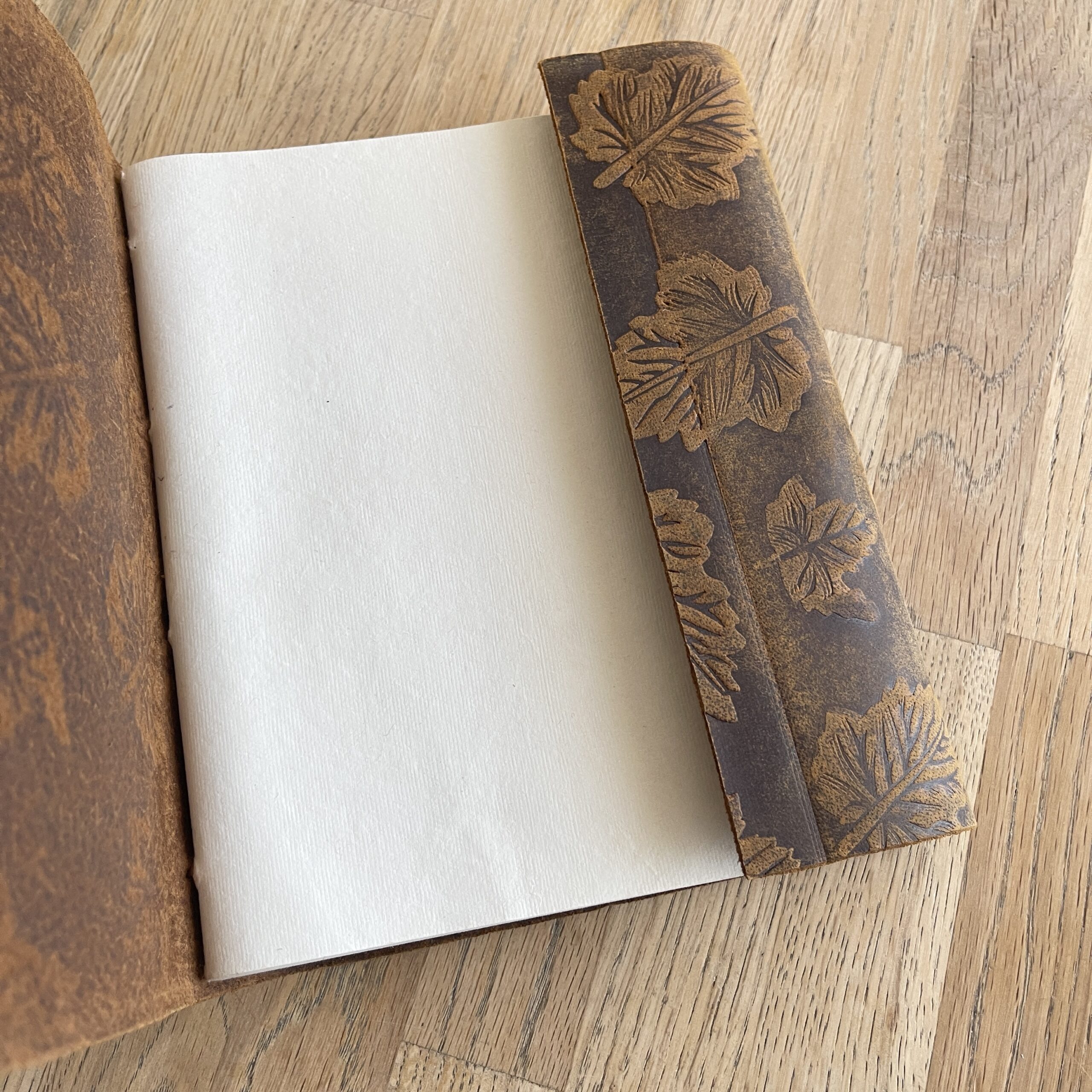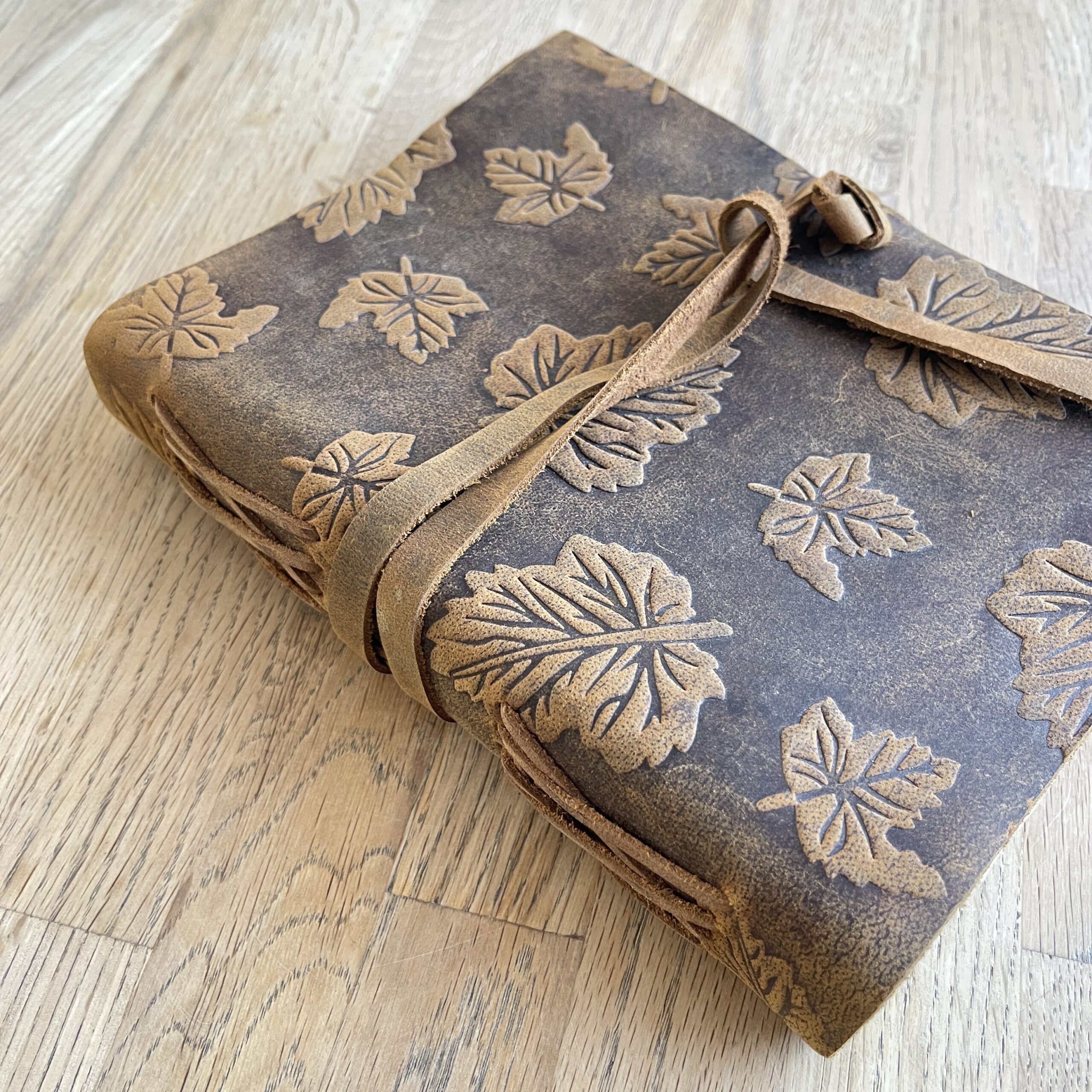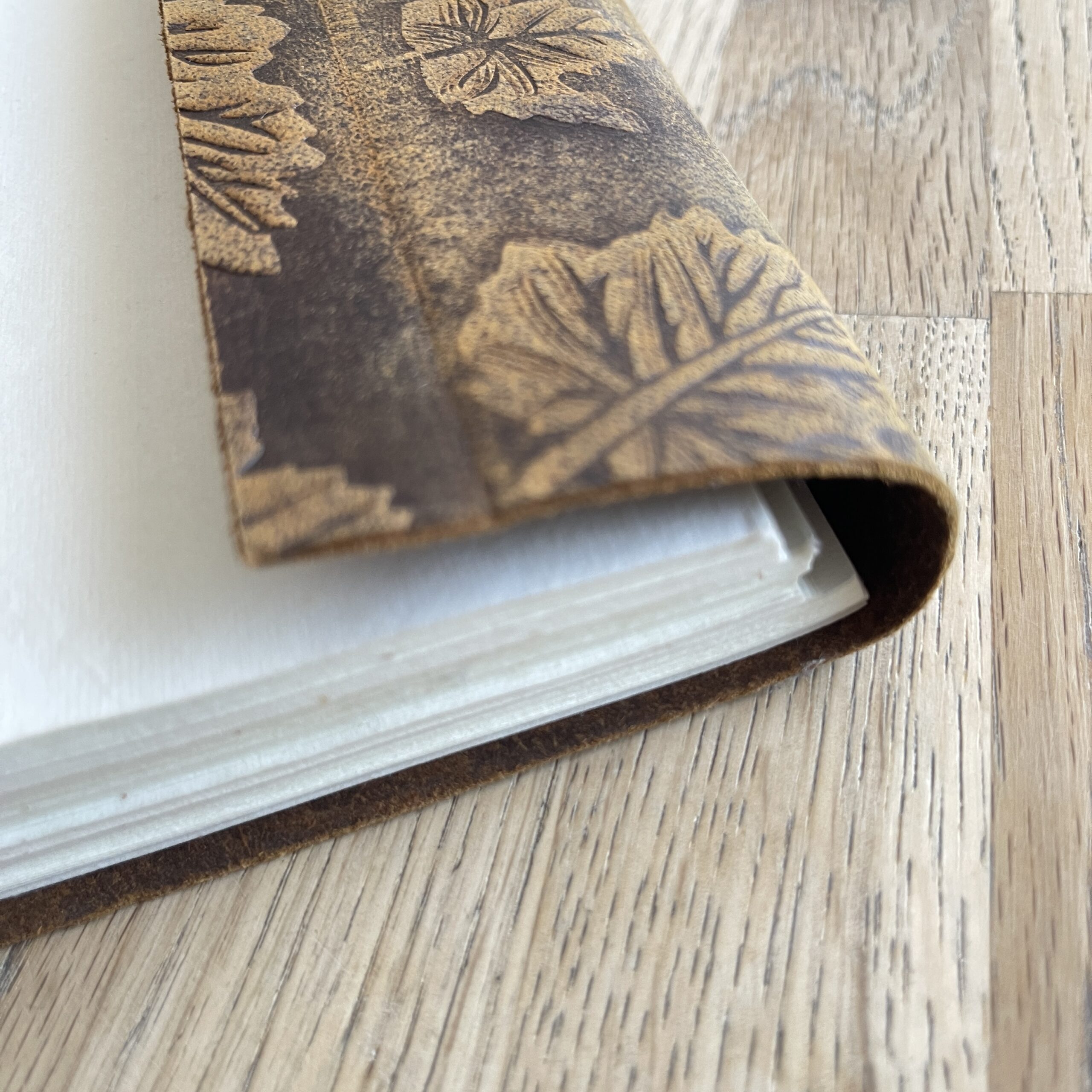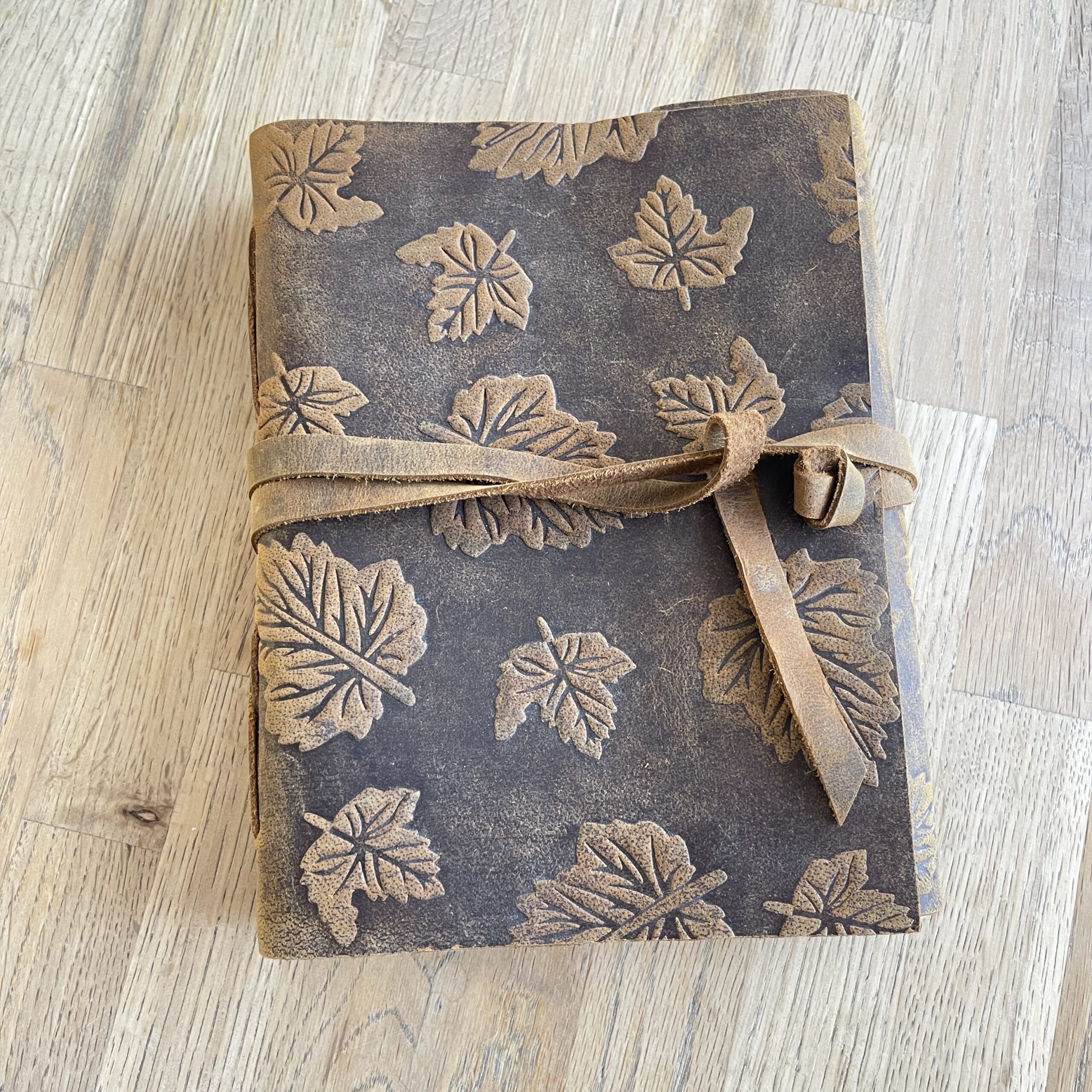 Hoe mooi is dit kloeke leren notebook! Het omslag is bedrukt met bladeren in reliëf en het geheel heeft een koord van hetzelfde leer rondom als speelse sluiting. Het papier van het binnenwerk is mooi zacht handgeschept papier.