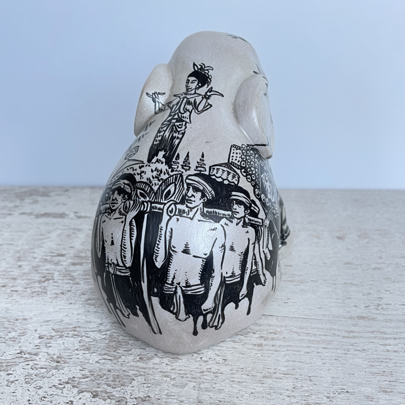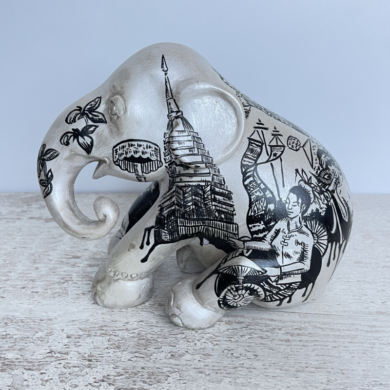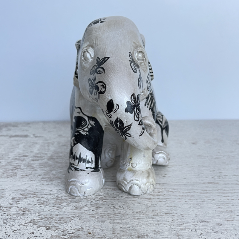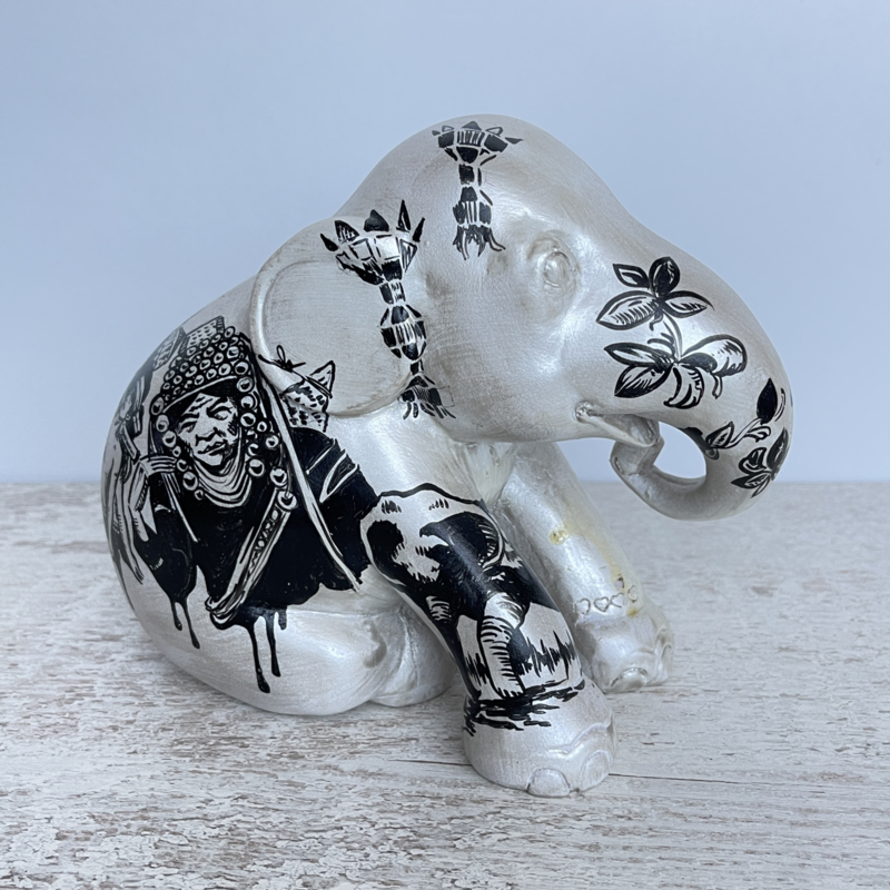 Lieve olifant van The Elephant Parade, met de hand beschilderd en genummerd aan de onderkant. Deze zit en heeft een hele lieve uitstraling. Het patroon is Aziatisch .