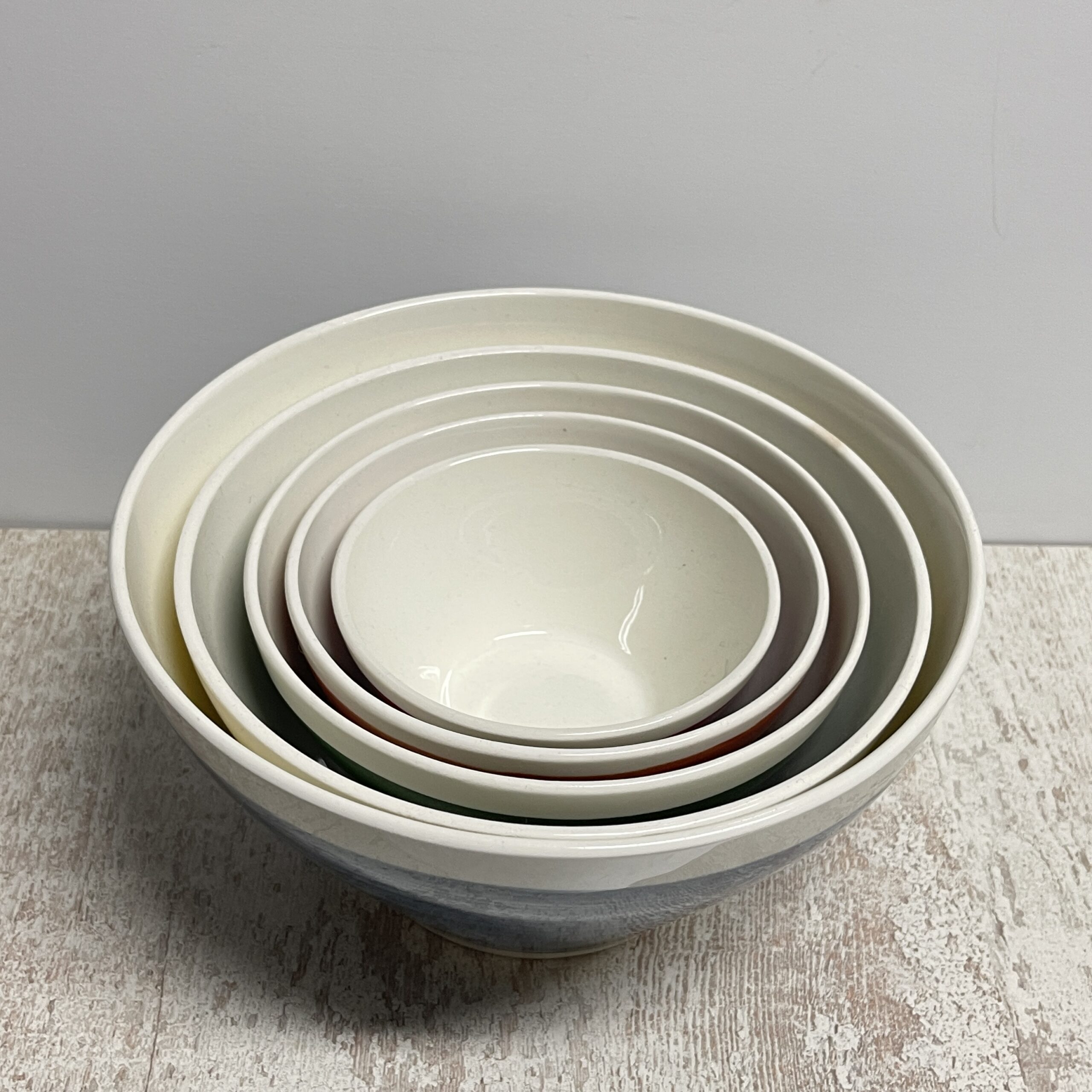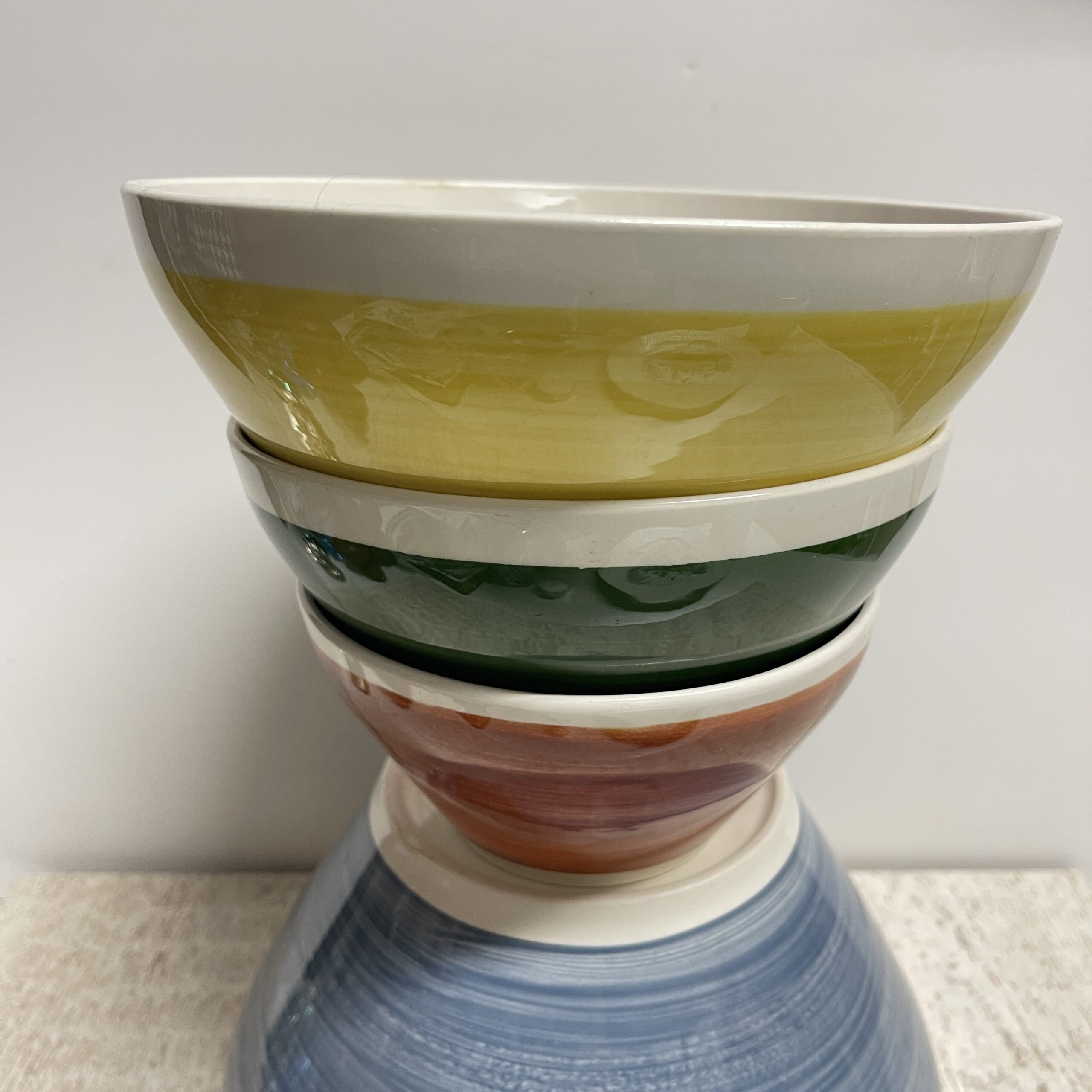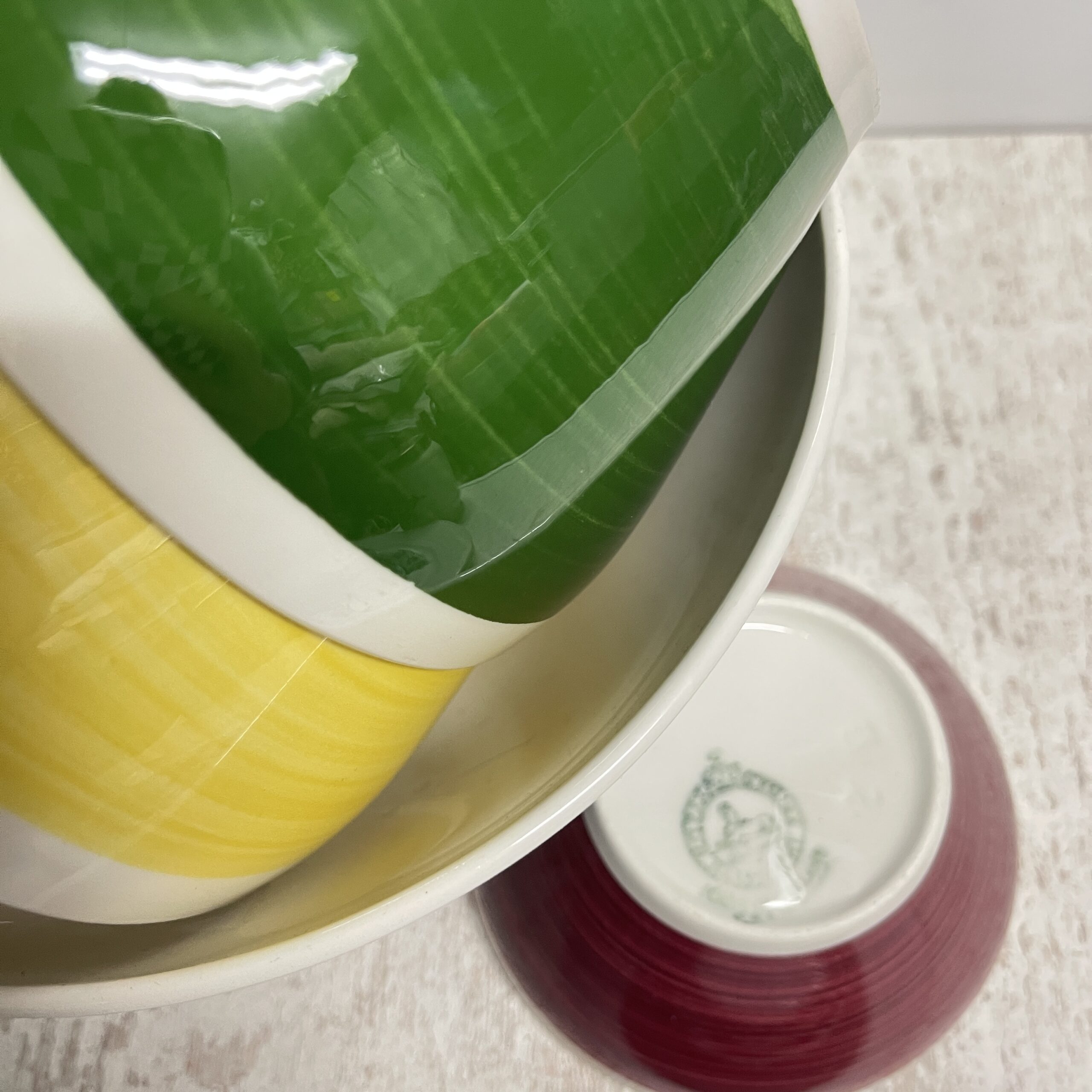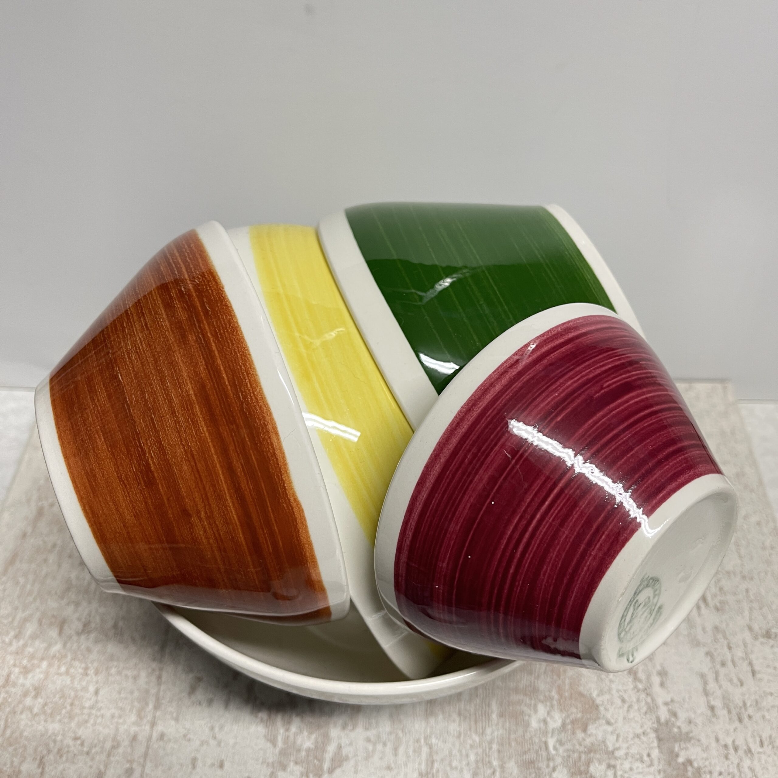 Oh, dit soort schalensets zijn zo mooi! Alleen vaak incompleet of (deels) kapot. Dit set is compleet én in mooie staat! Elke schaal is aan de onderkant voorzien van een Petrus Regout blindmerk. Deze aardewerken kommen komen uit Maastricht en worden ook wel ‘Maastrichts aardewerk’ genoemd. Ze hebben elk een kleur en passen in elke keuken. Of het nu een landelijke, strakke of designkeuken is!