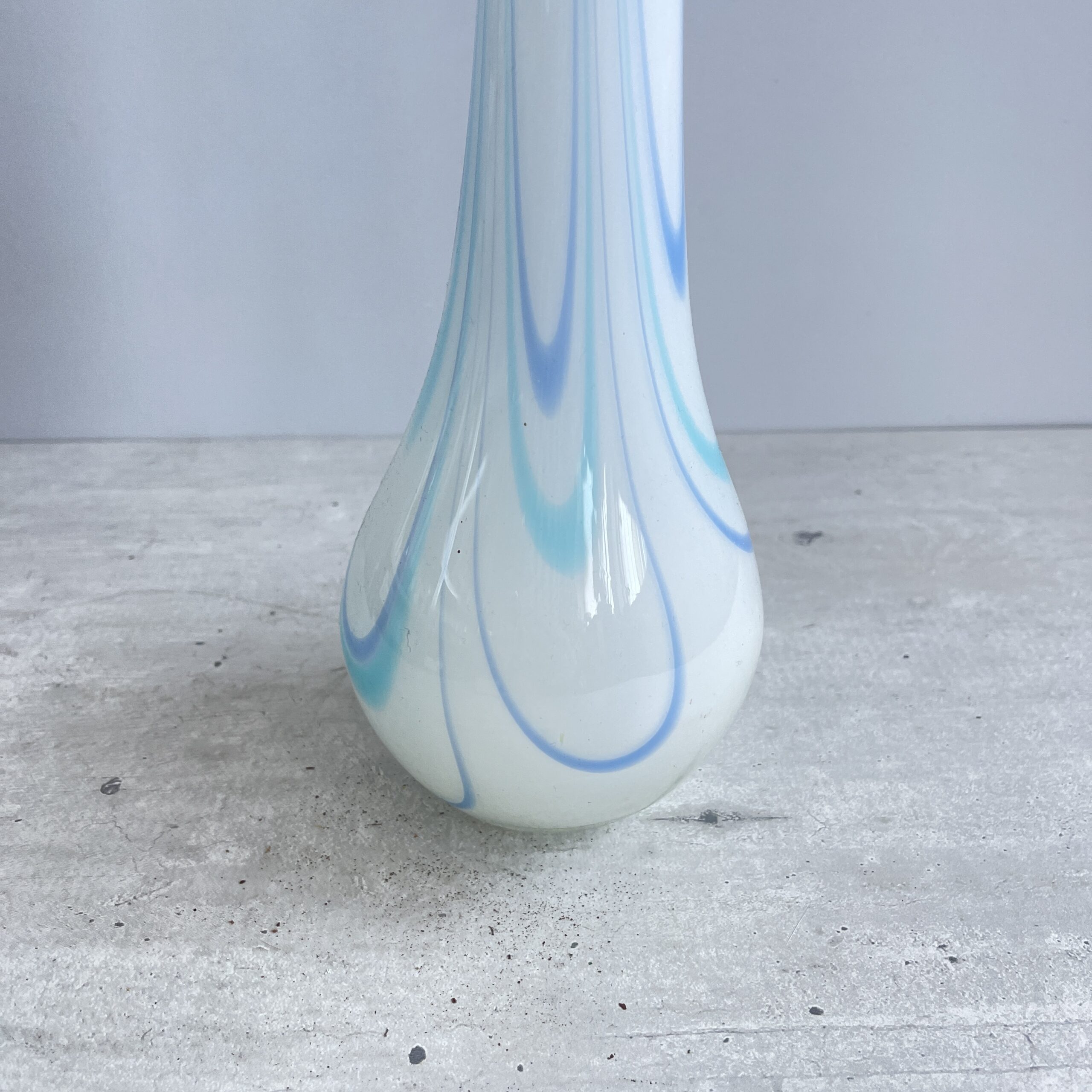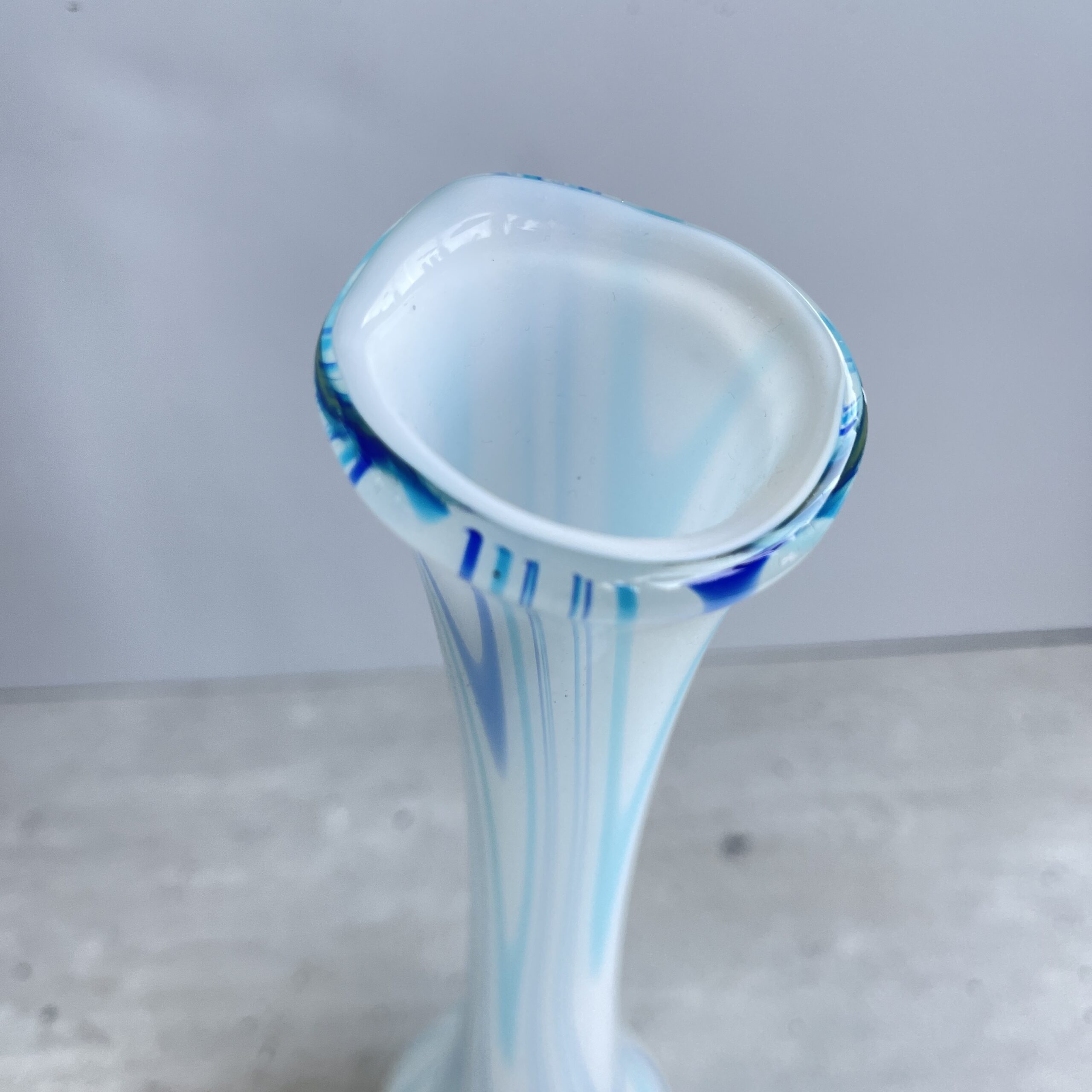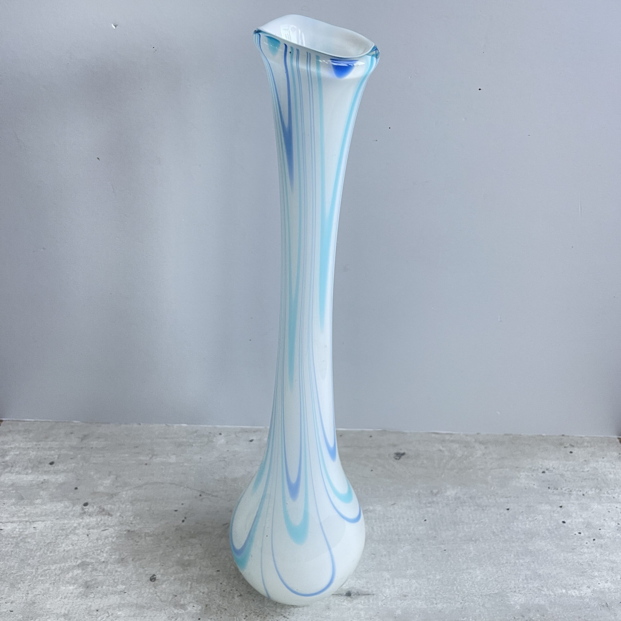 Het lijkt wel opalineglas, deze slanke ranke vaas is uitgevoerd in blauw/wit. Zo al mooi om neer te zetten, op de vensterbank bijvoorbeeld. Maar ook mooi met een enkele tak of bloem.