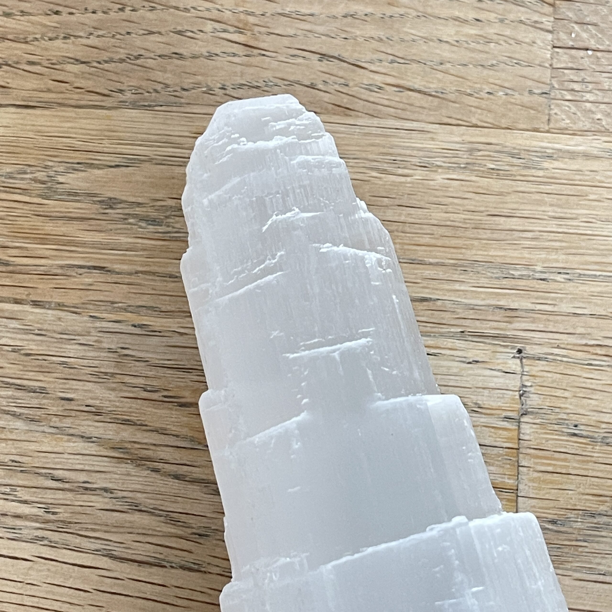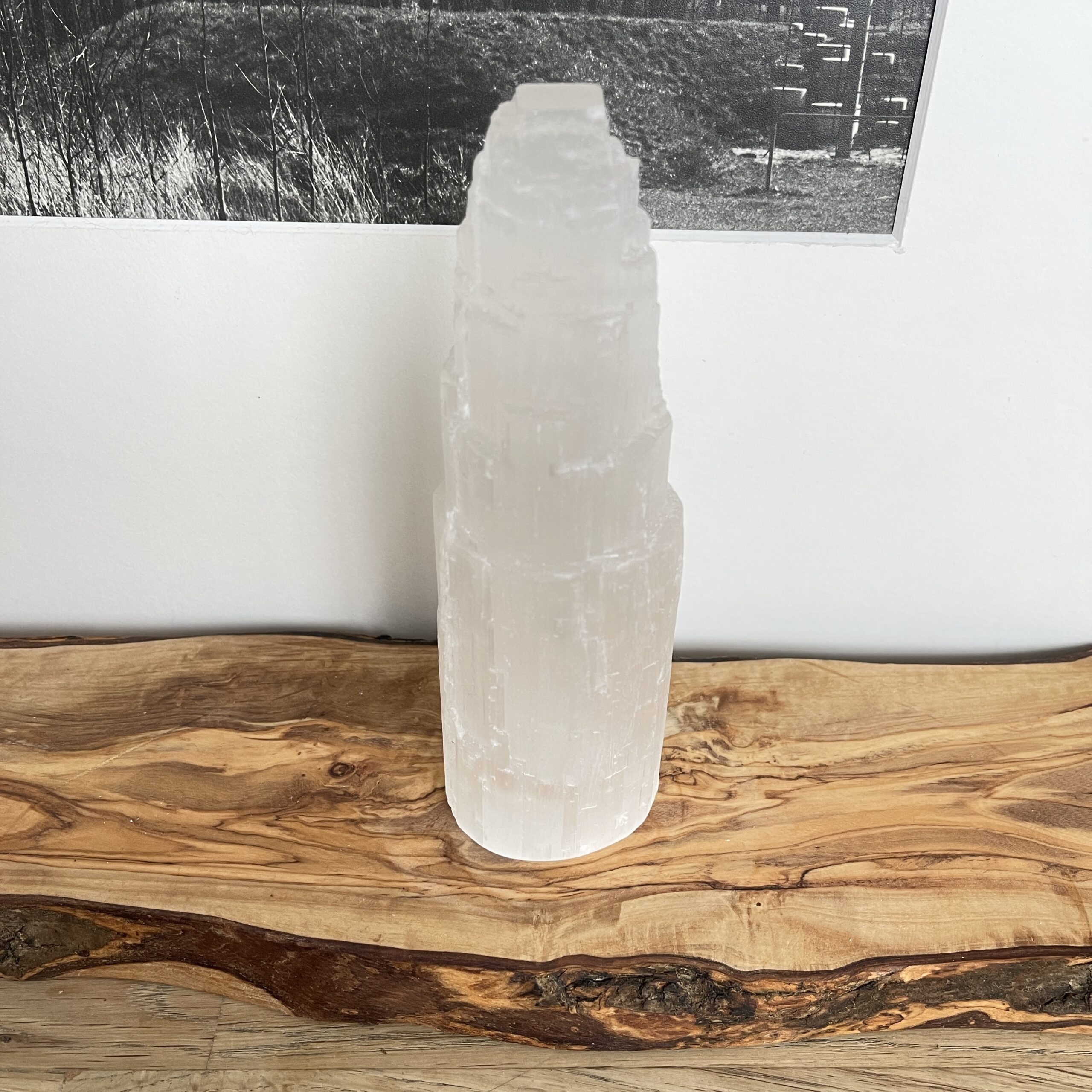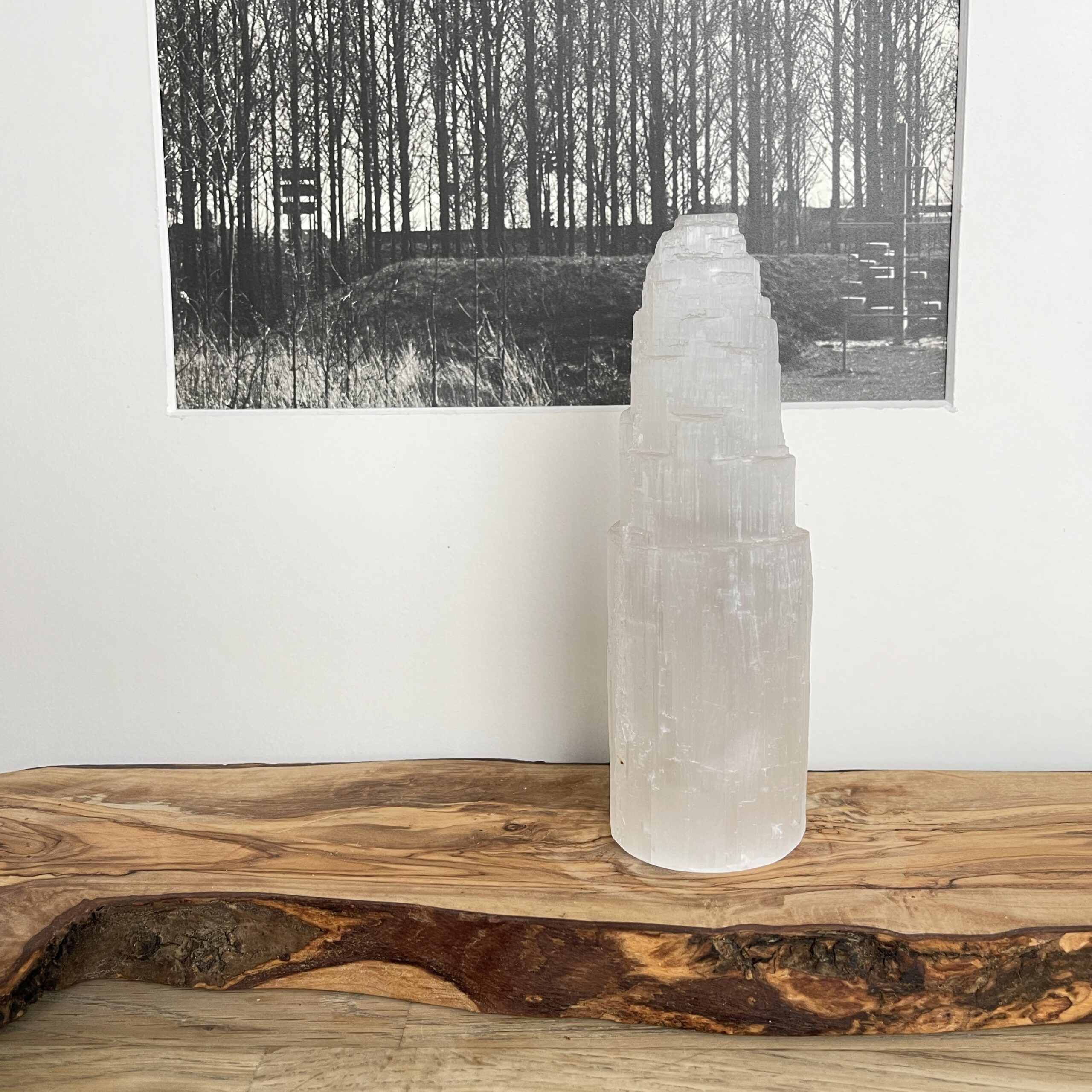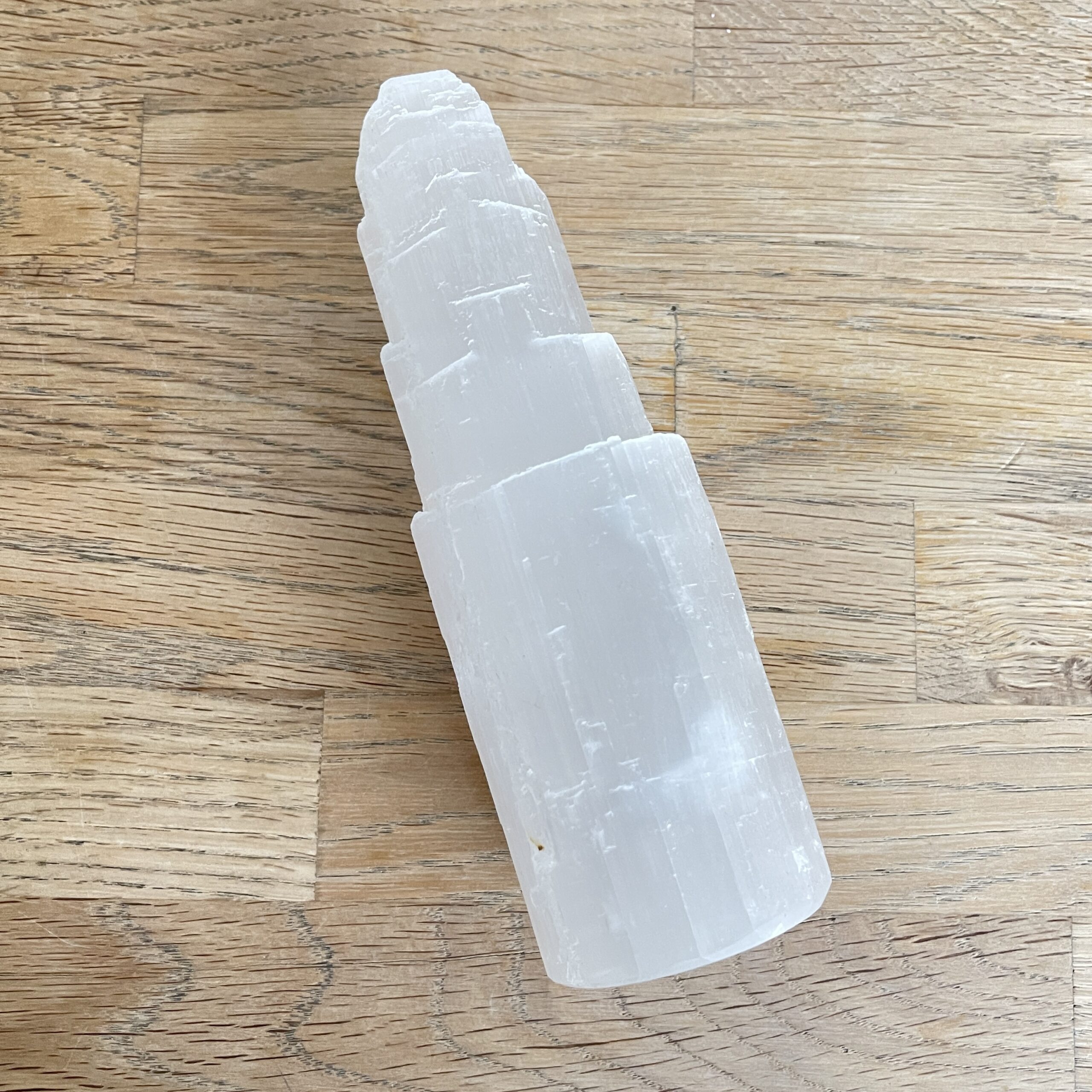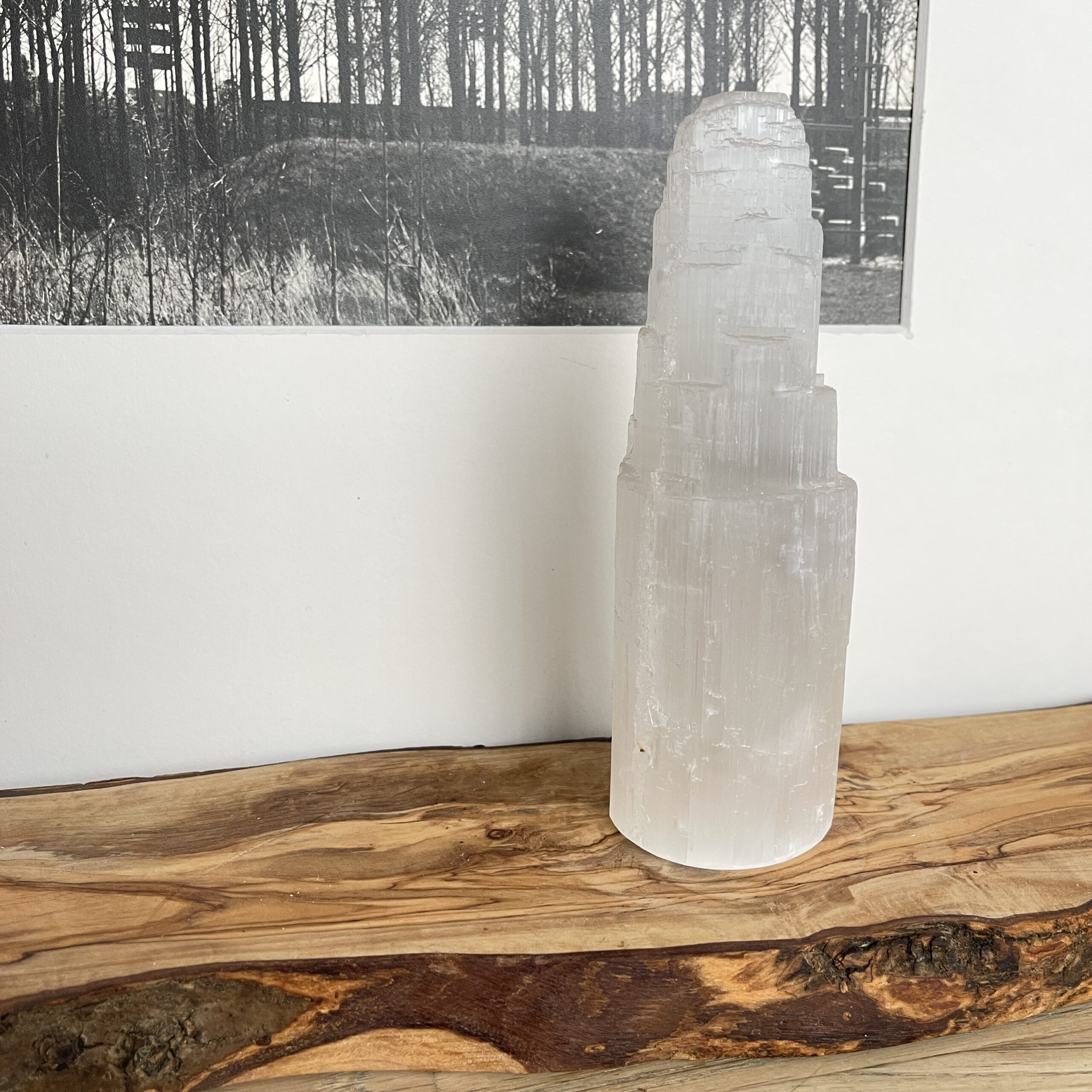 Deze prachtige toren gemaakt van seleniet is een beauty om naar te kijken. Of om bij te mediteren bijvoorbeeld. Het lijkt wel een grote ijspegel, maar hij voelt ‘warm’ in de hand. Zet ‘m in het raamkozijn of bij je yogaplekje. Seleniet wordt ook wel de ‘ijsedelsteen’ genoemd. Of ‘engelensteen’, vanwege het licht. Seleniet is vernoemd naar de Griekse godin van de maan, Selene. Heerlijk om bij te ontspannen en weg te dromen!