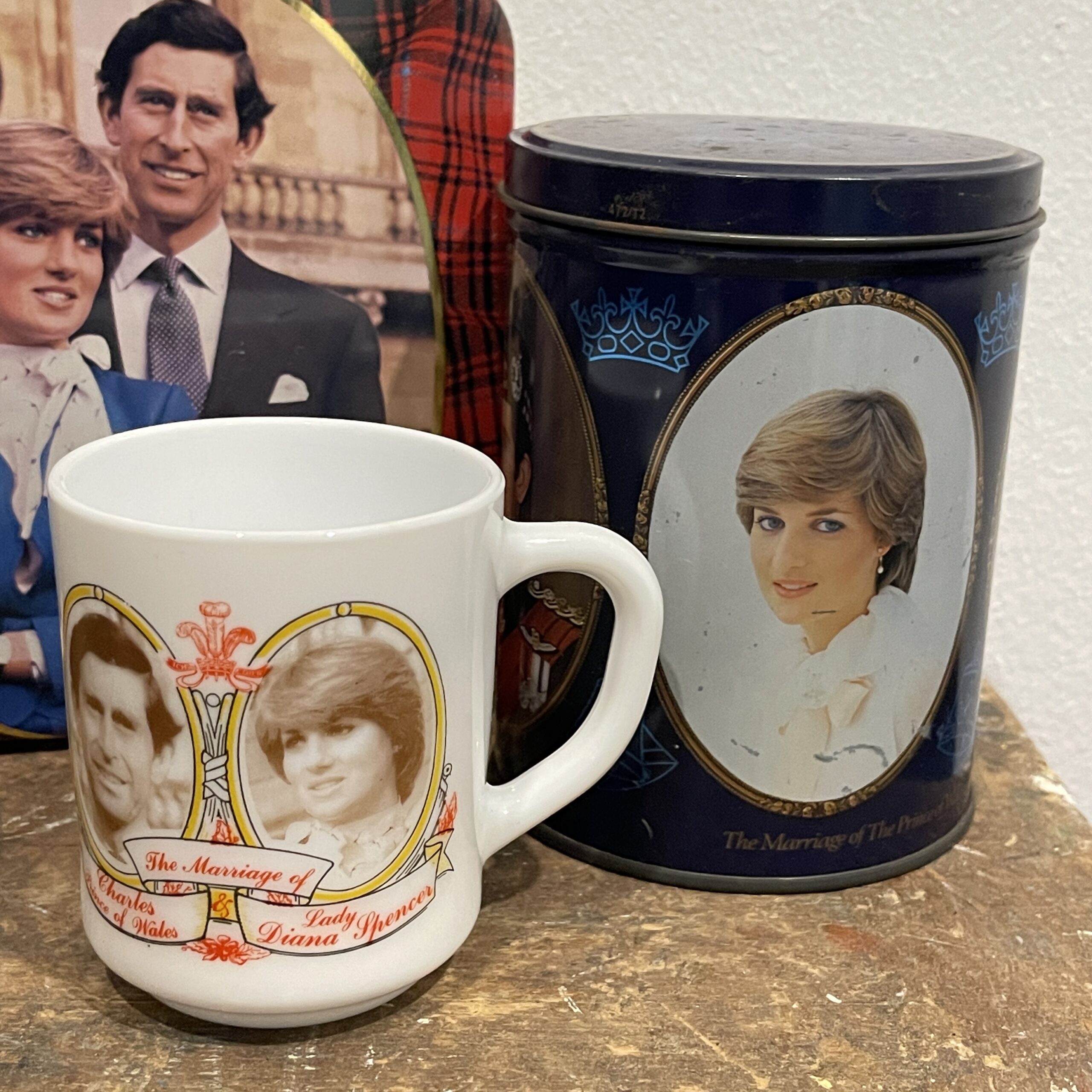 Voor de Diana of Lady Di fans: een setje met een groot vierkant blik, een rond hoog blik én een beker. Toen ze nog gelukkig(er) was, met Charles. Alhoewel, of ze écht gelukkig is geweest, dat was waarschijnlijk heel kort. Maar wat een icoon was en is zij!