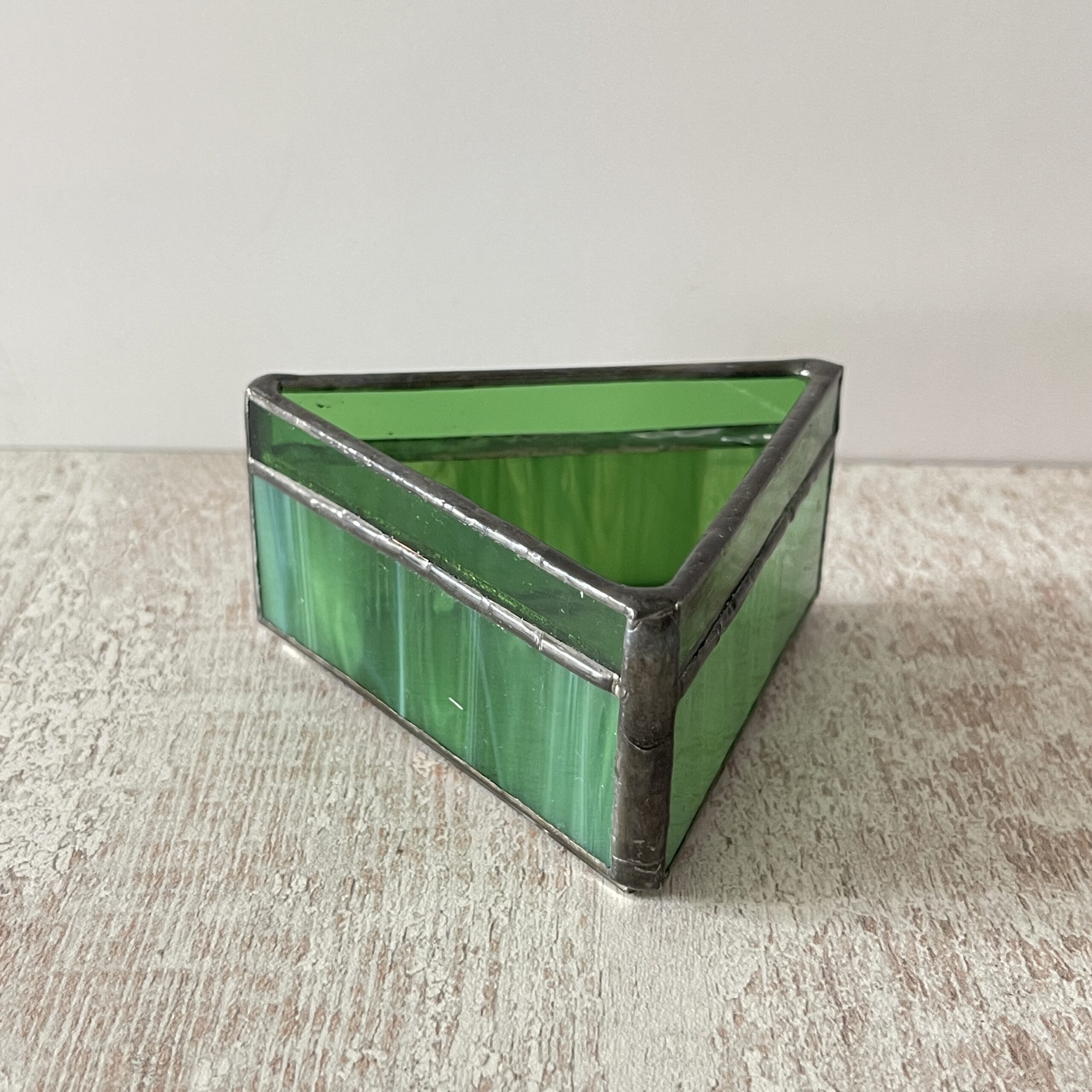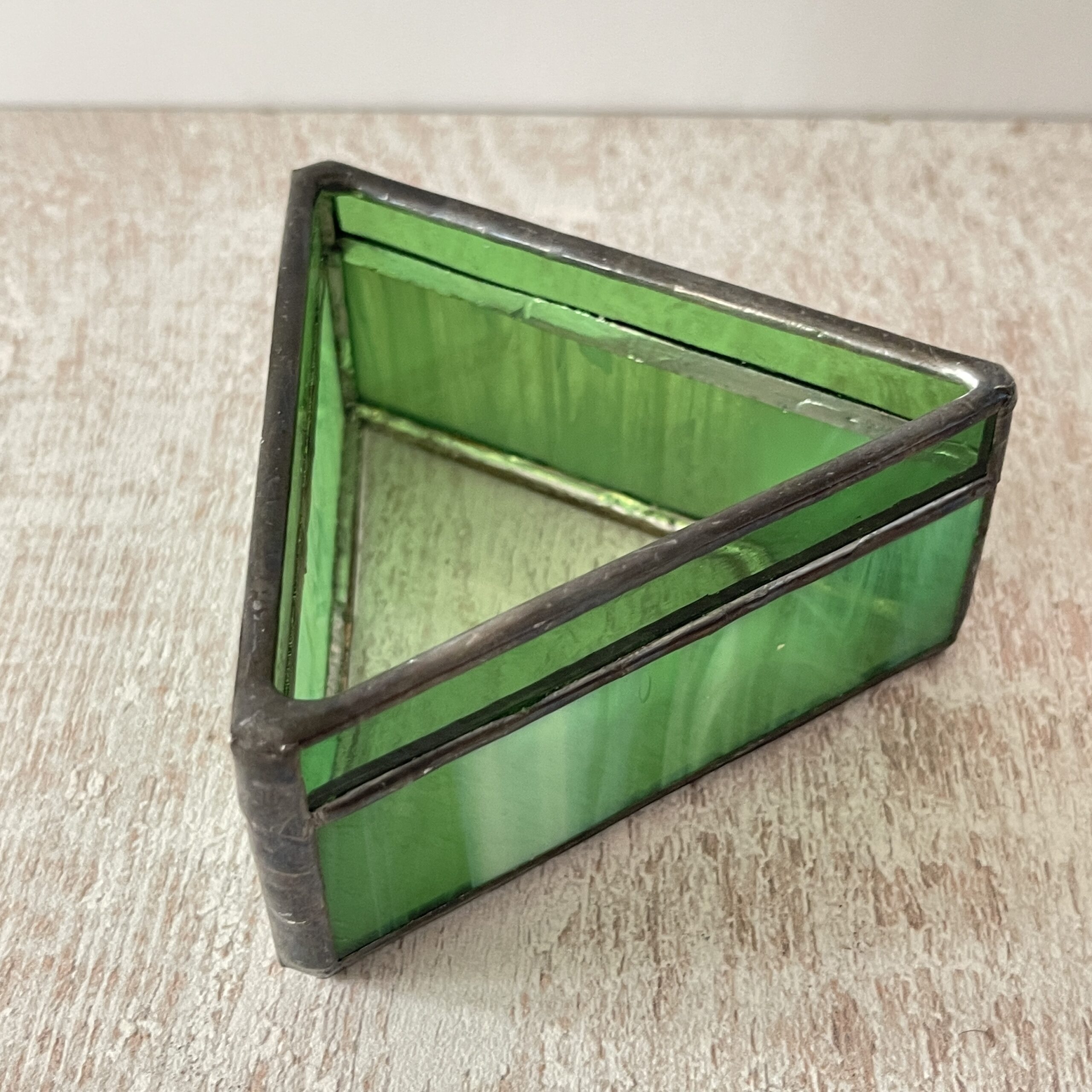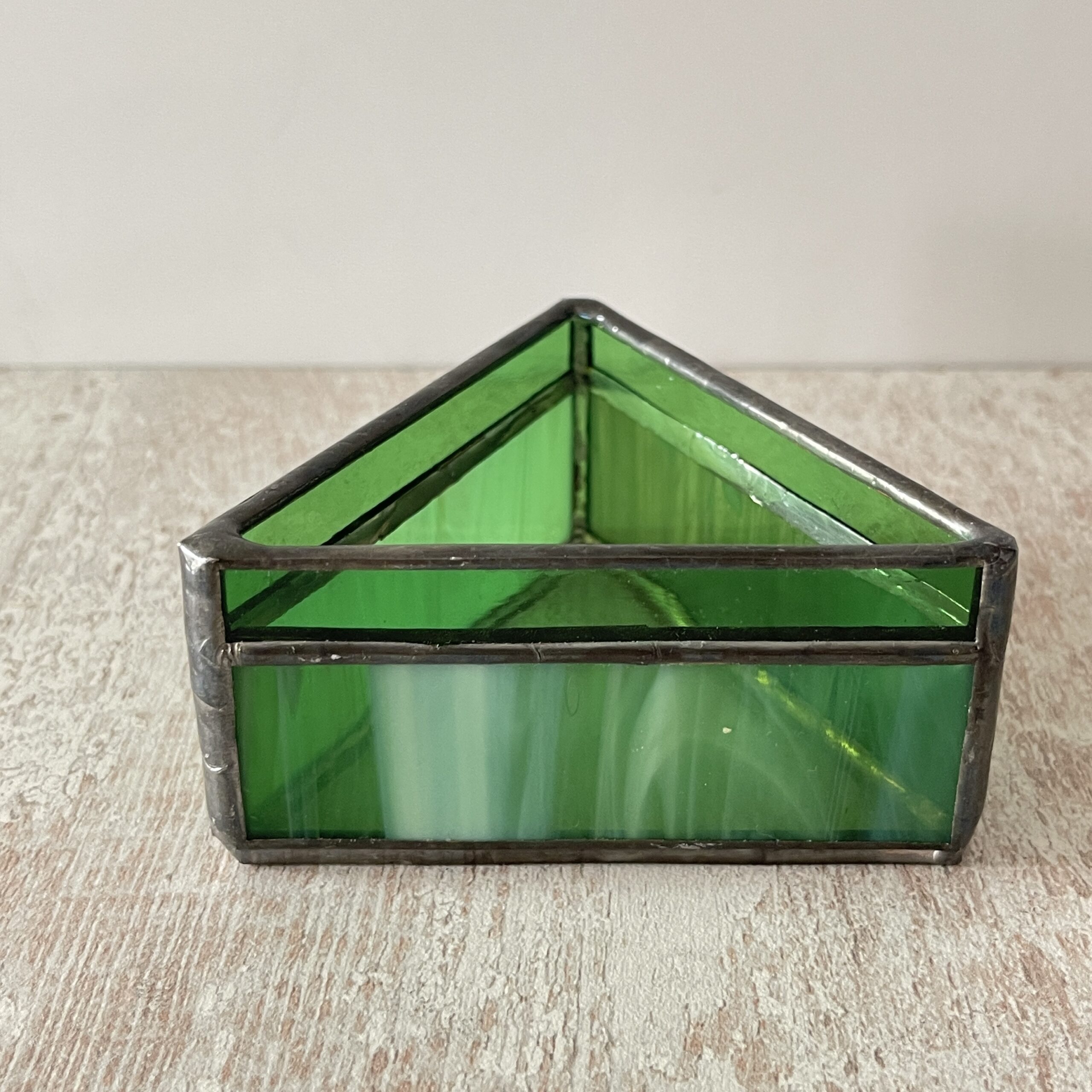 Deze Tiffany waxinelichthouder is gemaakt van glas (natuurlijk), in de vorm van een driehoek in een mooie kleur groen.