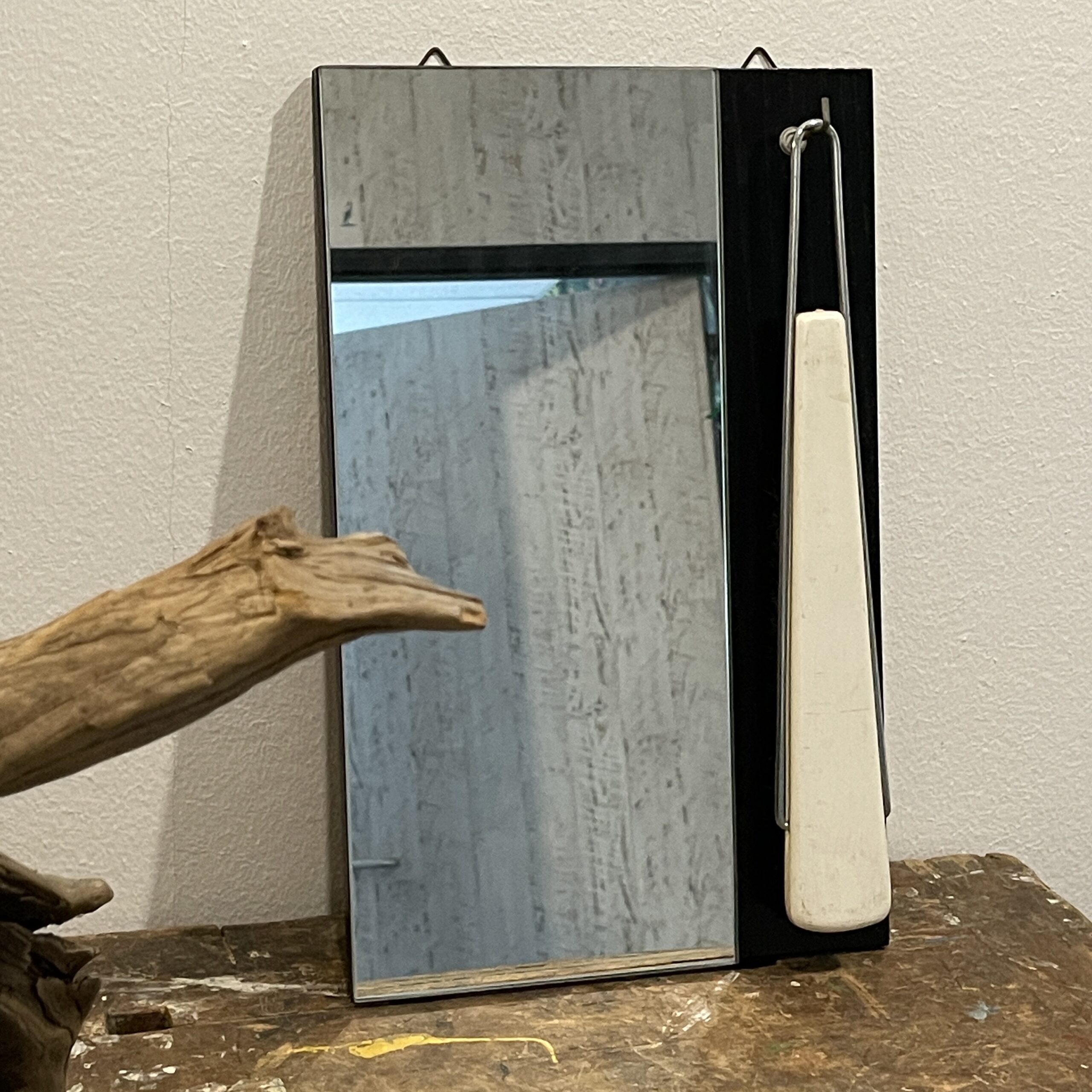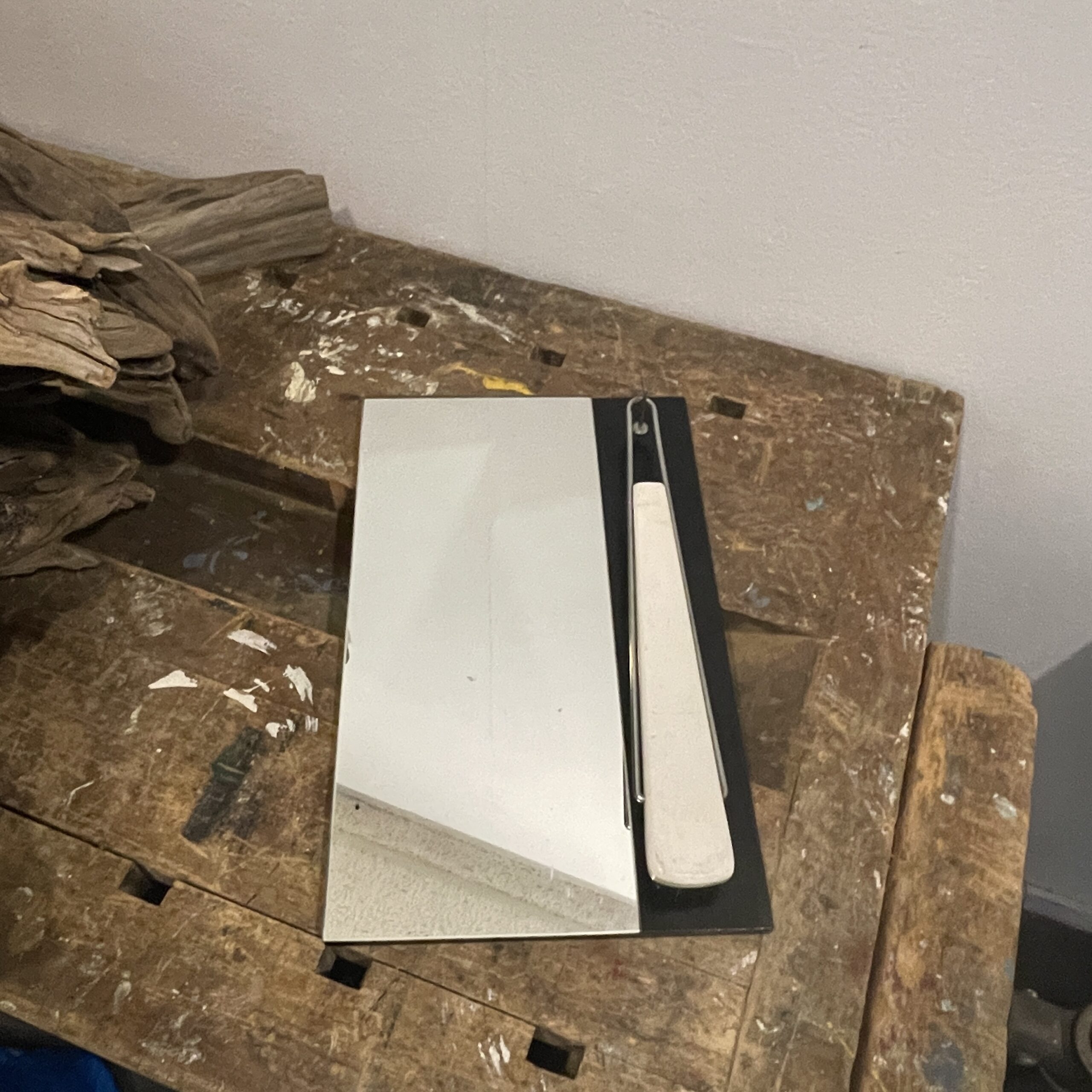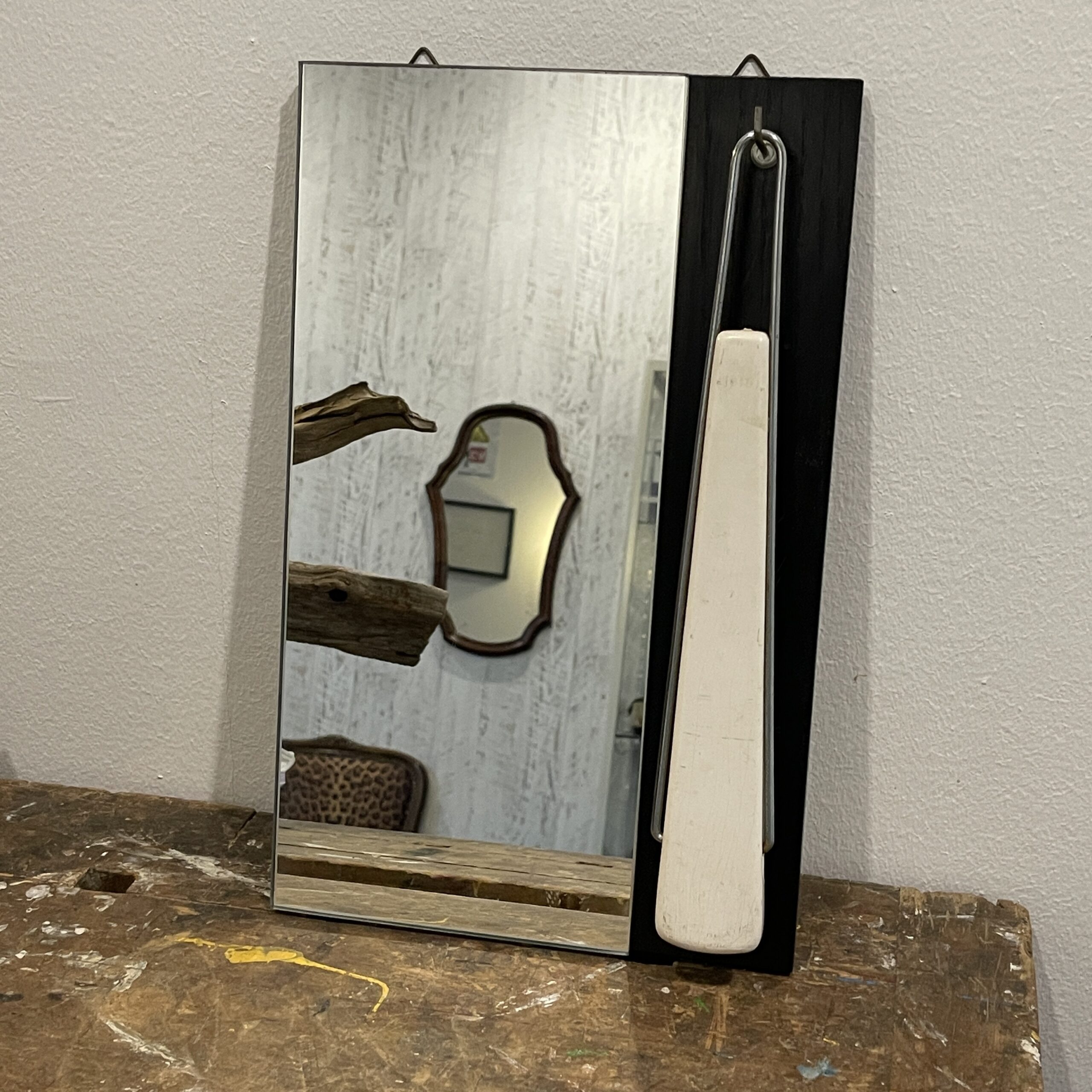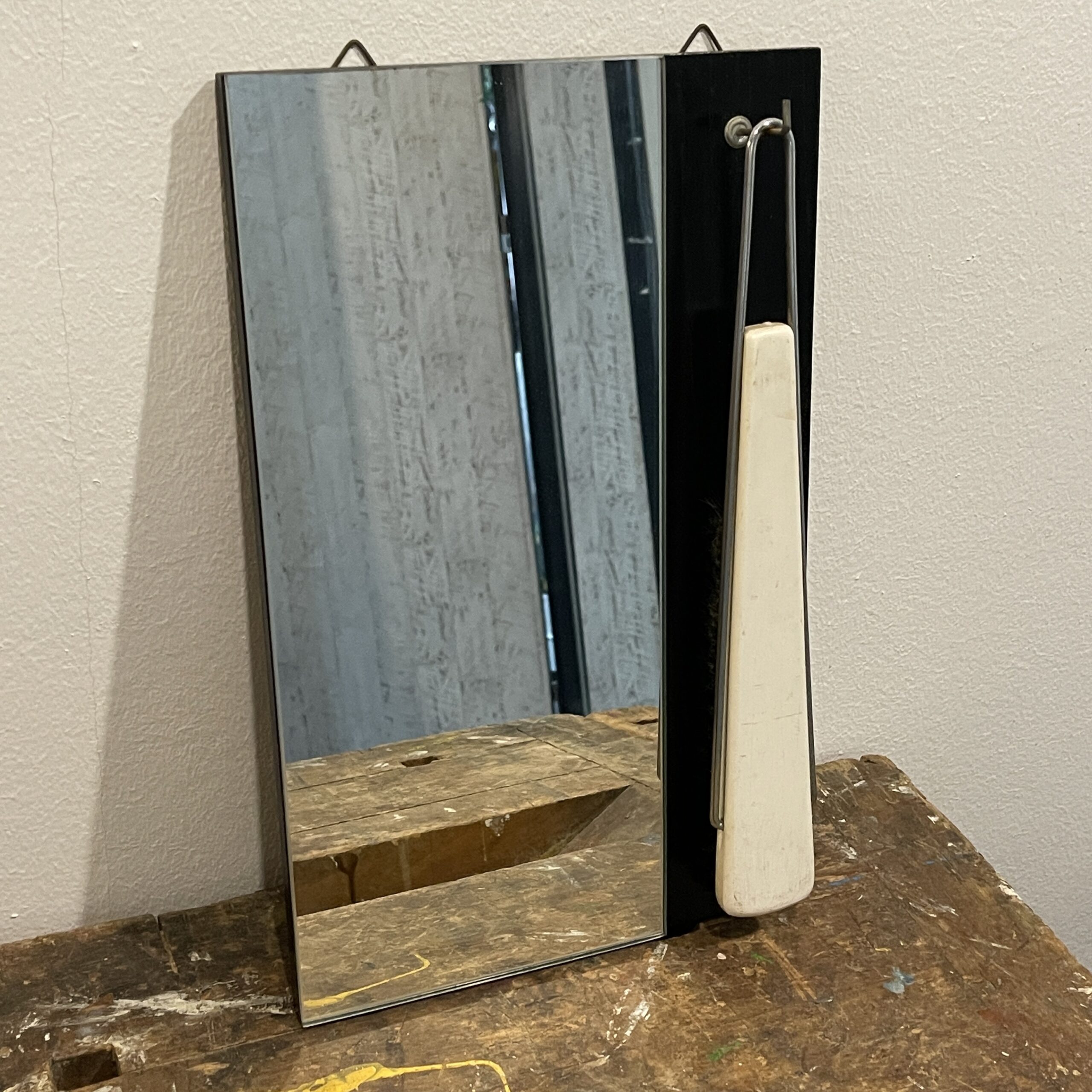 Oeh, hoe leuk deze Two Tone – uitgevoerd in zwart/wit – 80s spiegelset! Met nog de originele borstel. Leuk voor in de gang bijvoorbeeld, even kijken hoe je eruit ziet voor je weggaat.