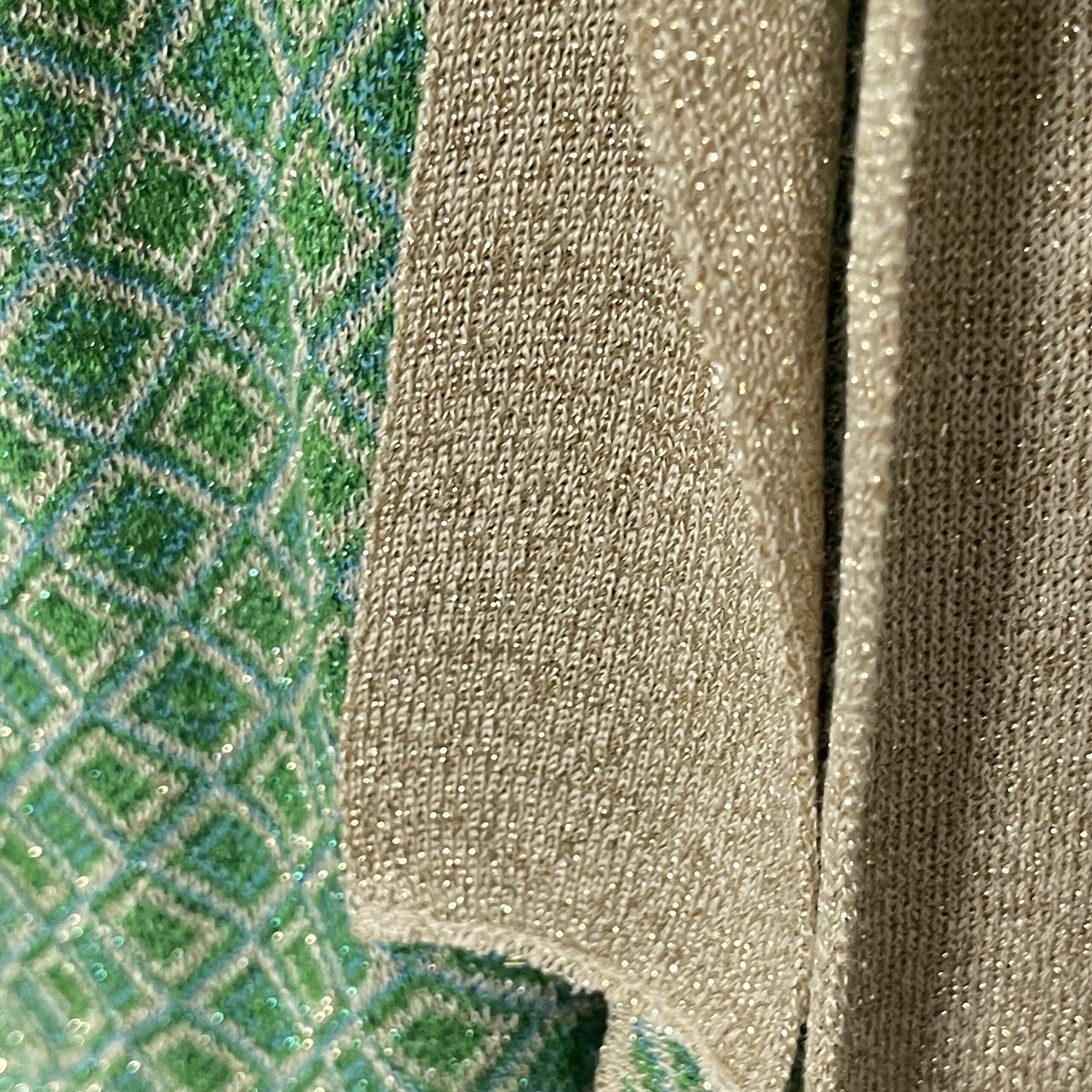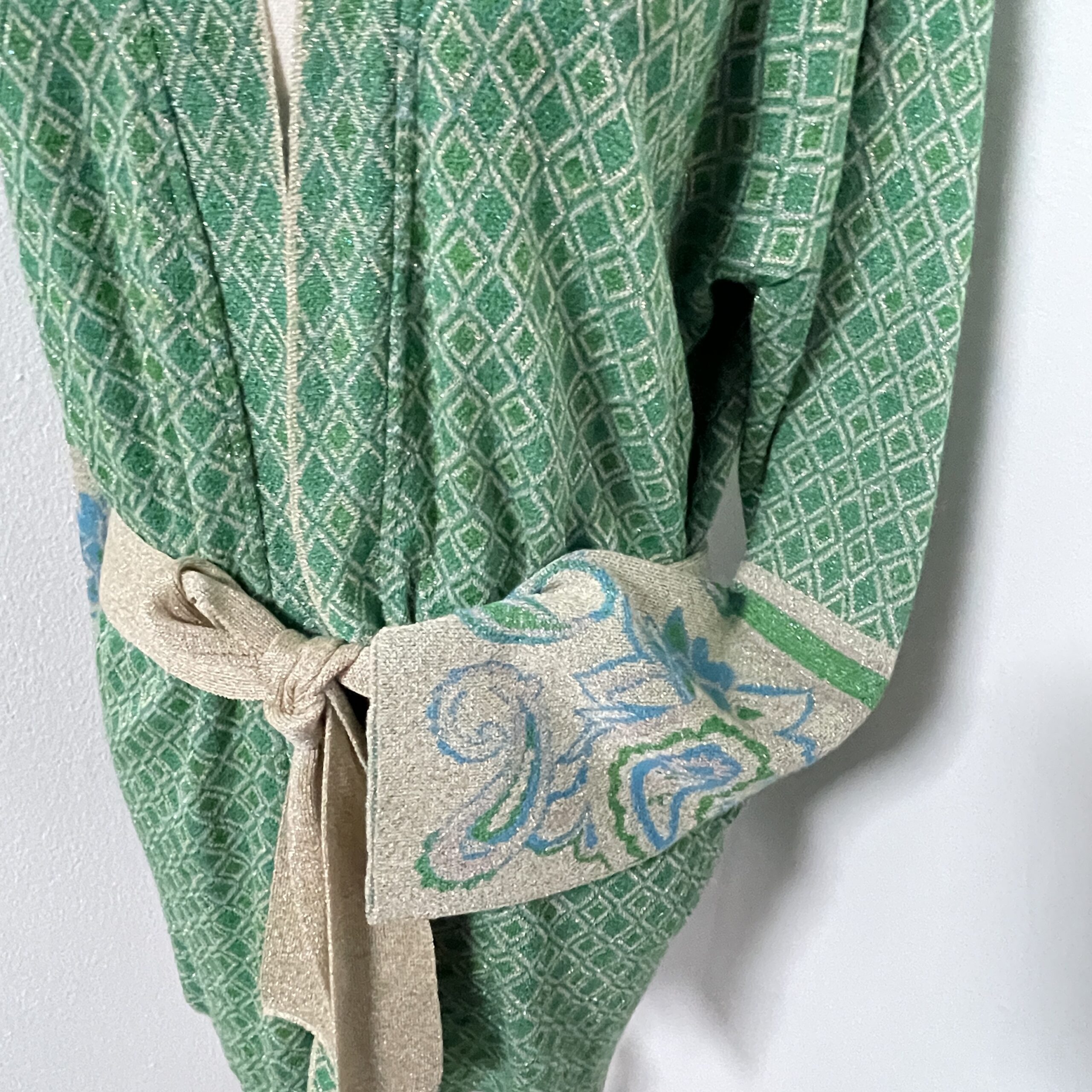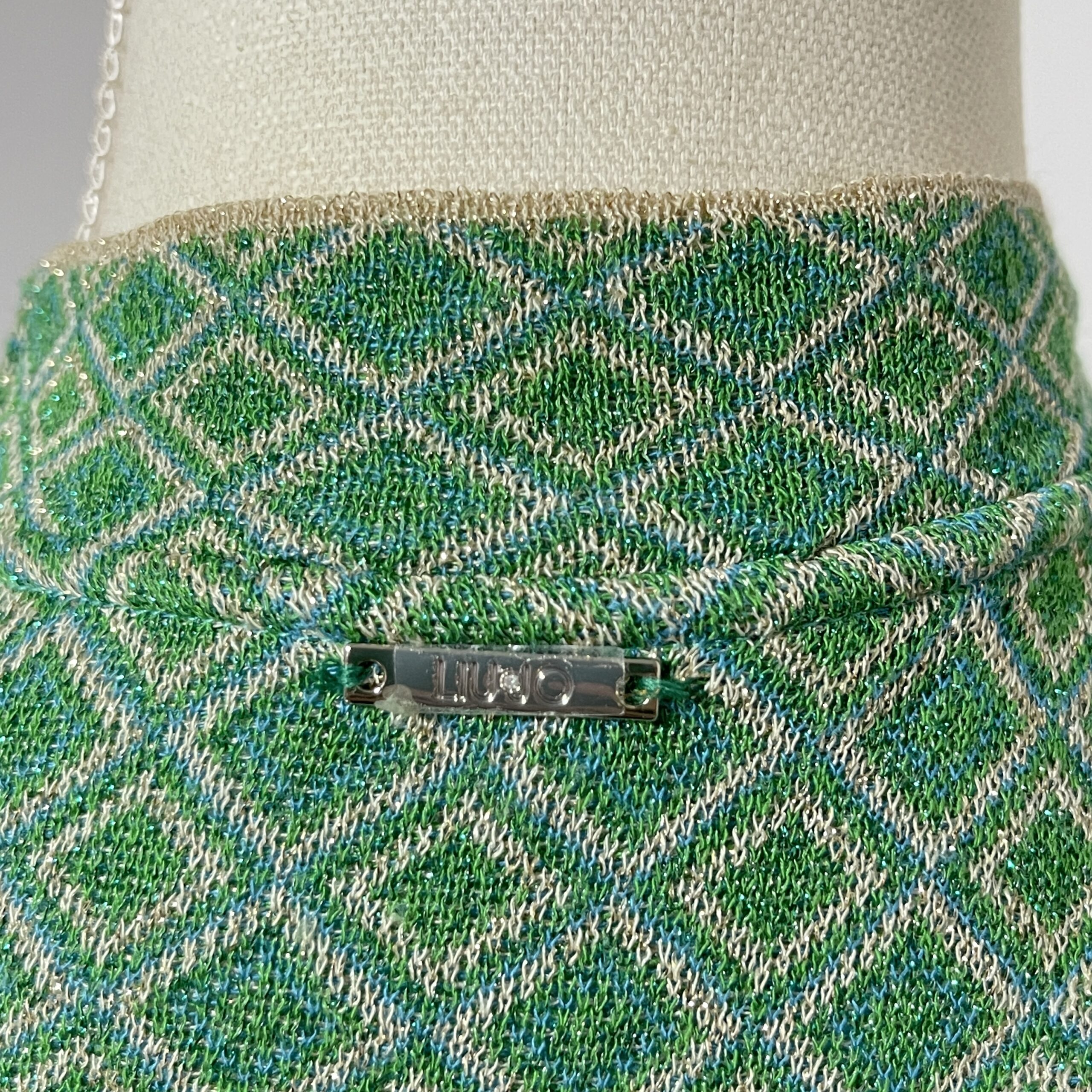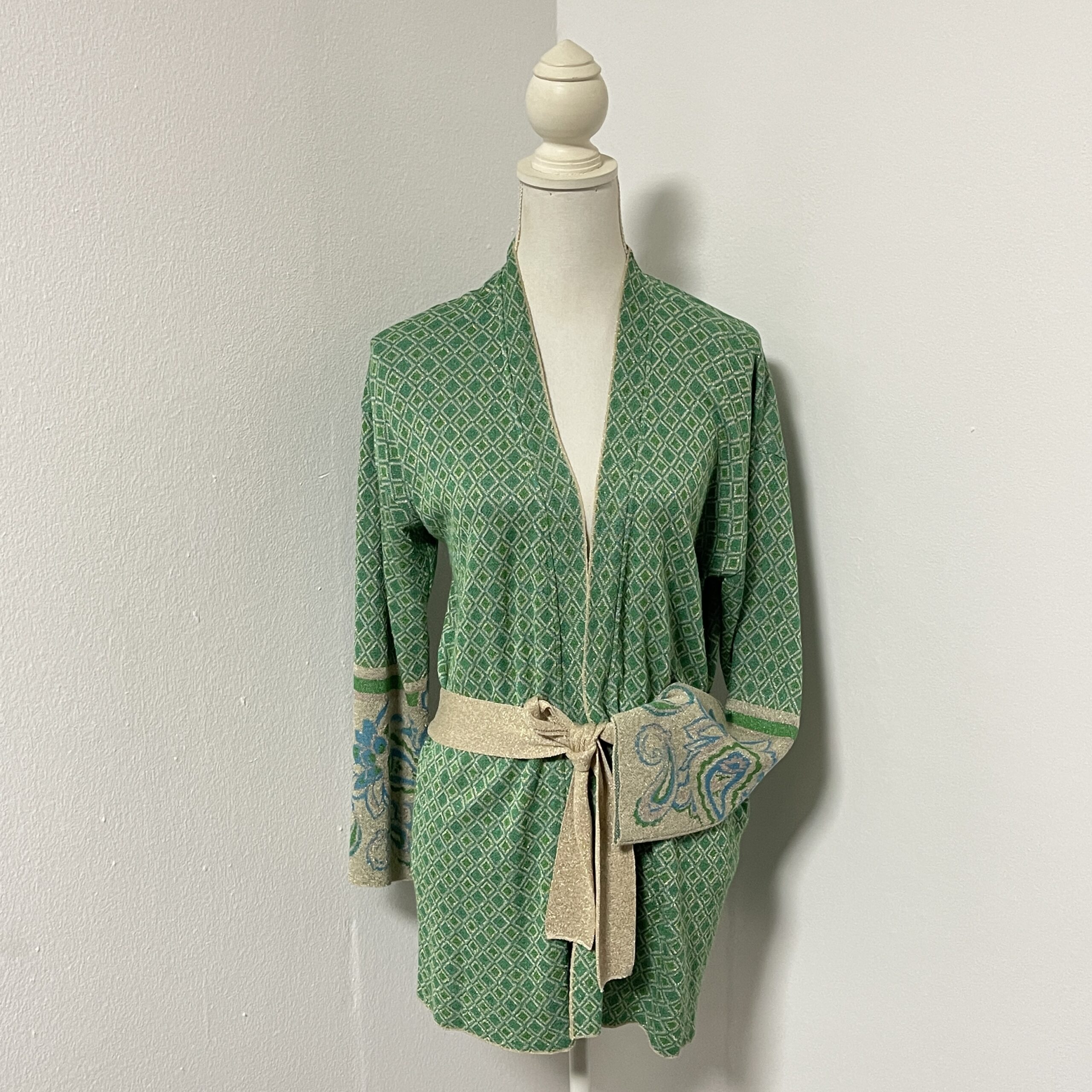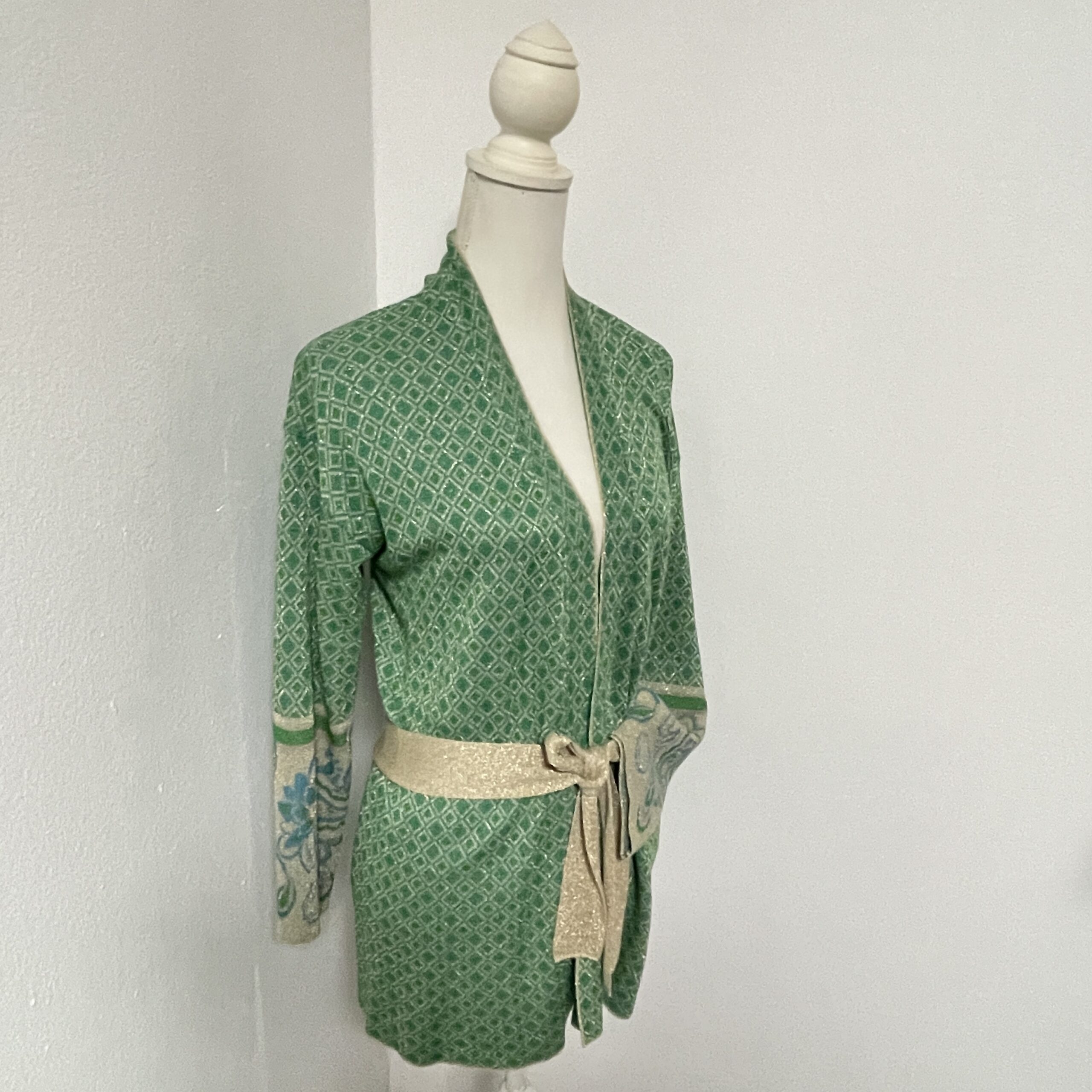 Heel mooi – feestelijk boho – vest van het mooie merk Liu Jo. Het is groen met goud en heeft een klein glittertje. In de zomer leuk over een hemdje, in de winter tof over een (feest)jurkje. Er zit een ceintuur bij in dezelfde stof. Valt heel mooi soepel om het lijf en draagt daardoor dus ook heel lekker!