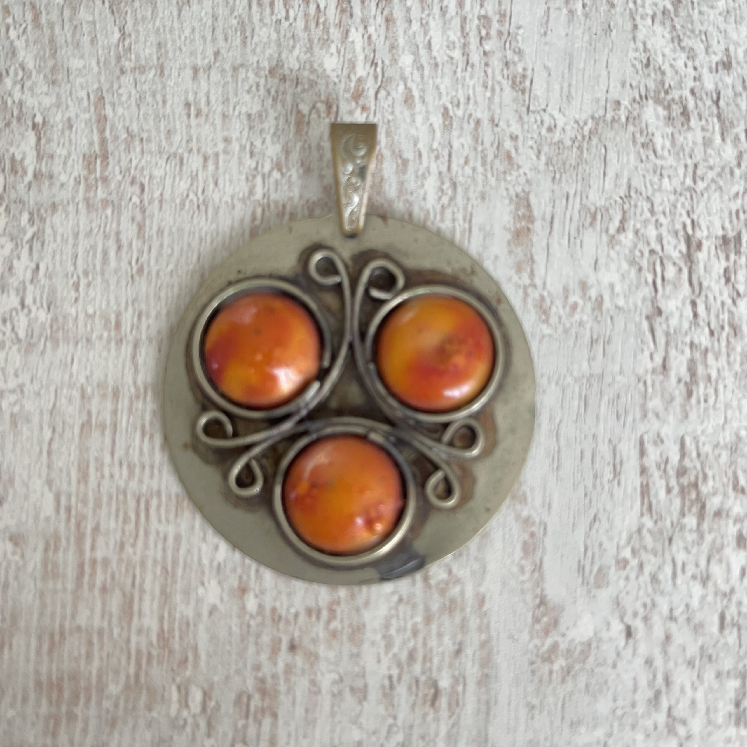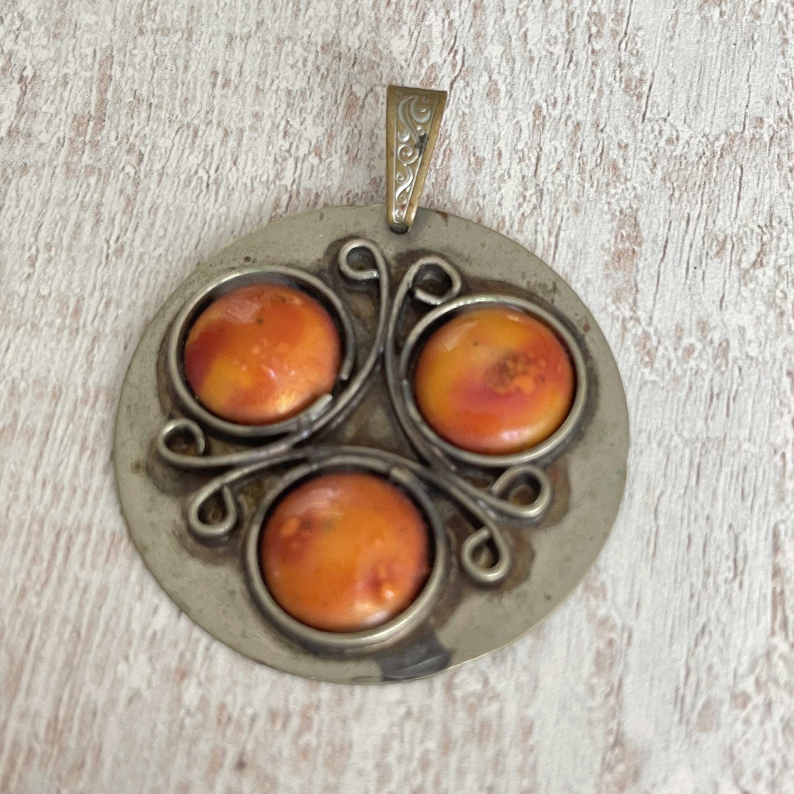 ‘Come on.. do the hippy hippy shake…’ … met deze boho vintage kettinghanger uit de jaren 70. Je weet wel, de tijd van The Doors en van de film Almost Famous. Deze unieke Hager is voorzien van 3 ‘stenen’ in geblakerd oranje, vastgezet in een metalen hanger met versiersels. Stoer en sierlijk.