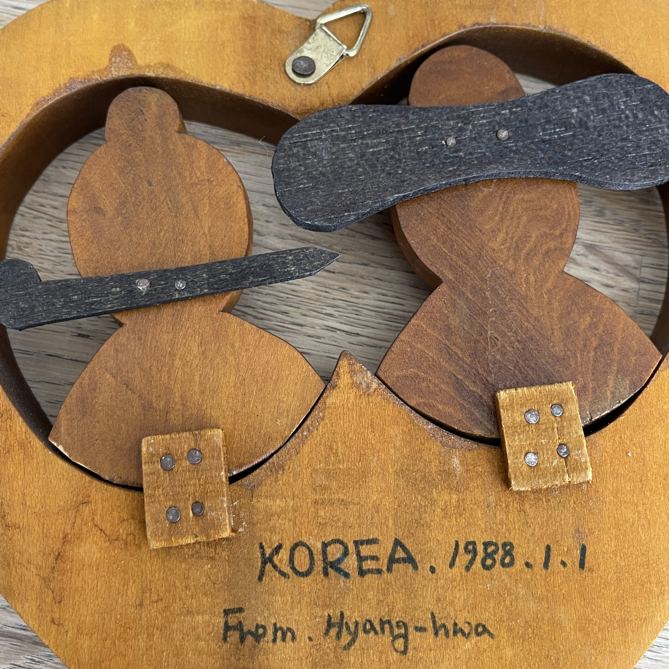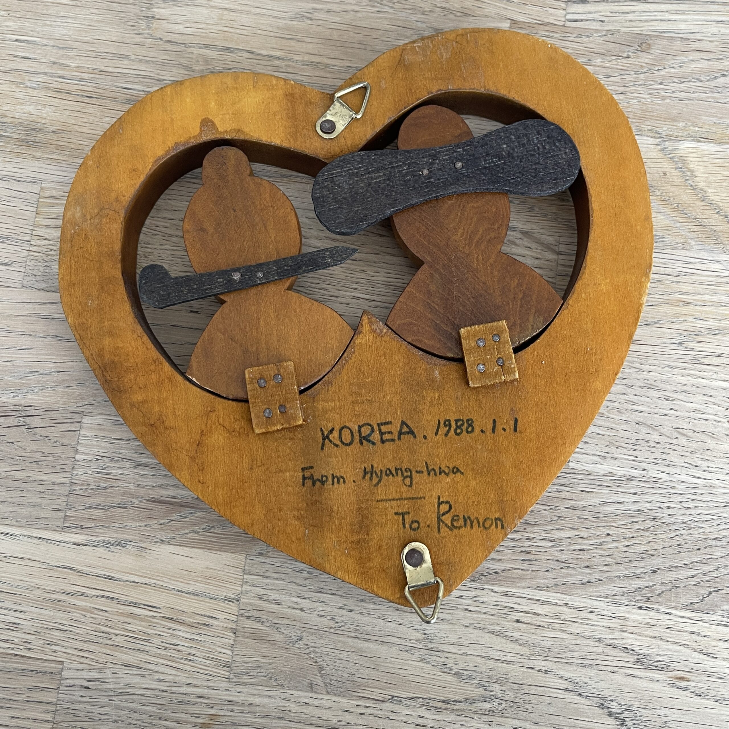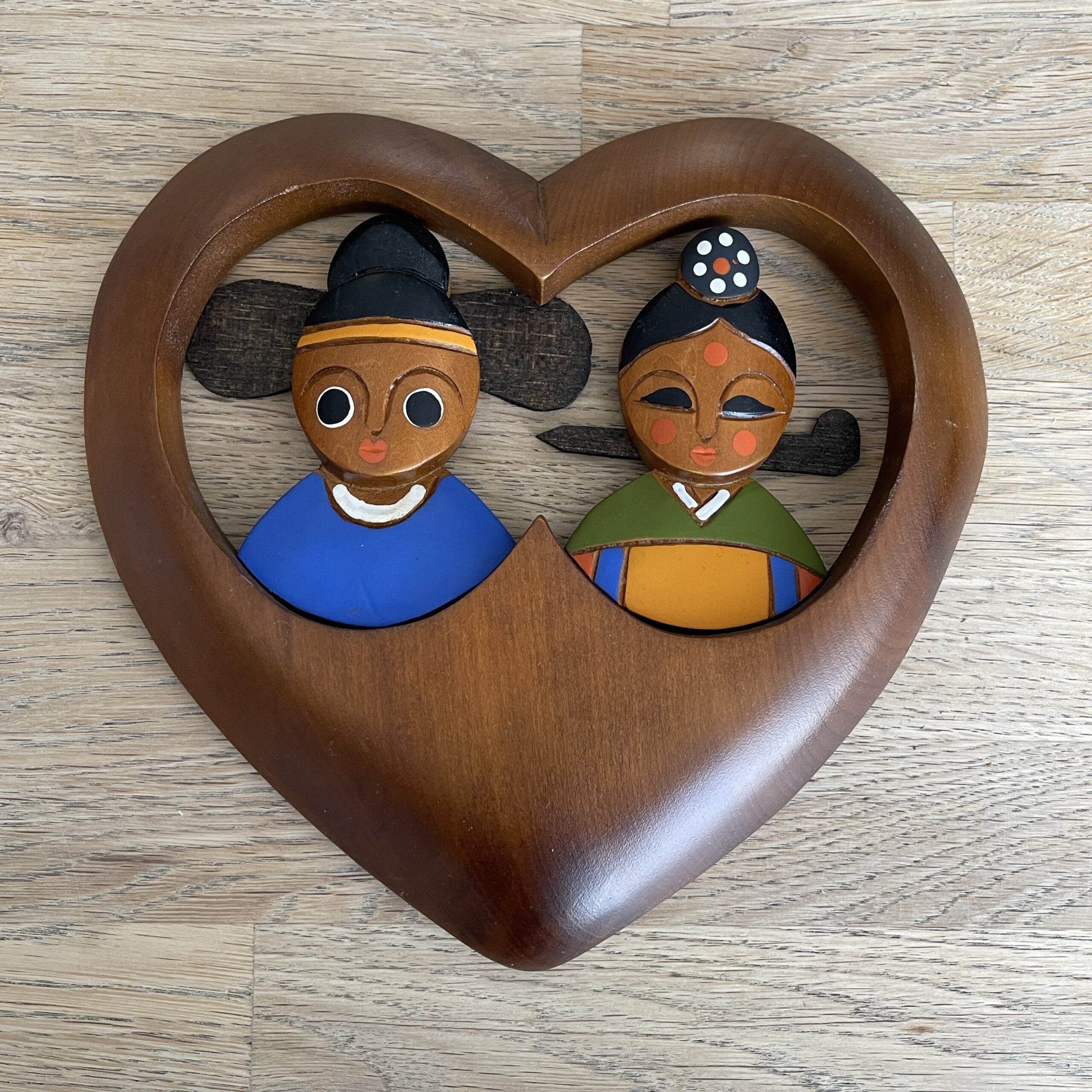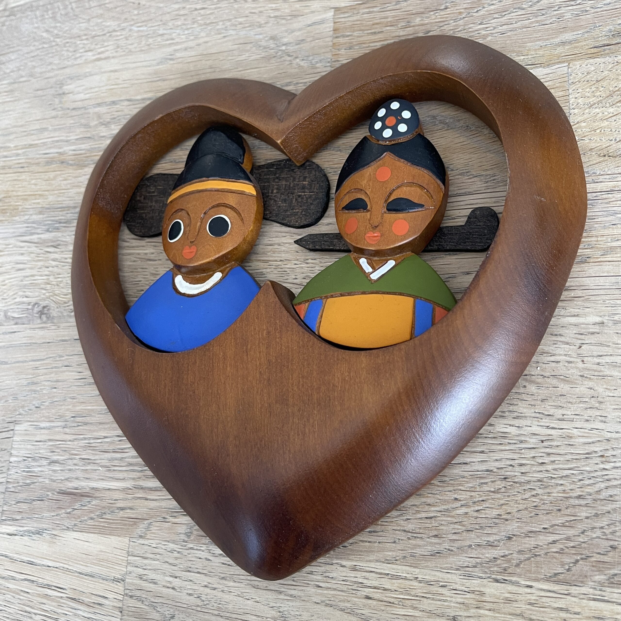 Schattig vintage hart van hout, waarschijnlijk teakhout met een leuk Oosters stelletje. Leuk cadeautje om de liefde te vieren bijvoorbeeld! Je kunt het hart ophangen aan de muur. Aan de achterkant staan nog een boodschap van iemand uit de 80s, zo leuk! Waar zou dit hart gemaakt zijn, waar zou het gehangen hebben, wat heeft ze allemaal meegemaakt? Wij houden daarvan!