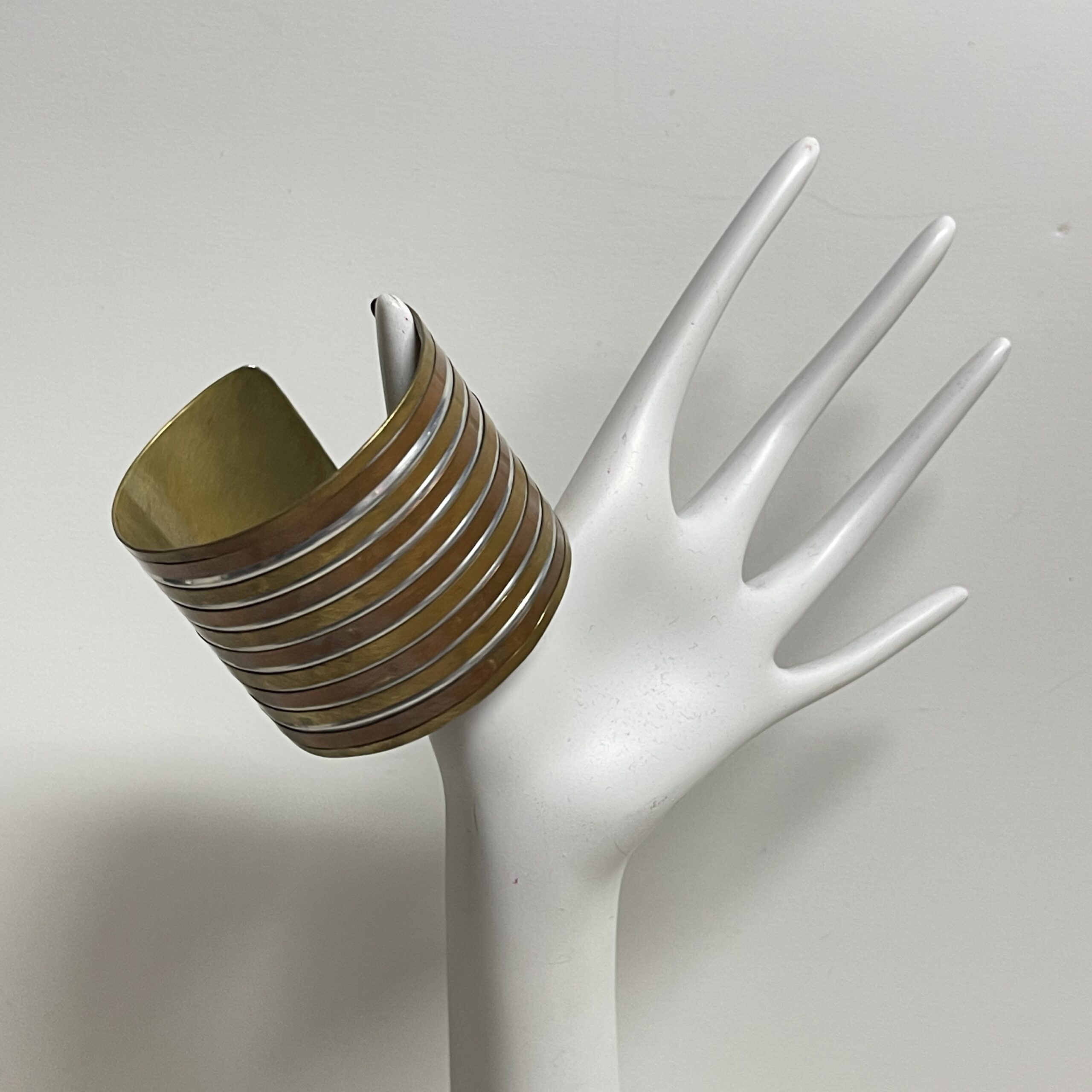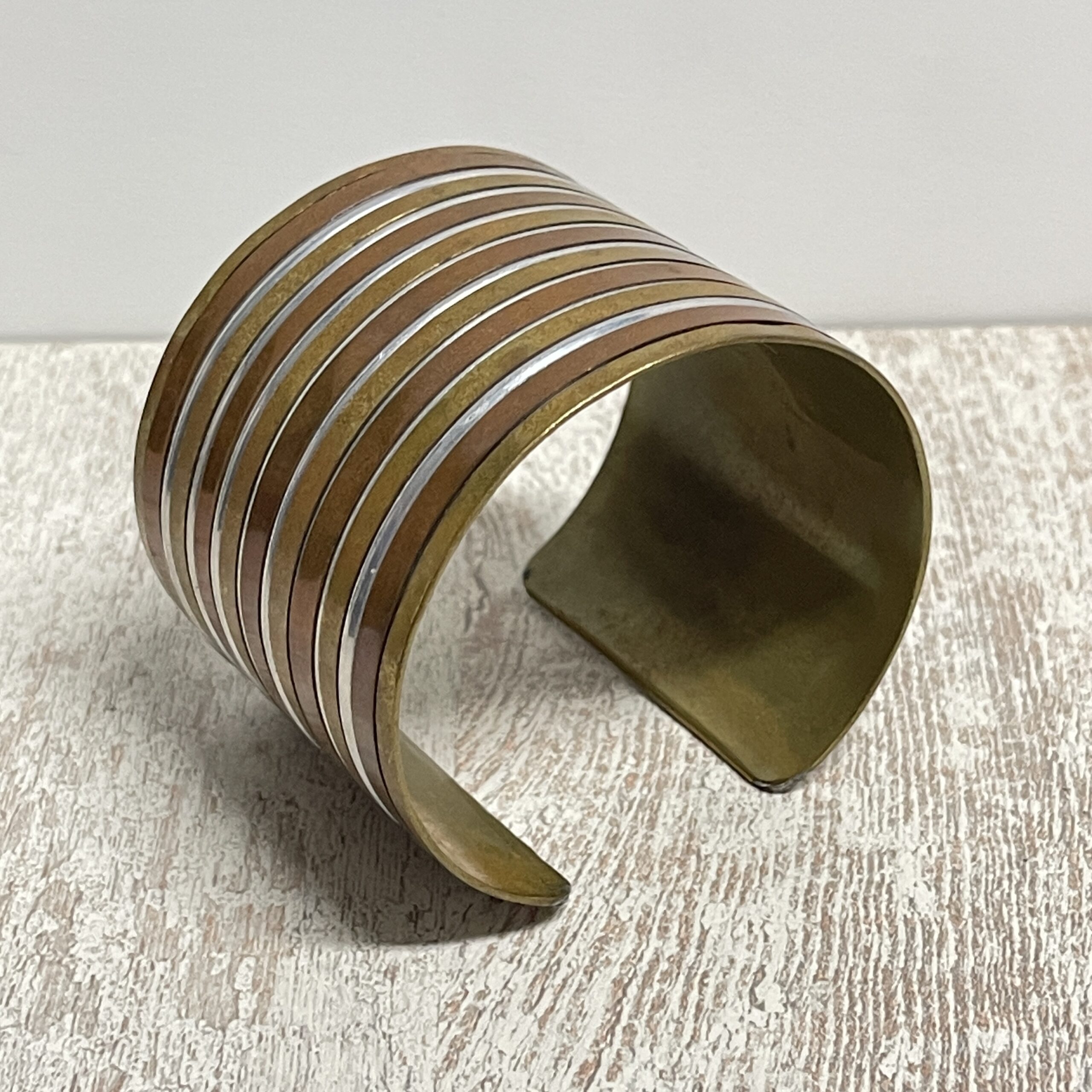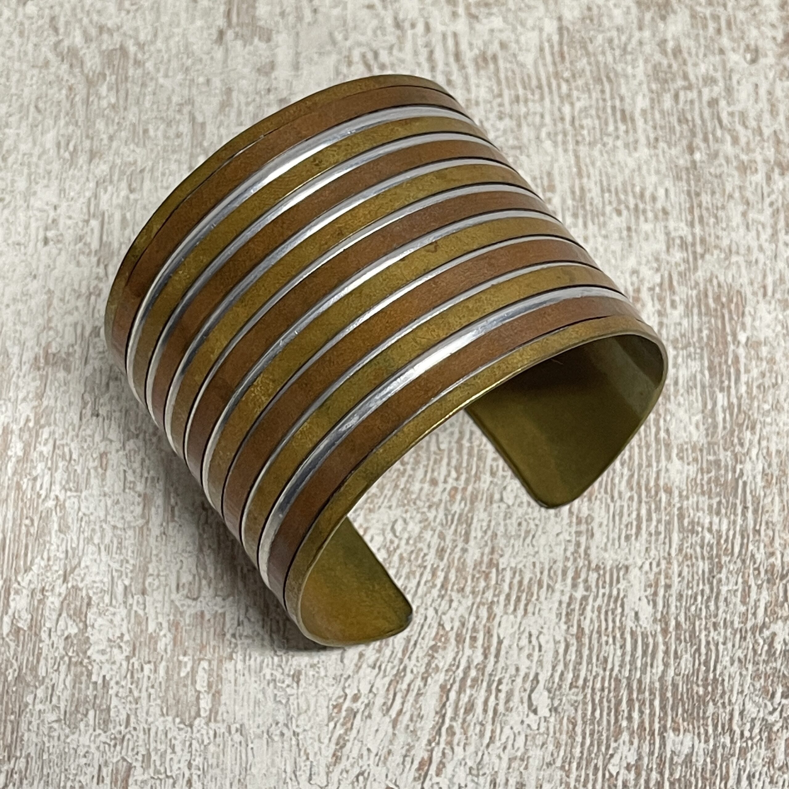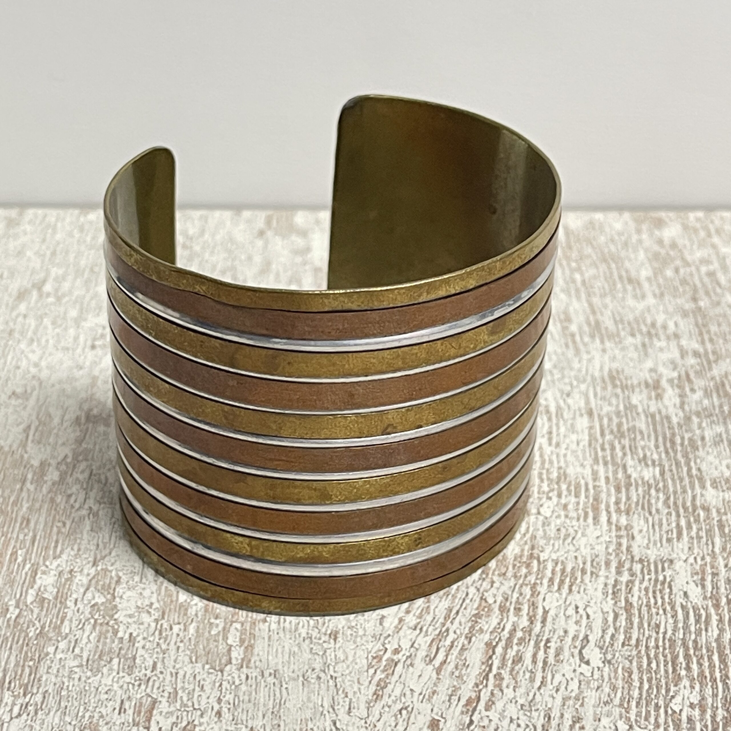 Mooie stoere boho armband uitgevoerd in meerdere kleuren messing. Een breed formaat, je klemt ‘m zo om je arm. Maar je kunt ‘m natuurlijk ook ‘losjes’ om de pols dragen.