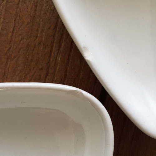 Het is waarschijnlijk van Goedewaagen of Huizen Driehoek, maar de stickertjes zitten er niet meer op. Die werden er meestal ook afgehaald. Helaas twee chipjes bij twee schaaltjes, verder mooie staat.