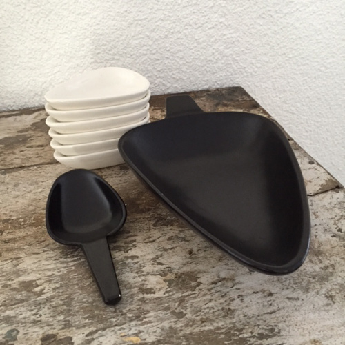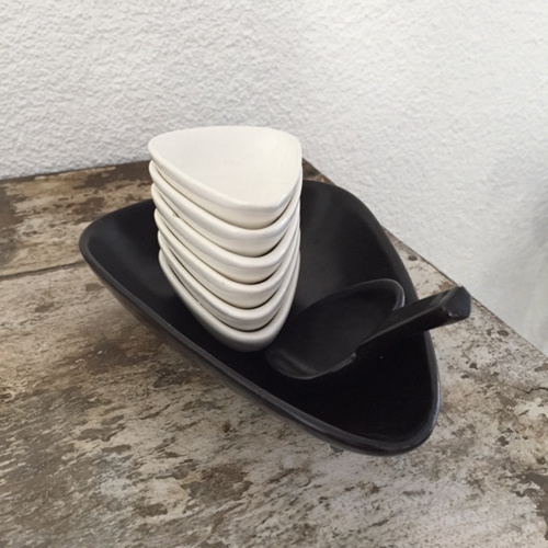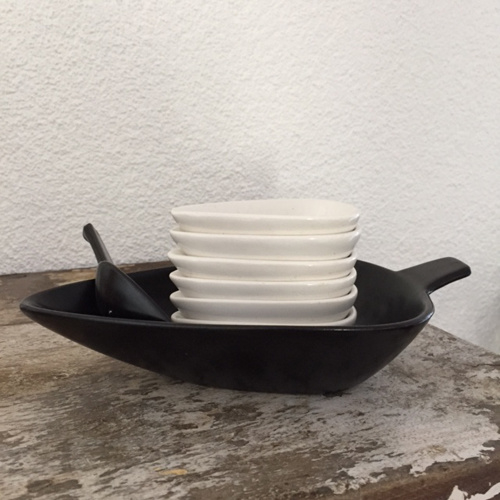 Mooi pindastel in mat glazuur uitgevoerd in zwart en wit, inclusief bijbehorende lepel en die ontbreken juist vaak. Natuurlijk is dit setje ook leuk om te gebruiken voor sushi of lekkere tapas bijvoorbeeld, of om er mooie steentjes in uit te stallen. Hoe leuk is het om dit setje tijdens een verjaardag of een borrel tevoorschijn te toveren en er lekker nootjes uit te knabbelen…?