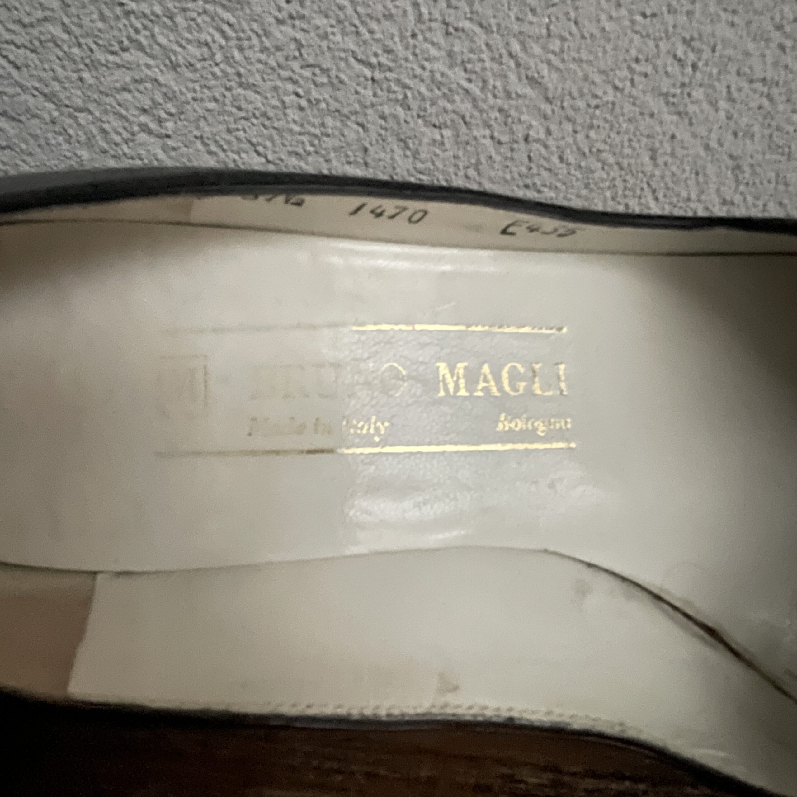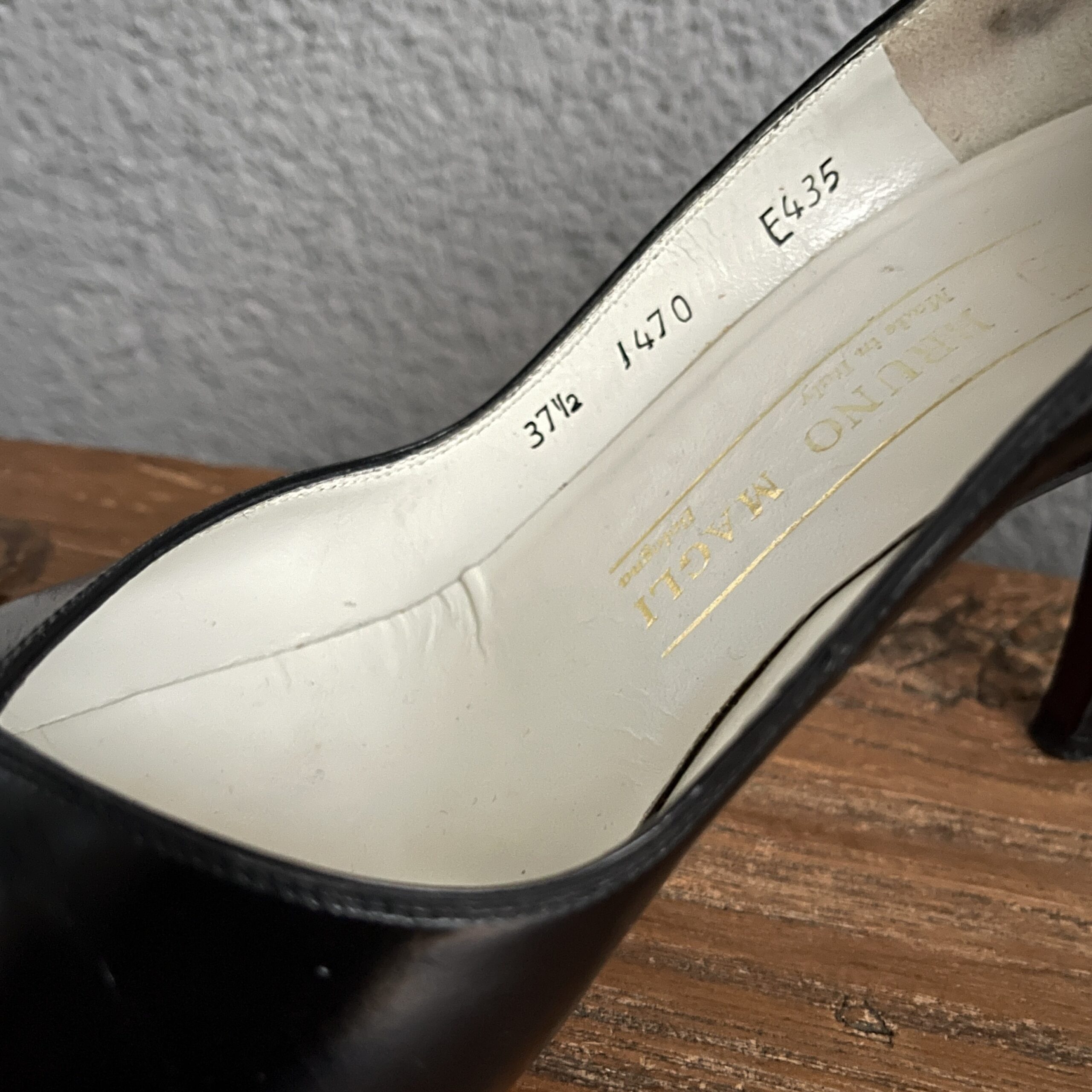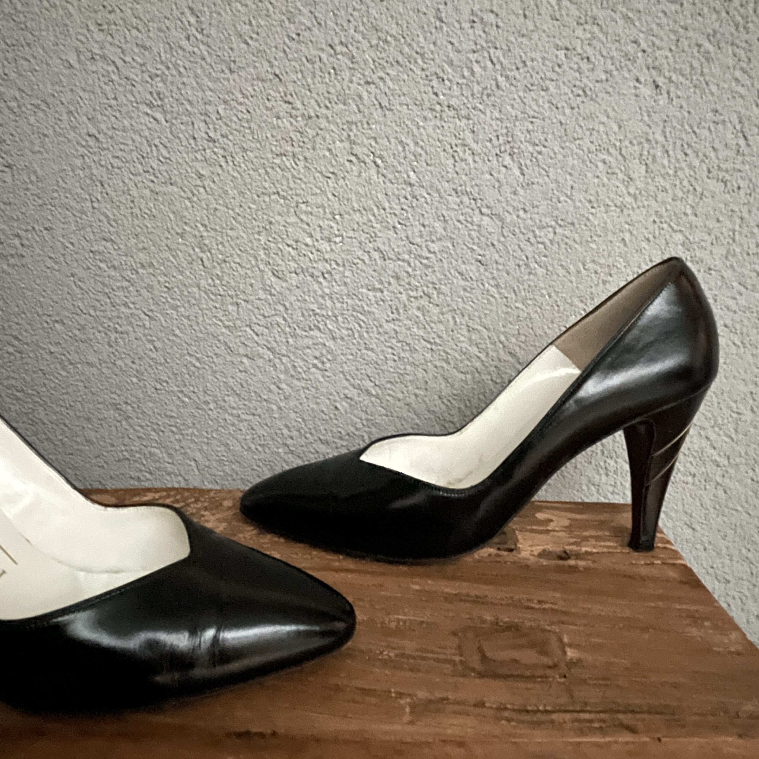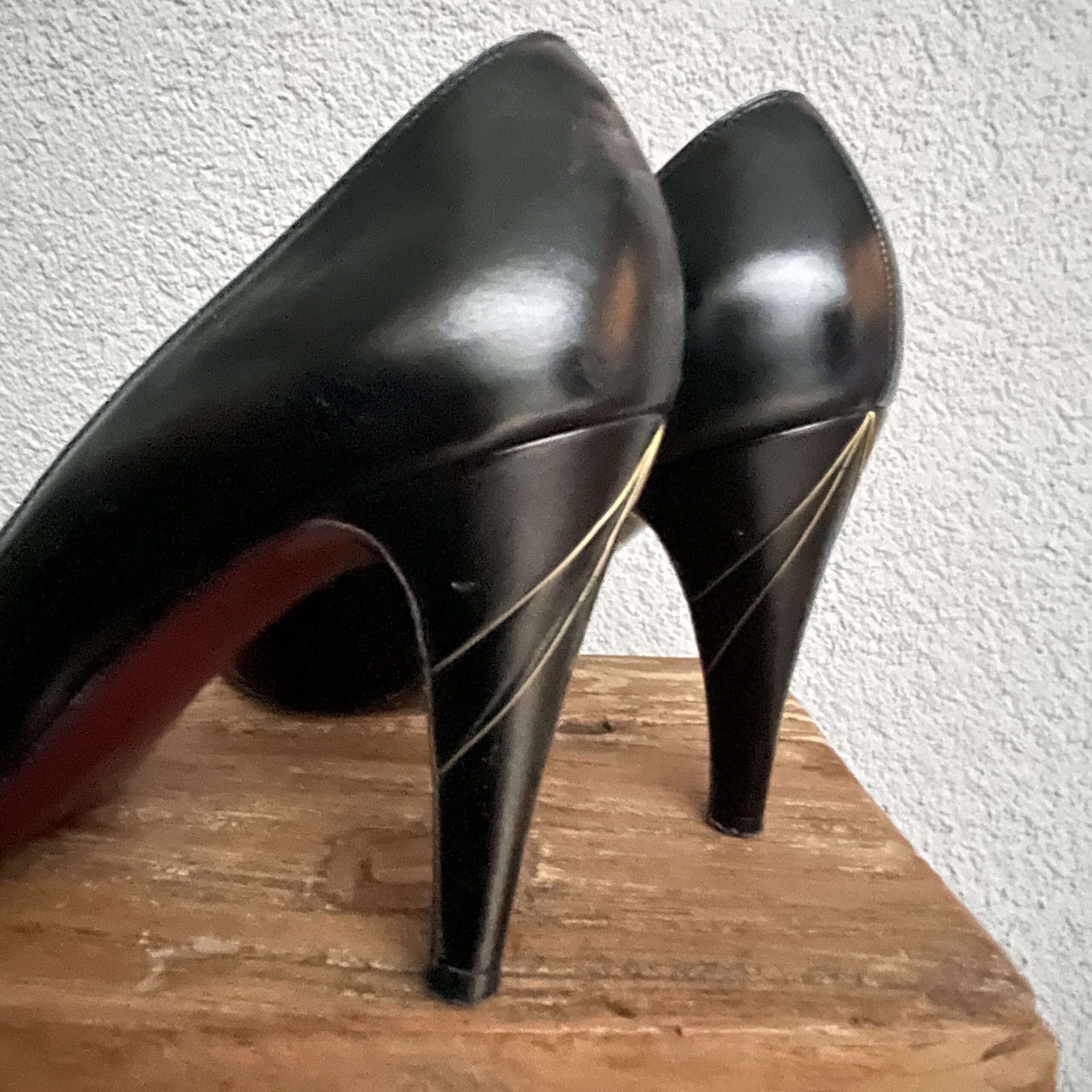 De details van deze vintage Bruno Magli pumps zijn om te watertanden. Een subtiel gouden randje dat gedrapeerd is om de hak. Mooi!!!