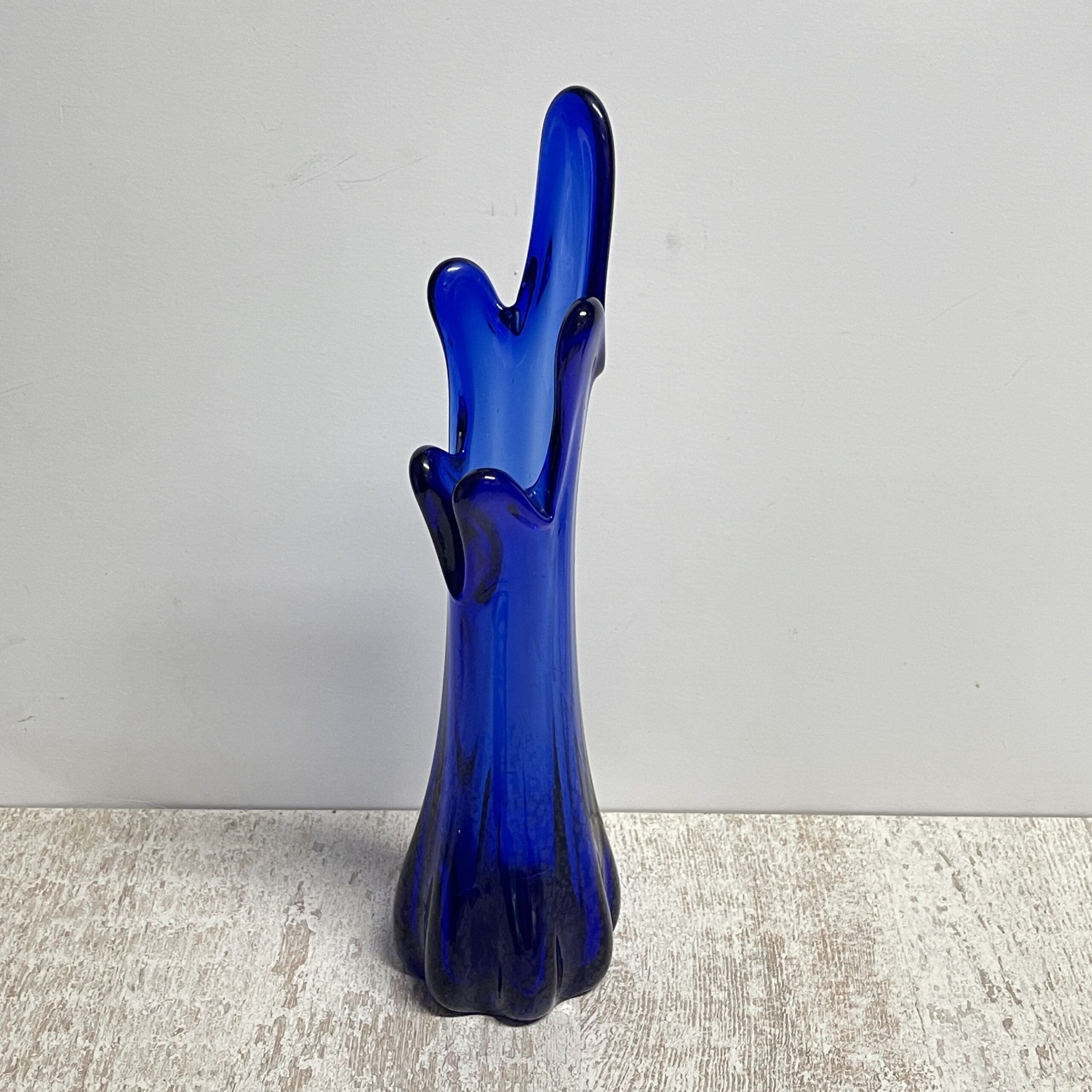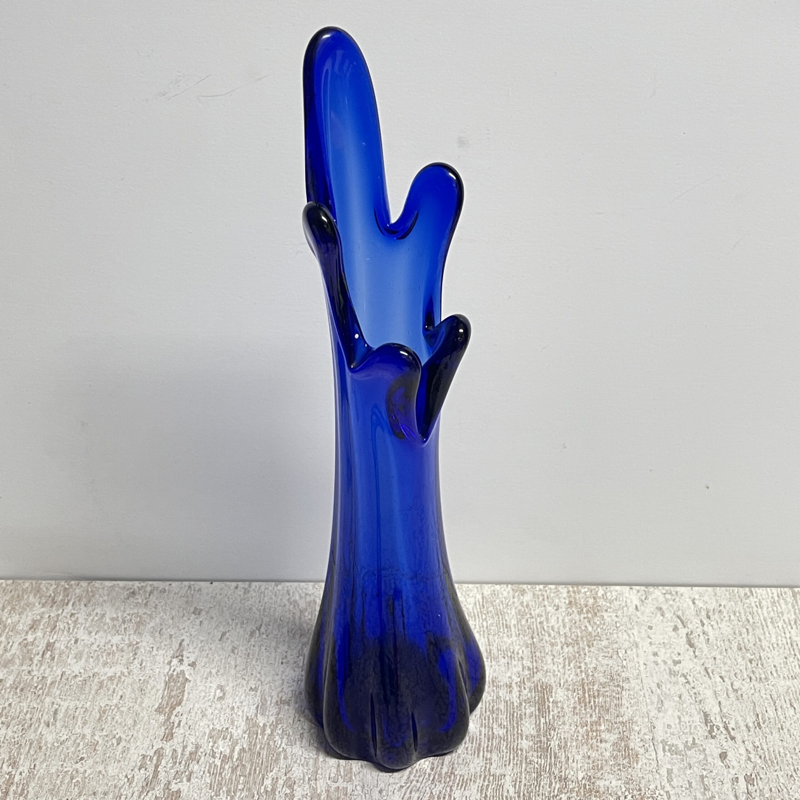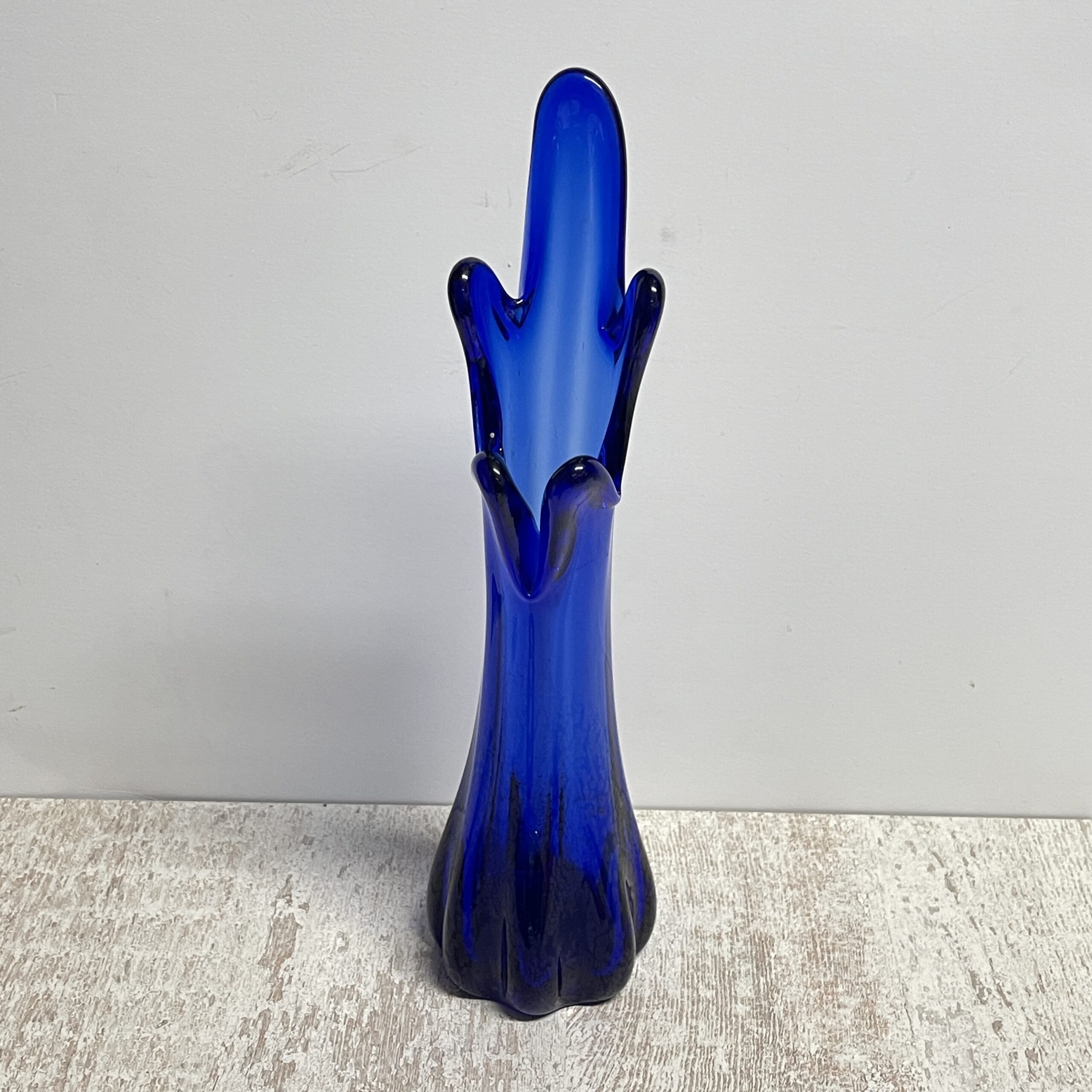 Kobaltblauw is weer helemaal terug, maar in de tijd dat deze bijzondere glazen vaas gemaakt werd was de kleur ook je van het! Deze kobaltblauwe glazen vaas wordt ook wel Swung genoemd naar ons is verteld. Omdat hij ‘golft’ aan de bovenkant, net als het golven van de zee. Maar je ziet ‘m ook wel langskomen onder de naam ‘5-vinger vaasje’.. tel maar mee!