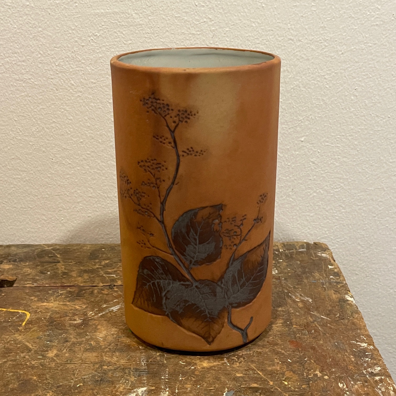 Een hele bijzondere vintage vaas van keramiek met een botanische imprint. De patronen zijn er als het ware ingedrukt met de hand. De bladeren, bloemen en taken worden met de hand in het klei gedrukt en geperst. Daarna pas wordt de vaas afgebakken. Een heuse one of a kind dus!