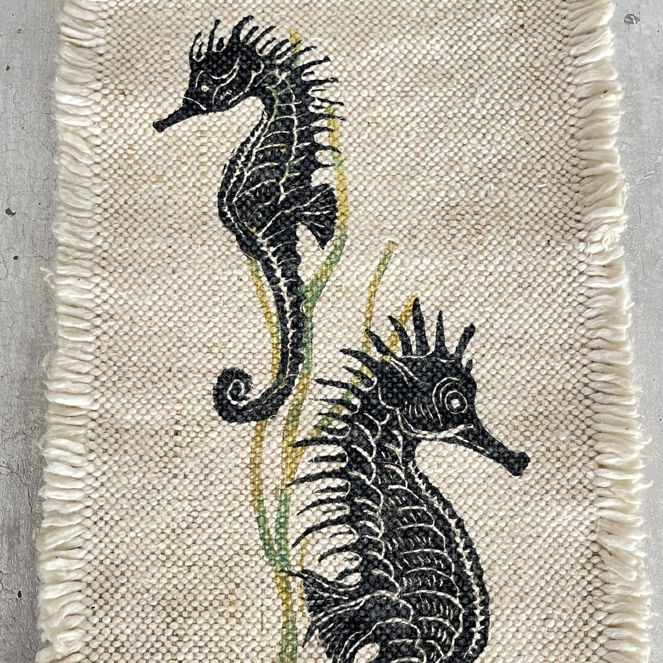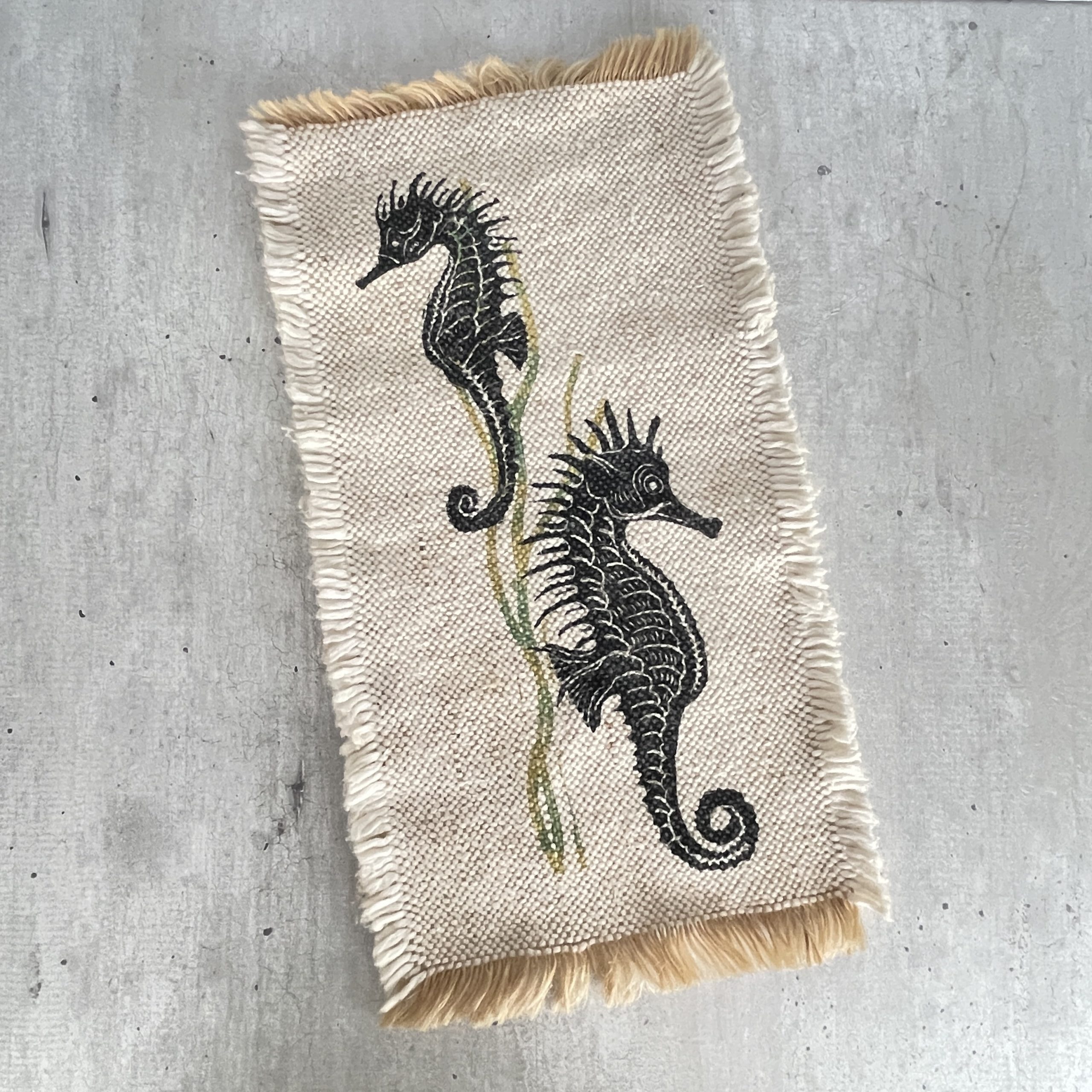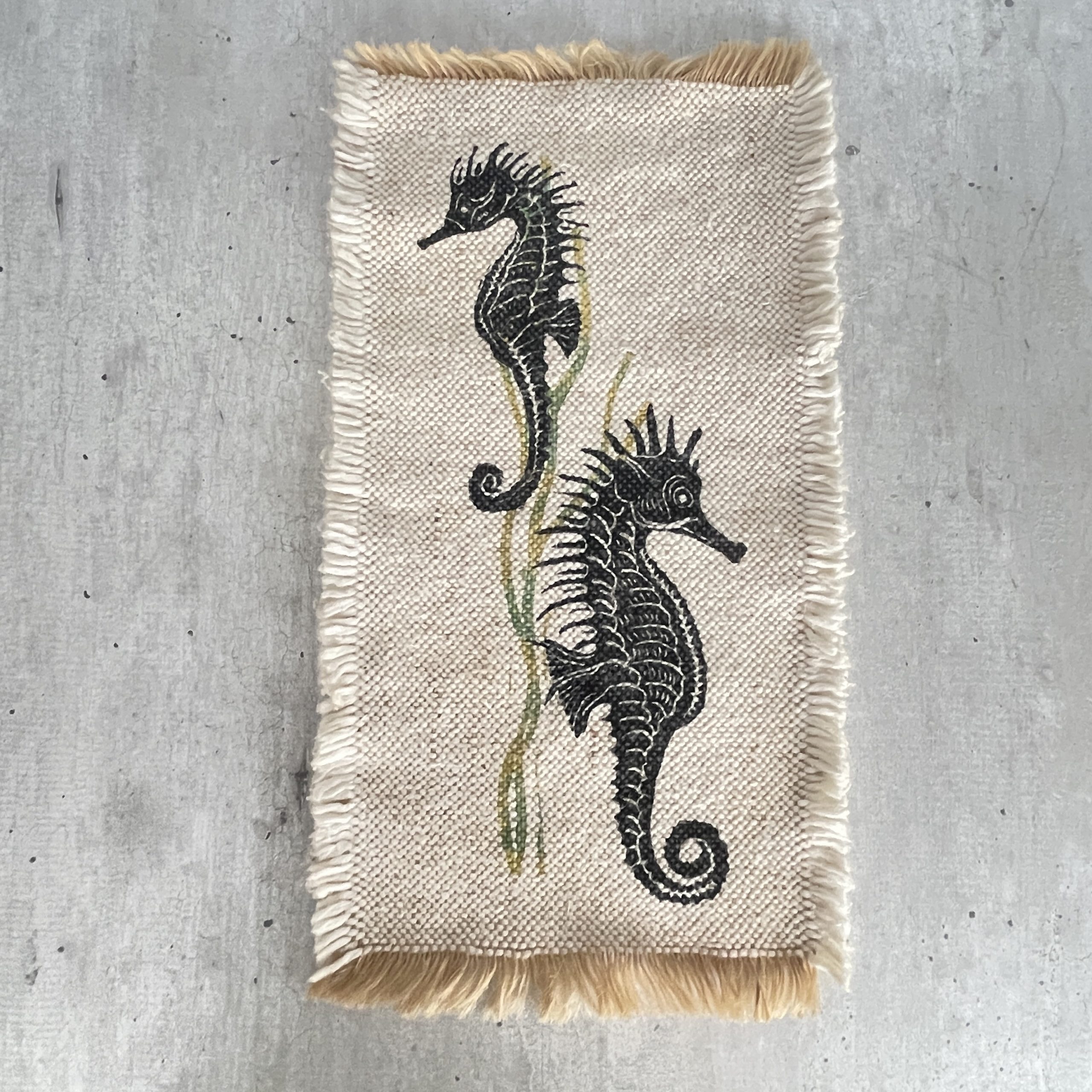 Dit wandkleedje met zeepaardjes is nou echt zo’n origineel seventies dingetje. Toendertijd was macrame hip, maar ook wandkleden en dergelijken van stof, vaak zelf geweven en bedrukt. Zoals deze met zeepaardjes, die je overigens ook veel terug zag in die tijd, bijvoorbeeld in keramiek.