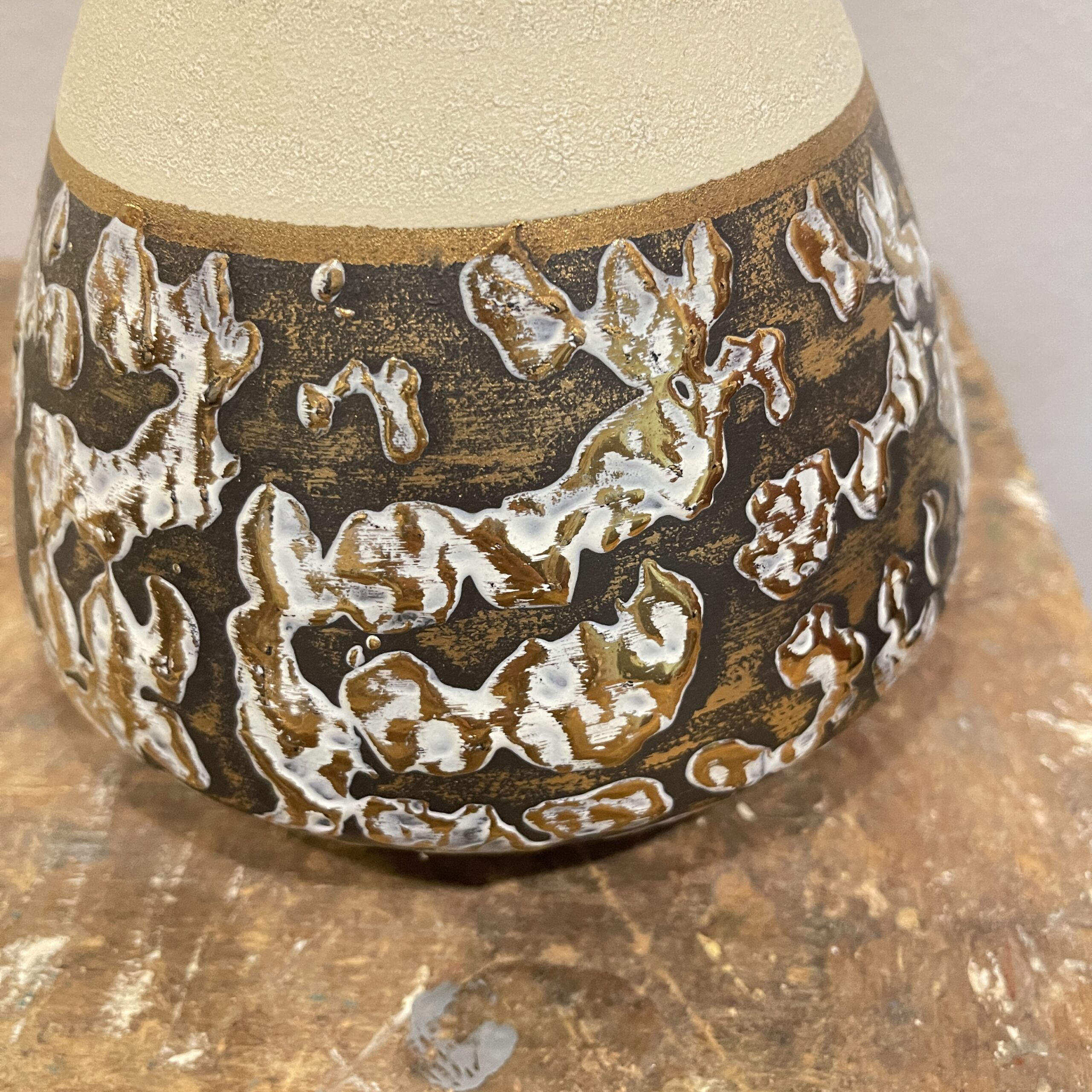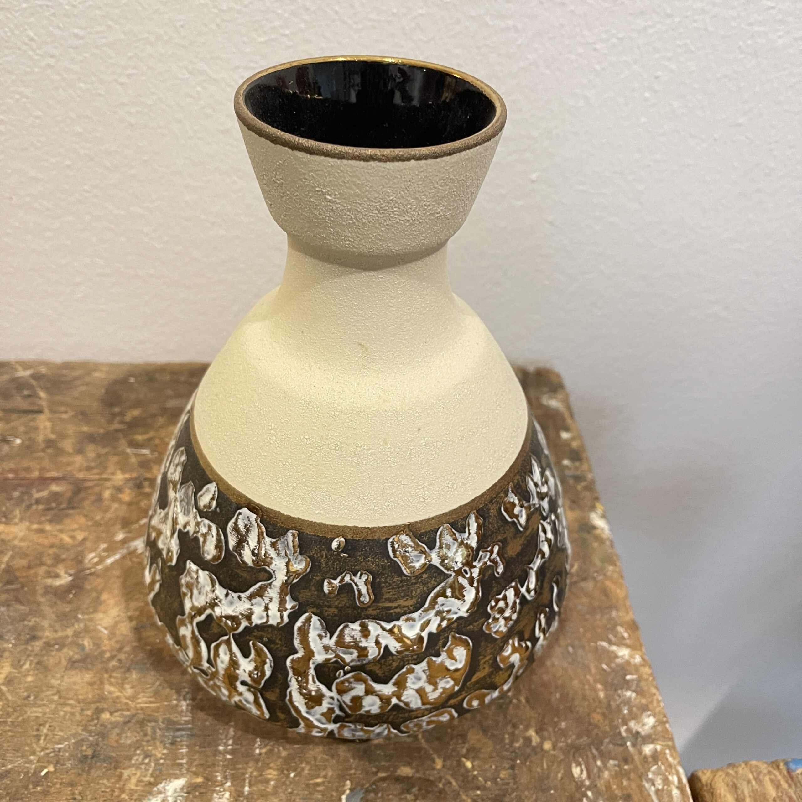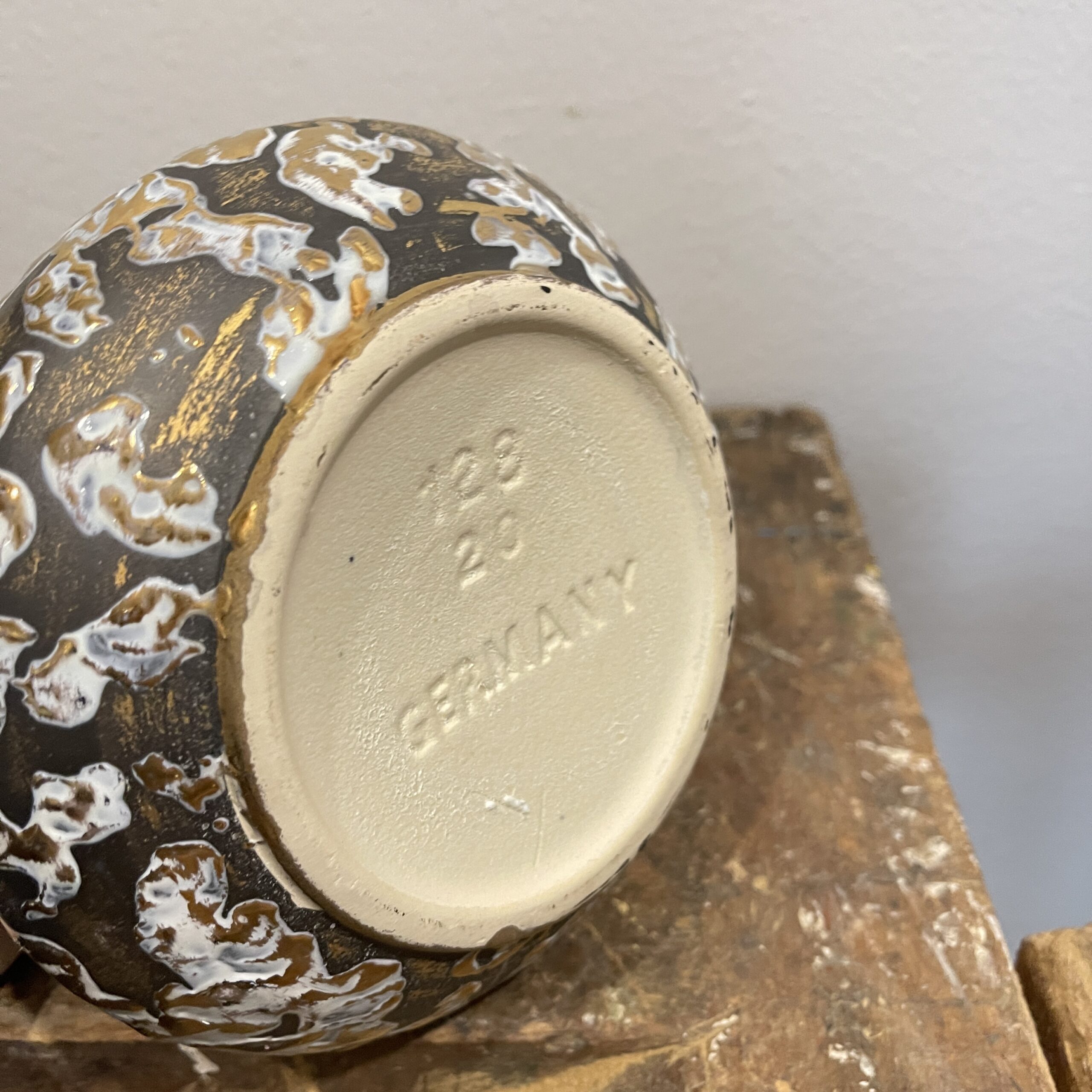 Zeer mooie West Germany vaas uitgevoerd in mat keramiek met glanzende (gouden) details. Een beauty die je tegemoet straalt! Gemerkt aan de onderkant.