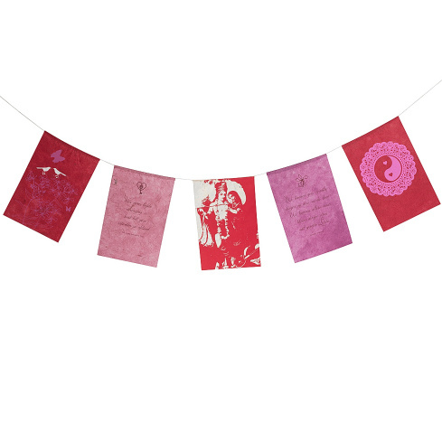 Deze vlaggetjes zijn fairtrade geproduceerd van handgeschept papier. De set bestaat uit een vlaggetjessnoer van 5 vlaggetjes, een envelop en een los velletje handgeschept papier voor een persoonlijke boodschap.